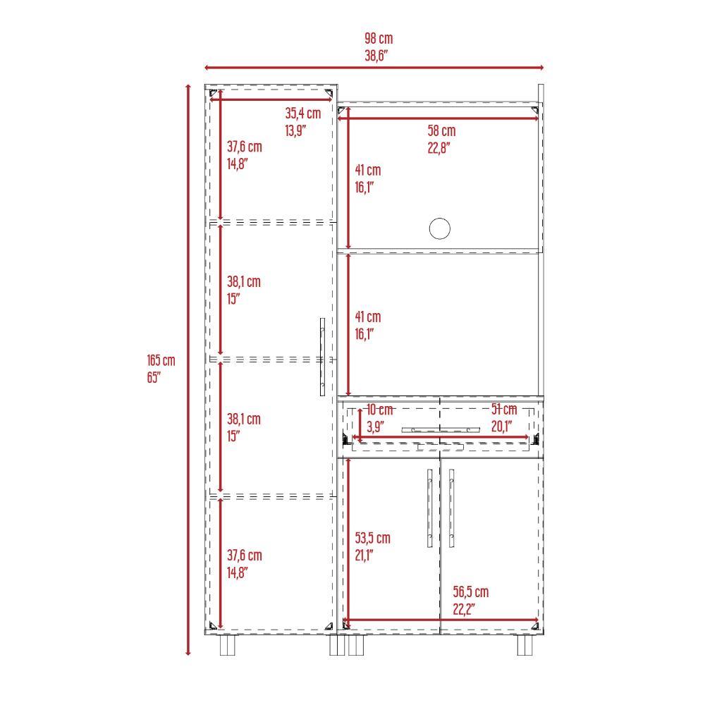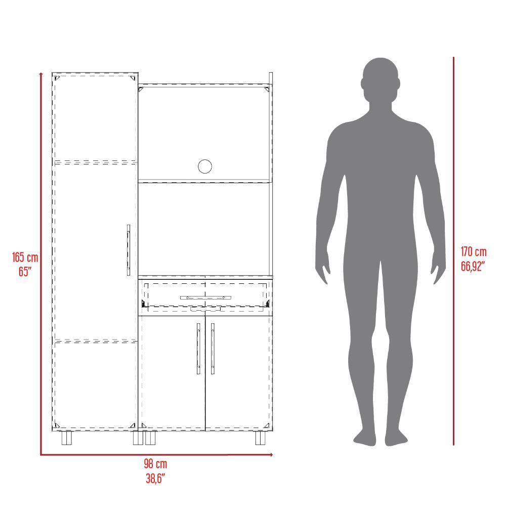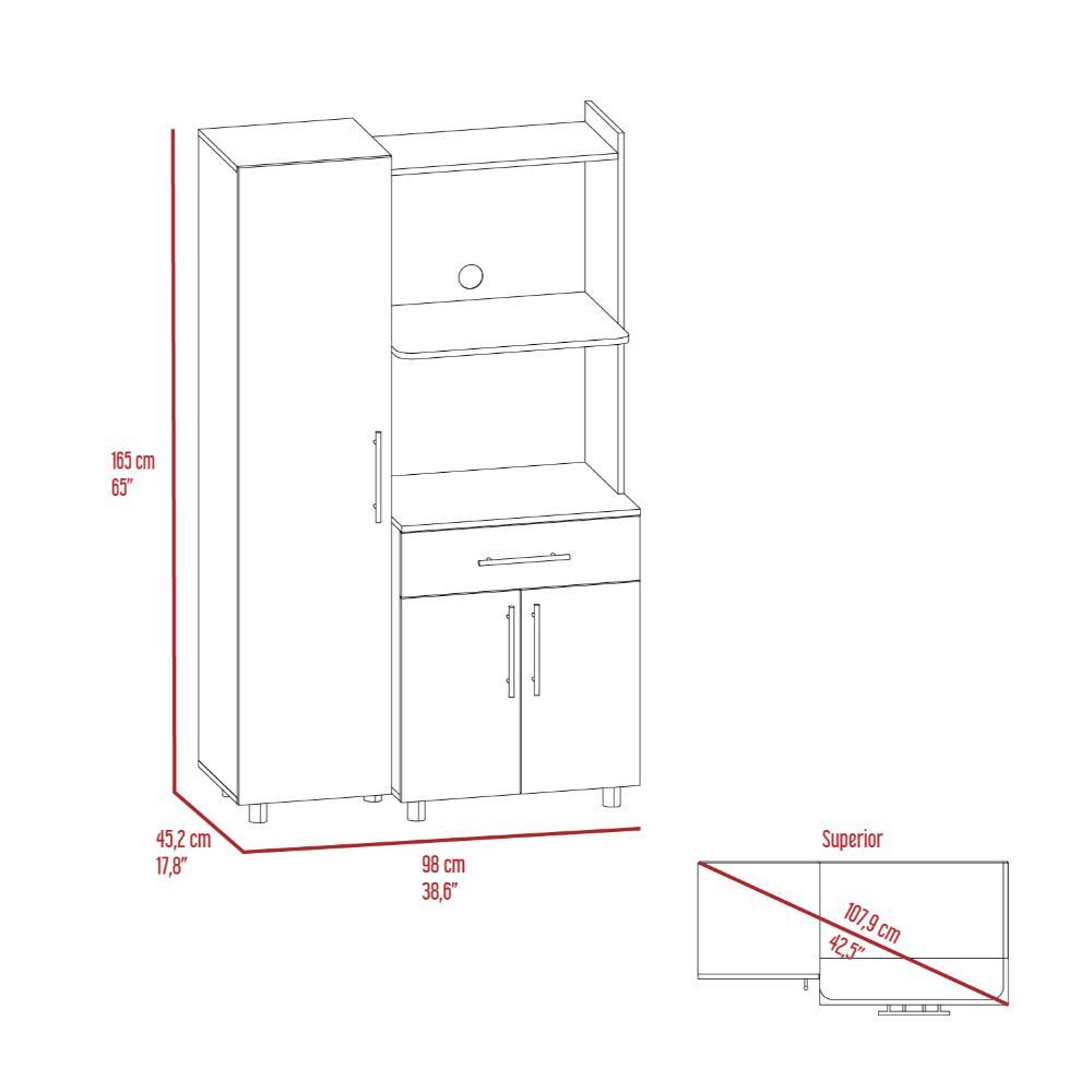 Alacena, con amplios espacios para almacenamiento, patas y manijas metálicas, espacio para microondas puertas abatibles y un cajón.