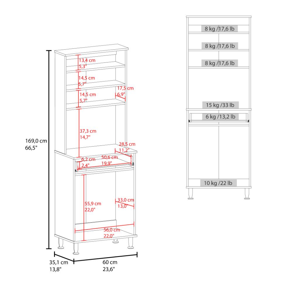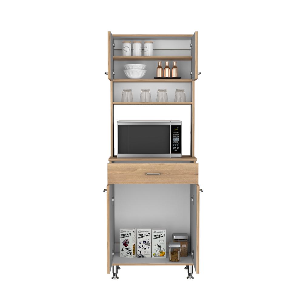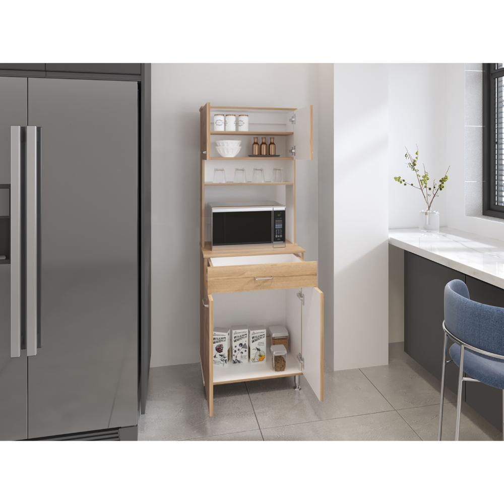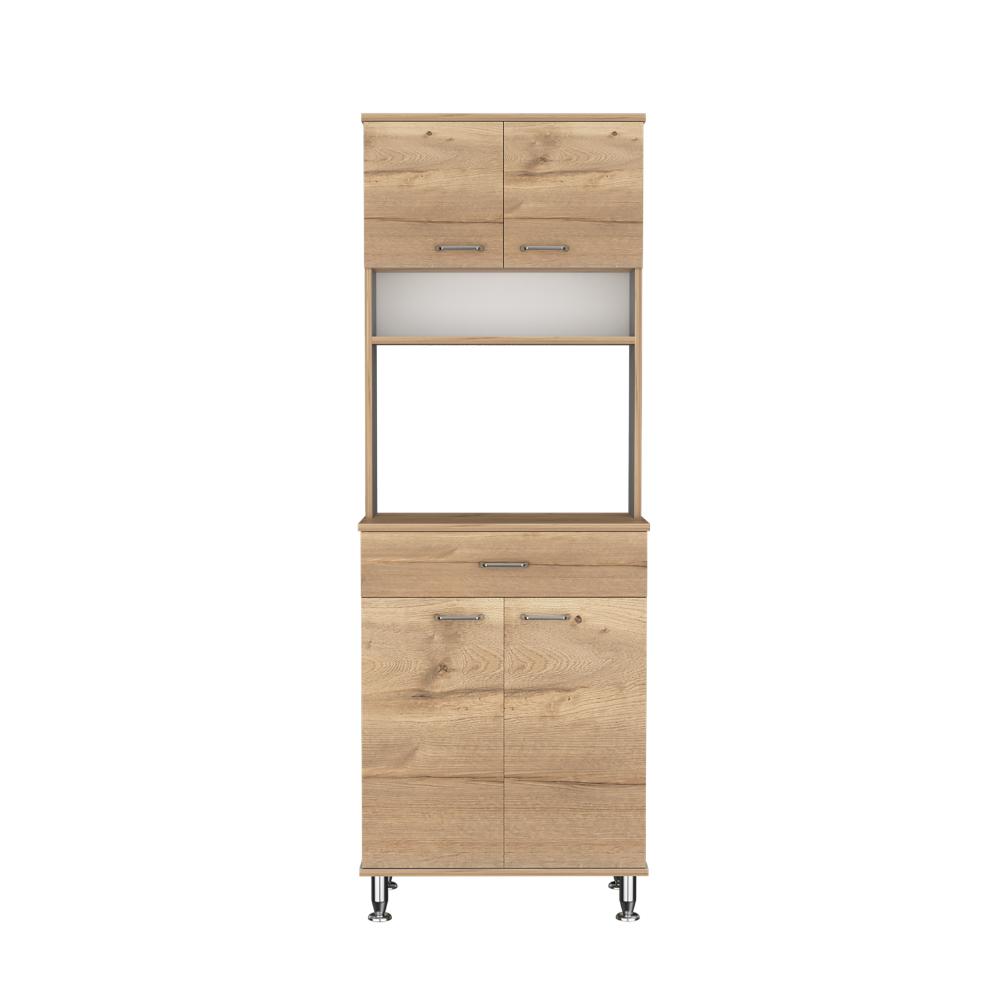 Modulo Microondas, con un cajón deslizable, cuatro puertas abatibles, amplios espacios para almacenamiento, manijas metálicas, patas en acero cromado.