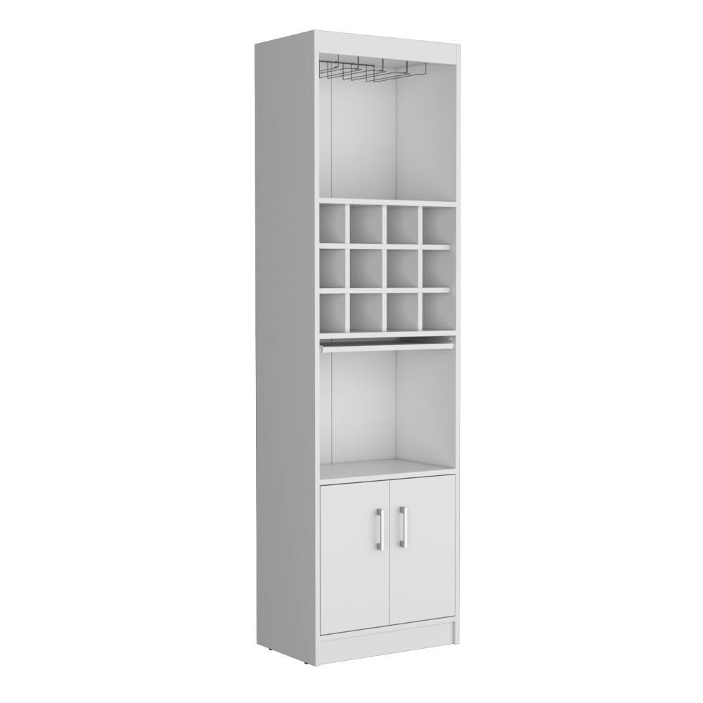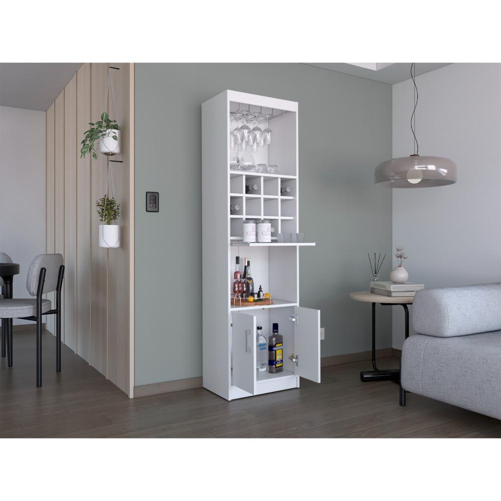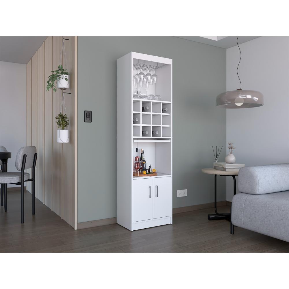 Bar Alto, con porta copas incluido, espacio para colocar objetos decorativos, espacio para organizar licores, dos puertas batientes y una bandeja extraíble.