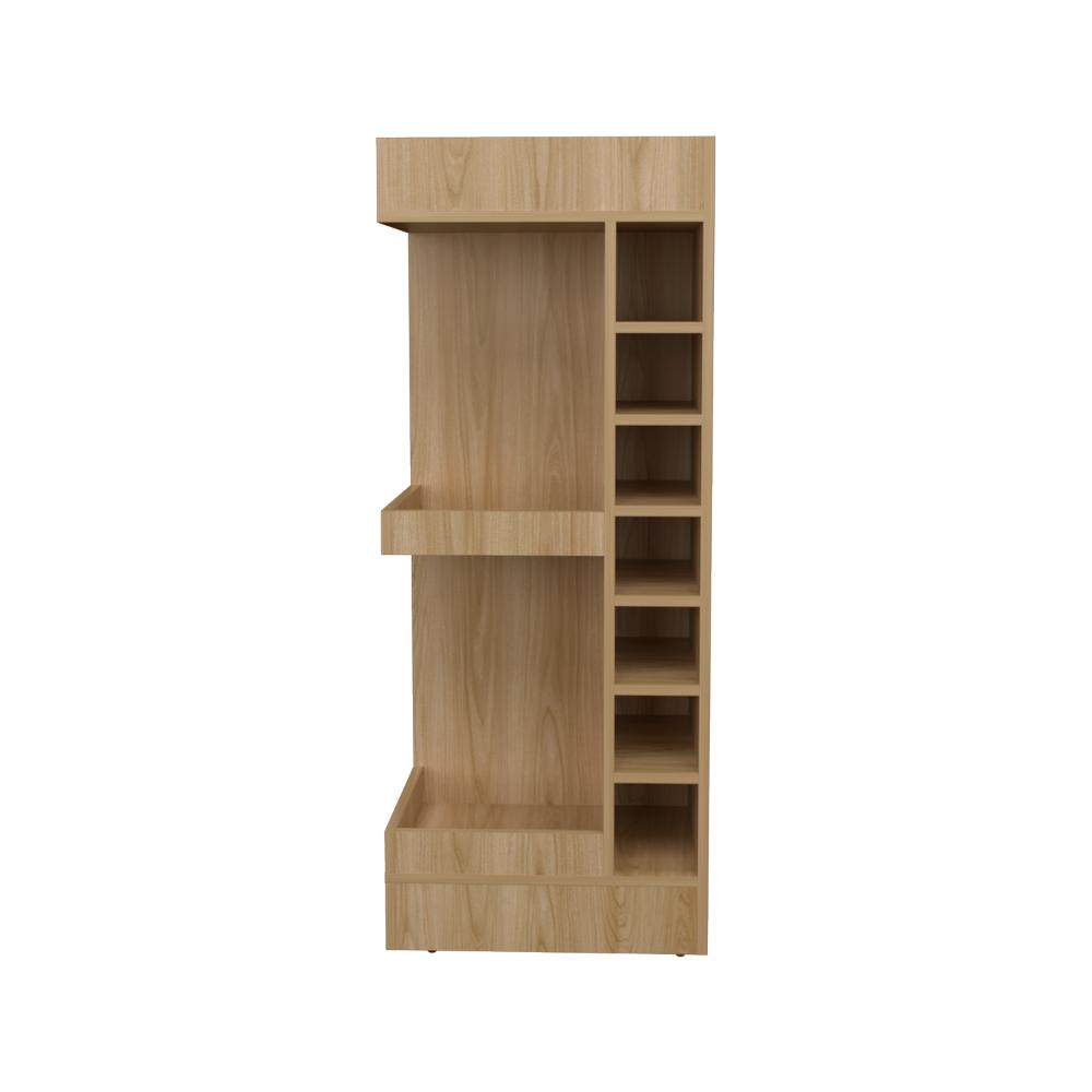 Bar bajo, con espacios par colocar objetos decorativos, espacio para organizar licores, espacio superior para almacenar copas de vinos