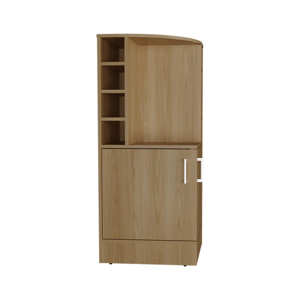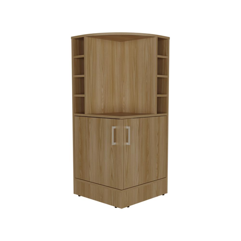 Bar bajo, con espacio para colocar objetos decorativos, espacio para organizar licores, dos puertas batientes.
