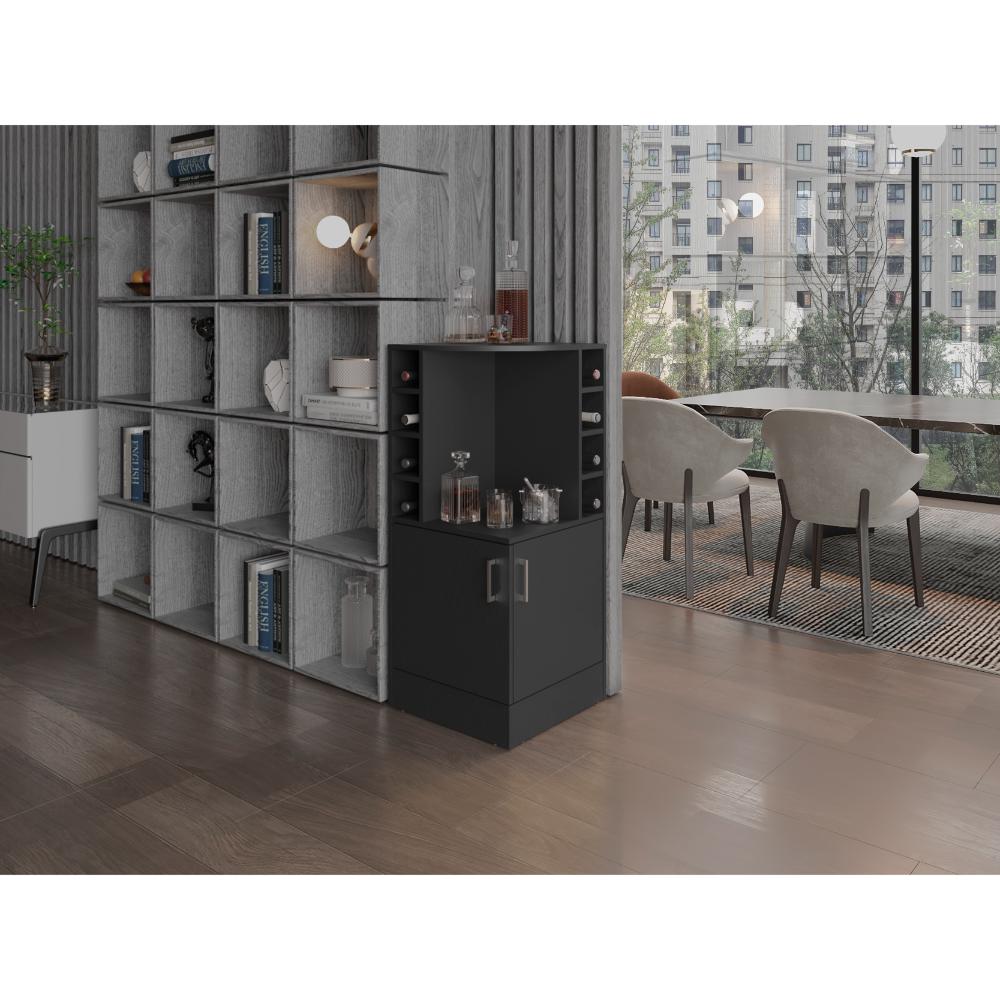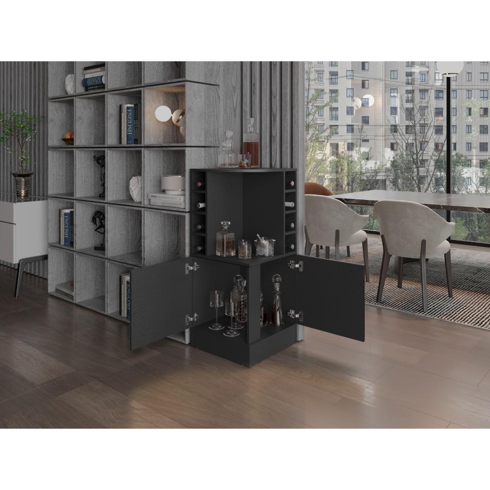 Bar bajo, con espacio para colocar objetos decorativos, espacio para organizar licores, dos puertas batientes.
