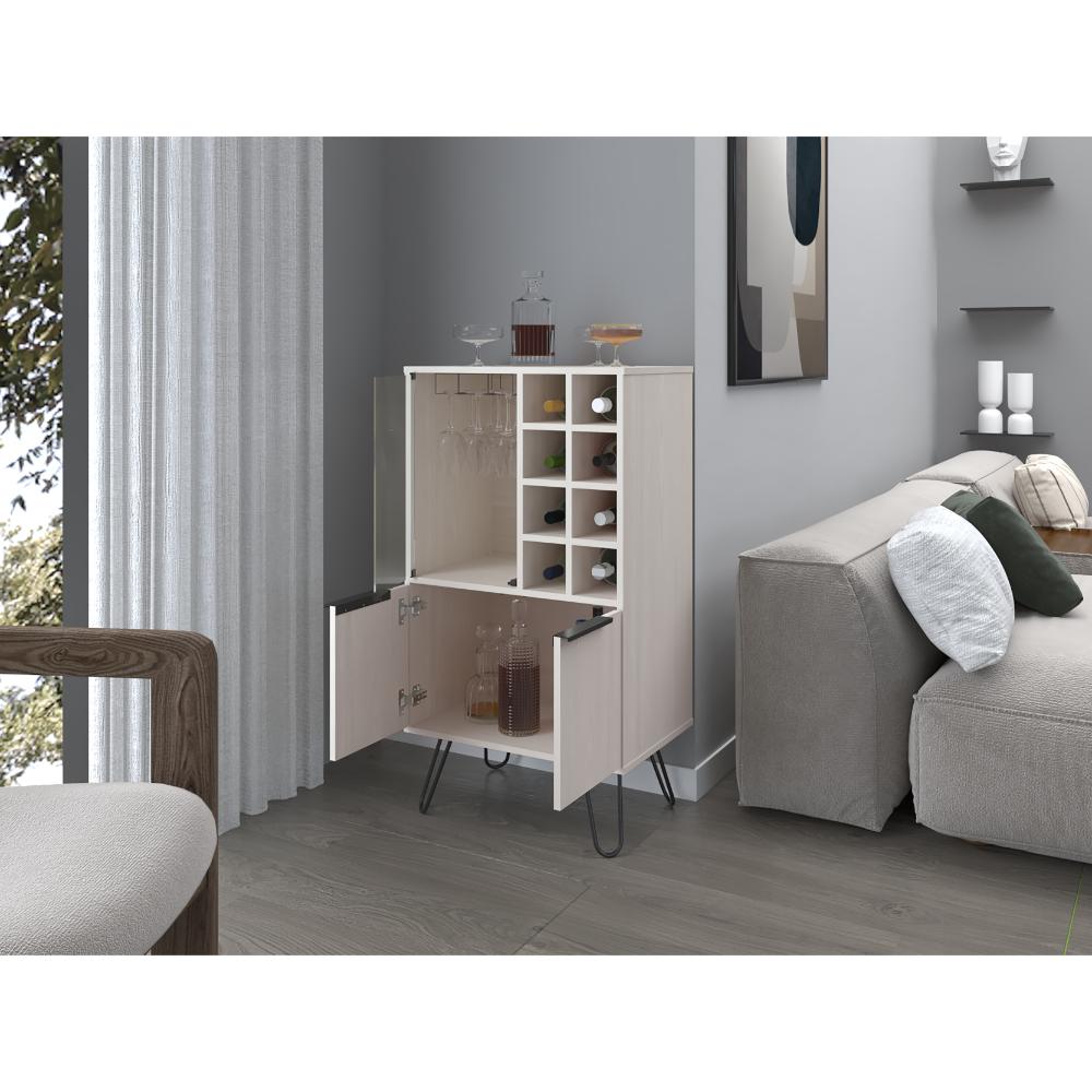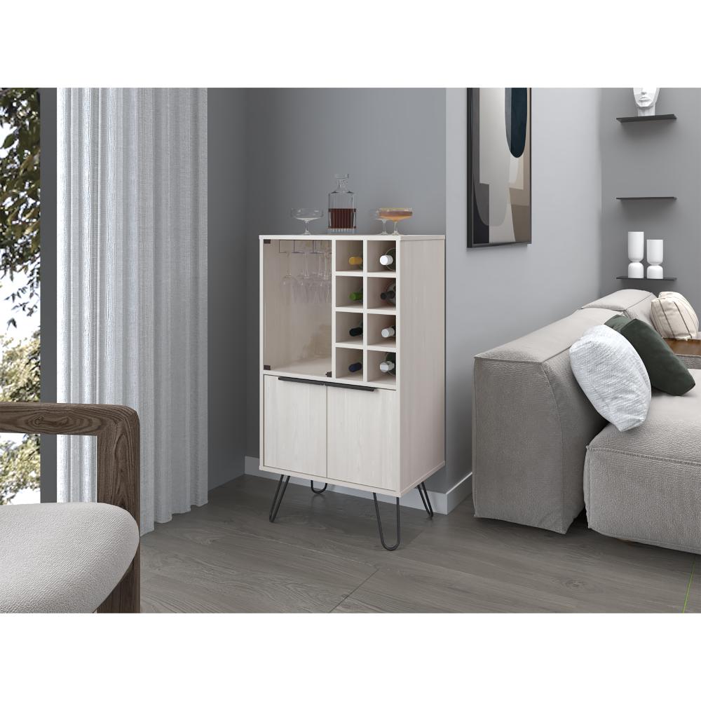 Bar Alto, con espacio para botellas de vino y porta copas, una puerta de vidrio, manijas metálicas.