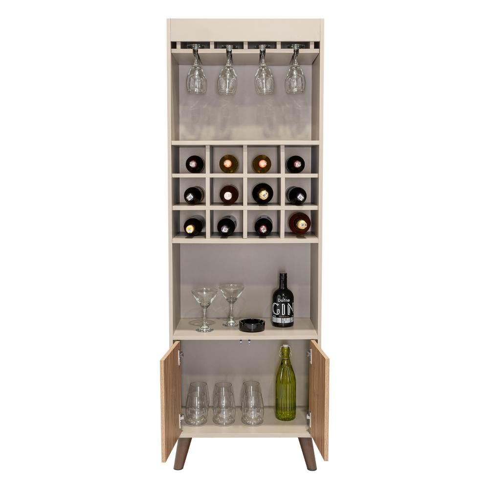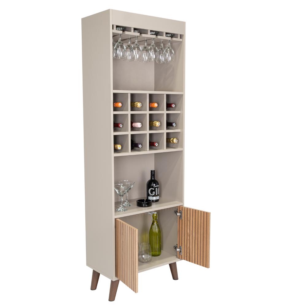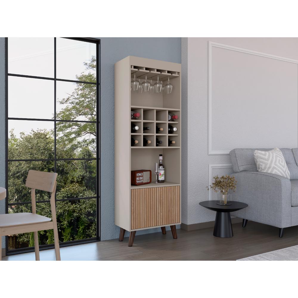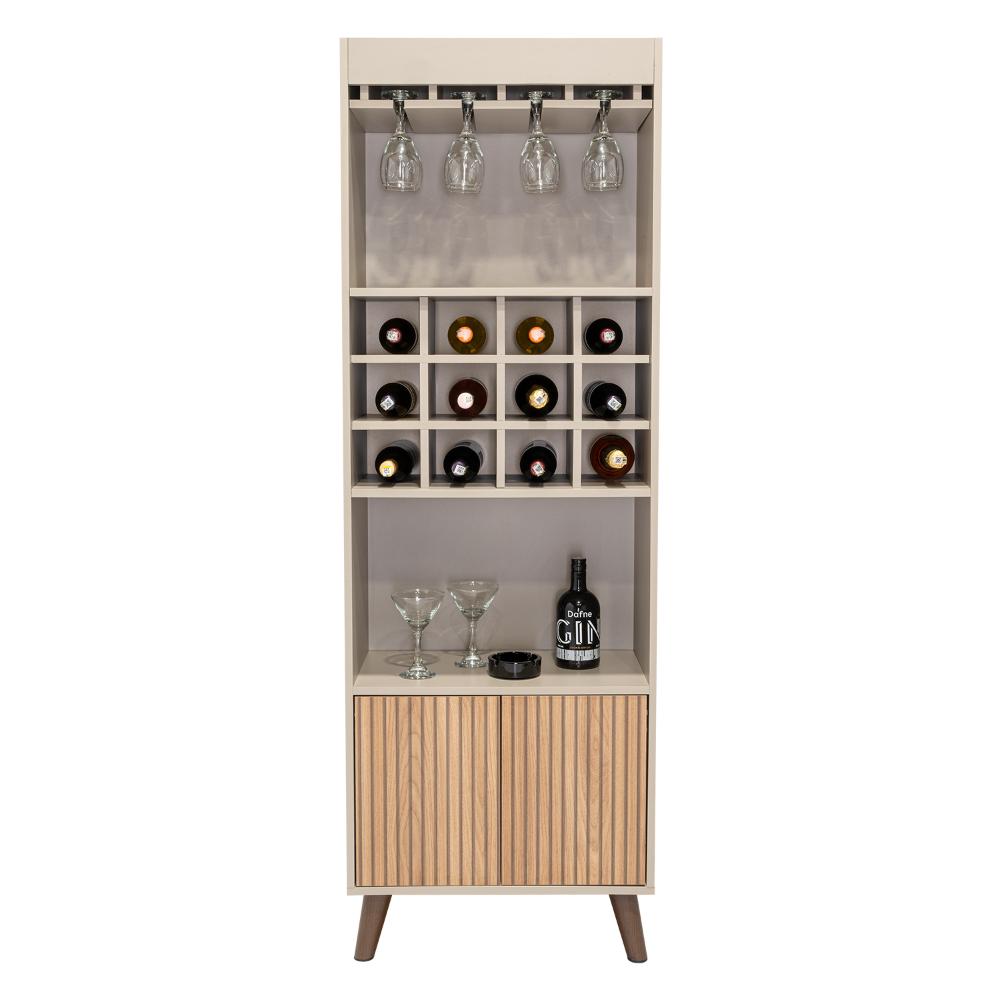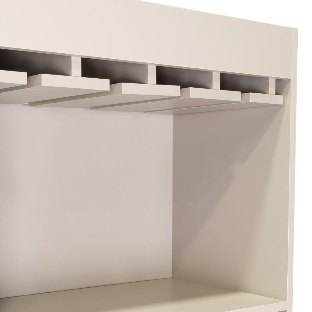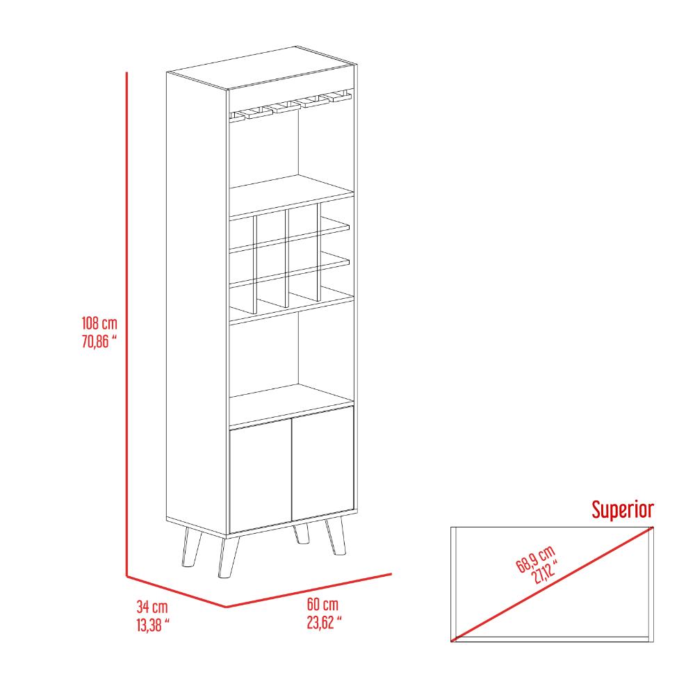 Bar alto, con espacio para guardar botellas de vino, espacio para colgar copas de vino, espacio para almacenamiento y puerta abatible.