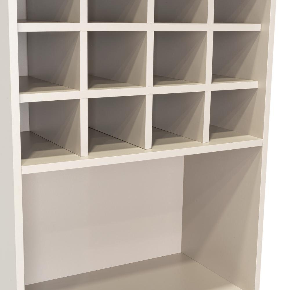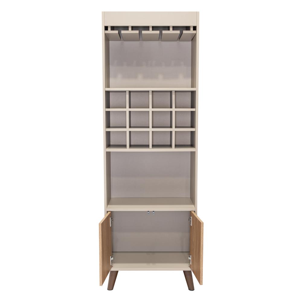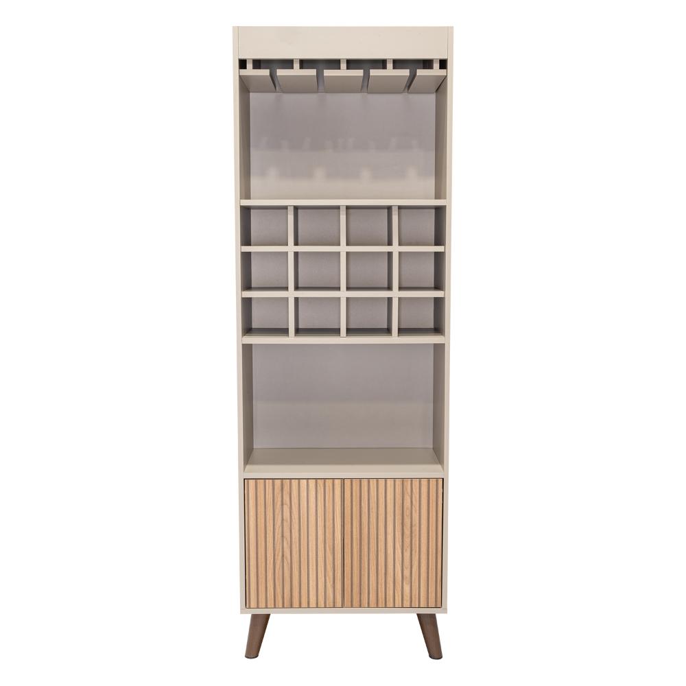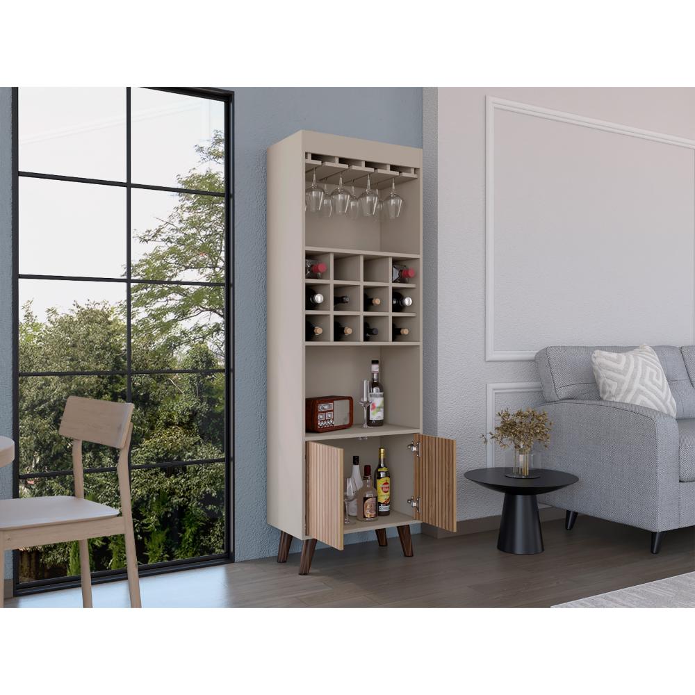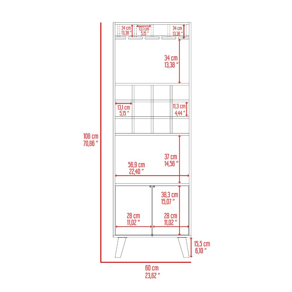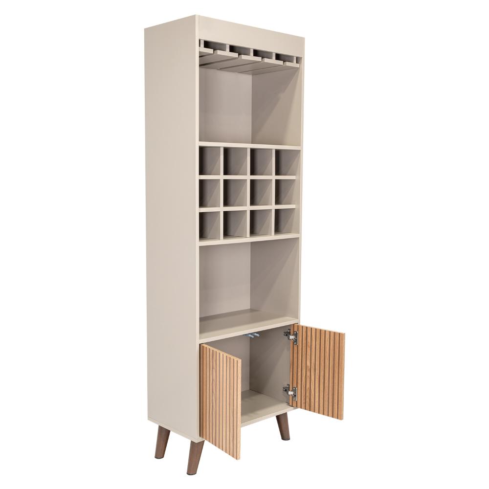 Bar alto, con espacio para guardar botellas de vino, espacio para colgar copas de vino, espacio para almacenamiento y puerta abatible.