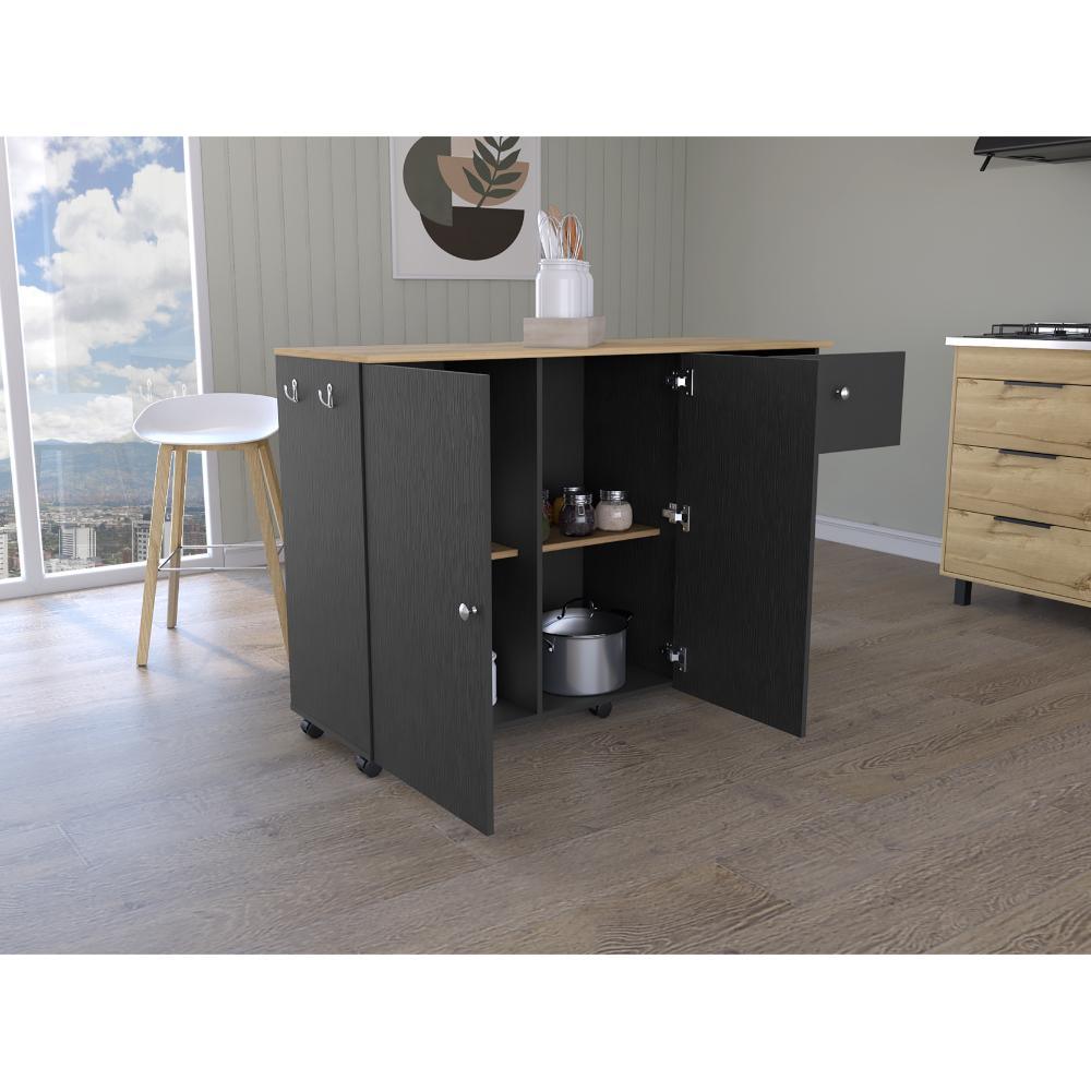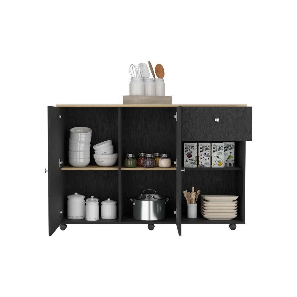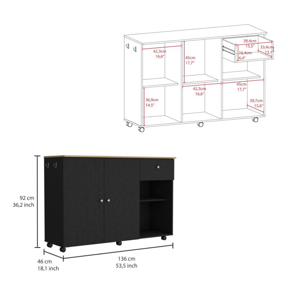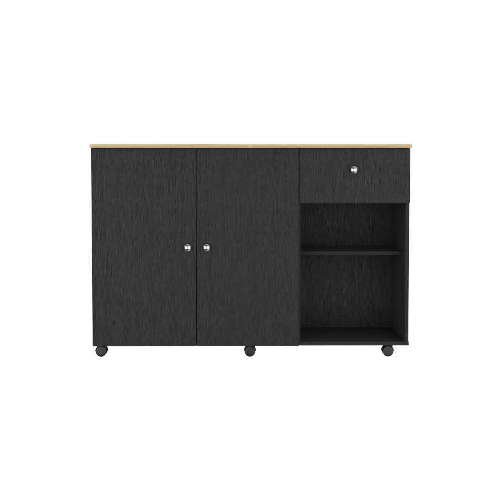 Barra de Cocina, amplia superficie en la mesa, dos puertas batientes, un cajón para almacenar objetos, dos entrepaños internos para almacenamiento, rodachinas