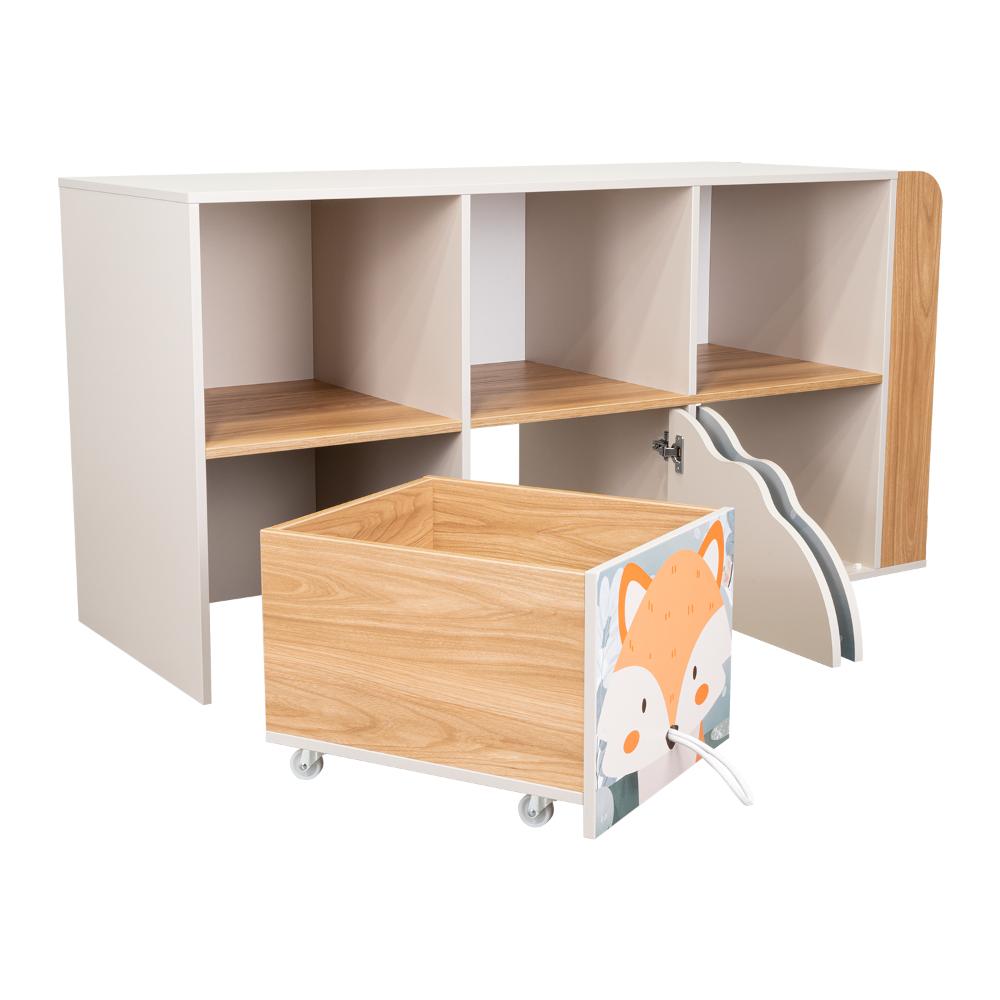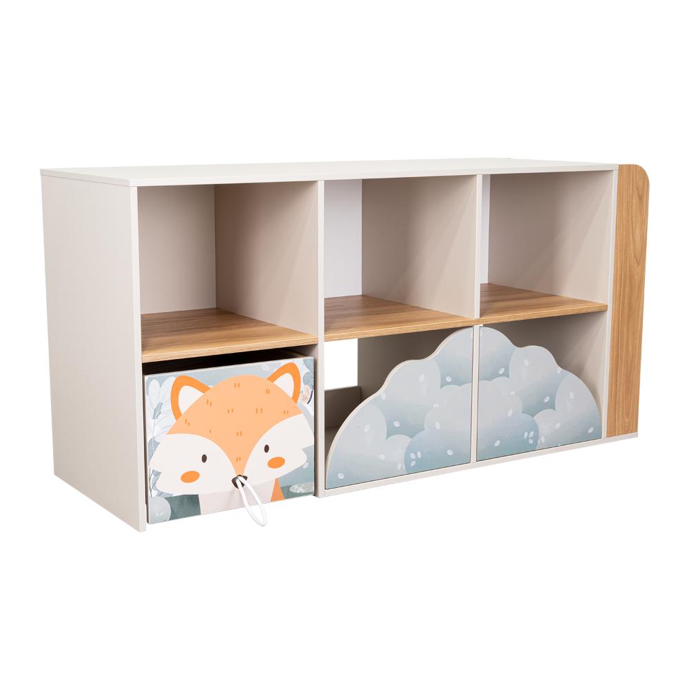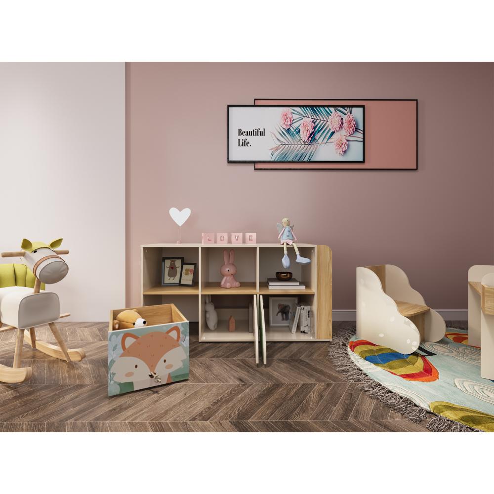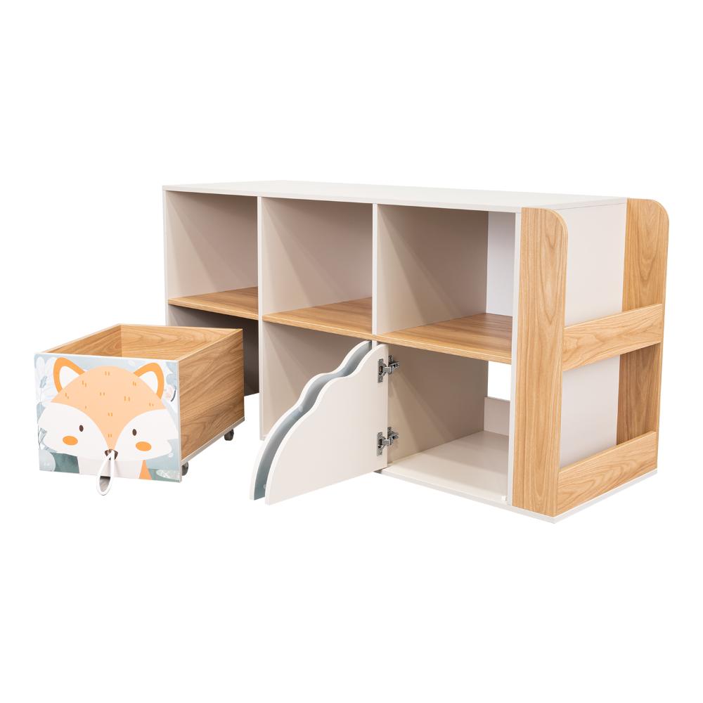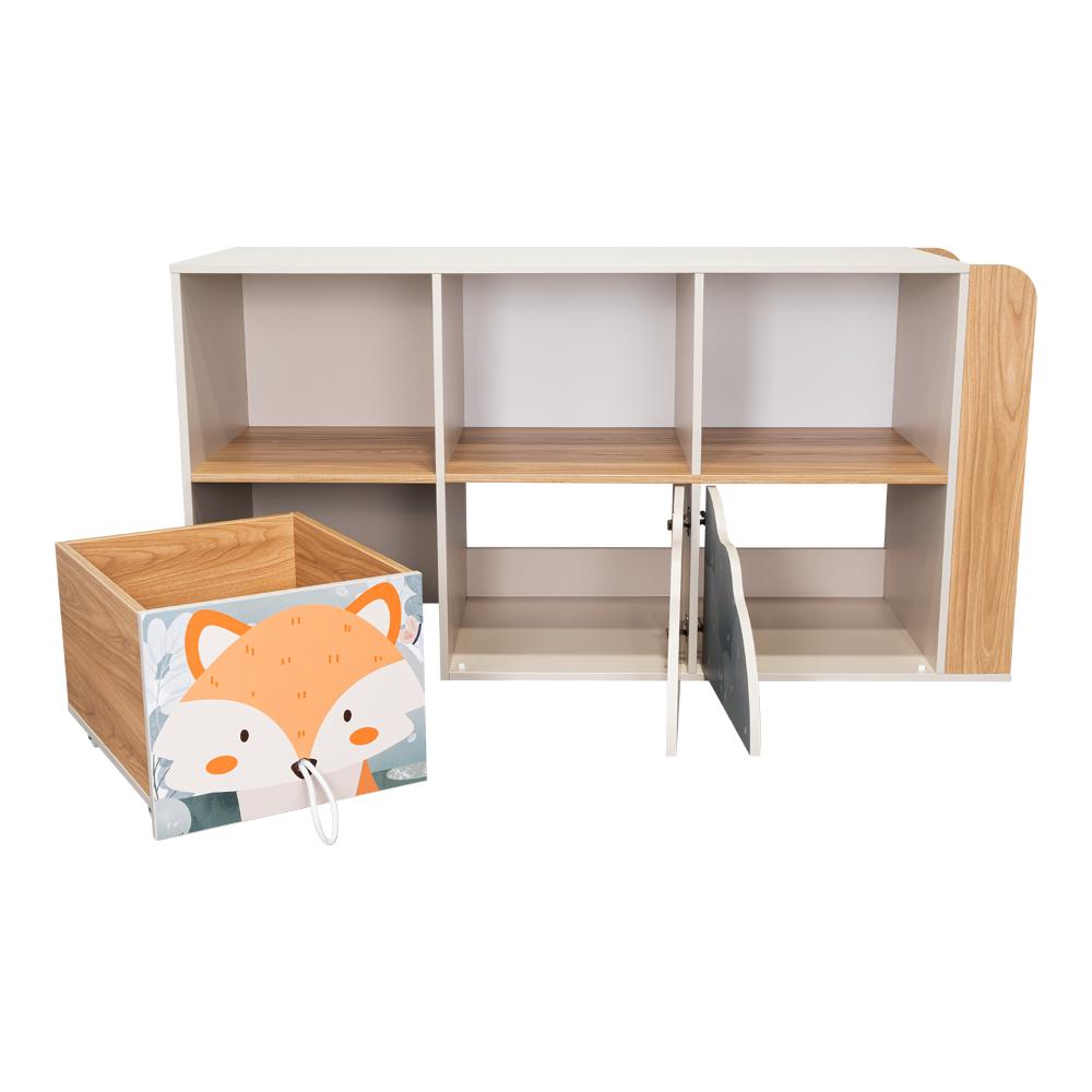 Biblioteca a Piso , con entrepaños para ubicar libros y/o juguetes, amplios espacios de almacenamiento, cajón movible con manija de lazo.