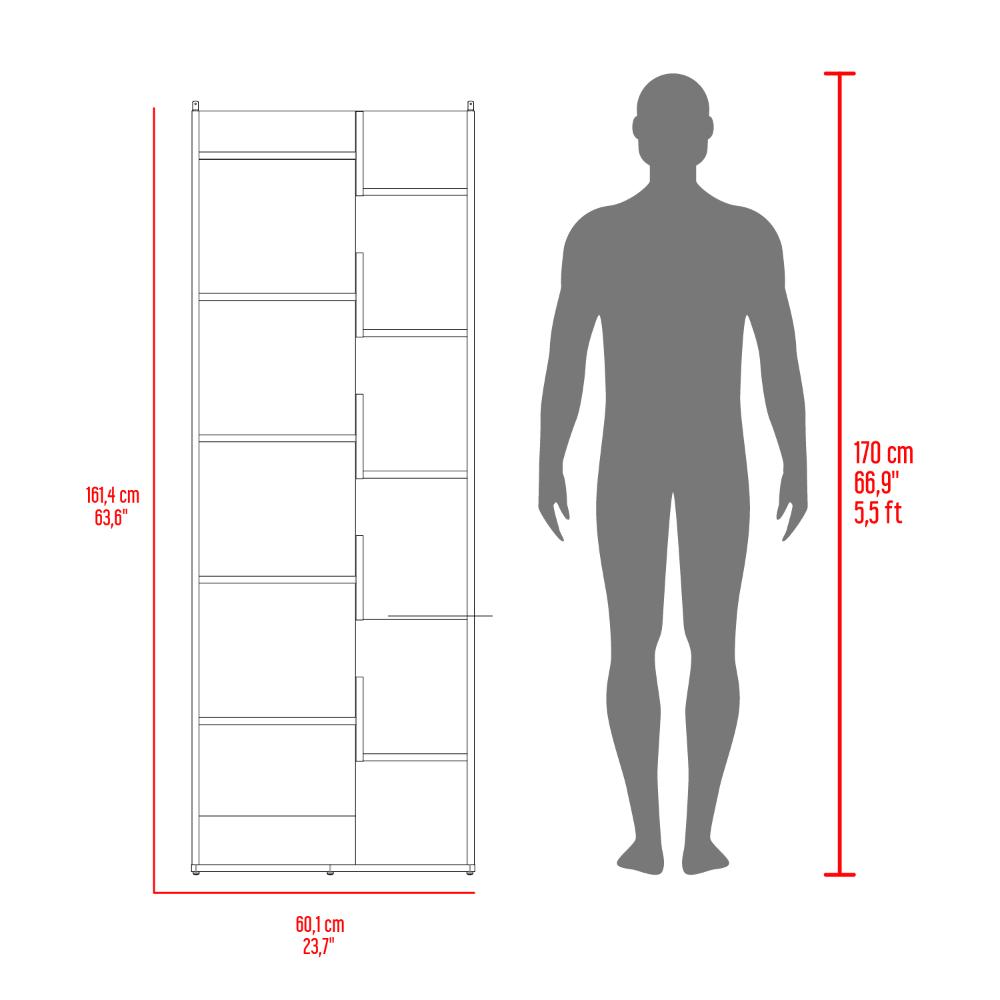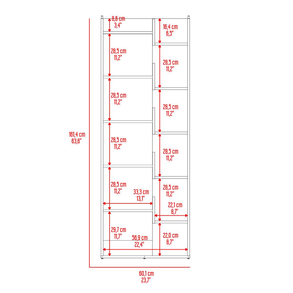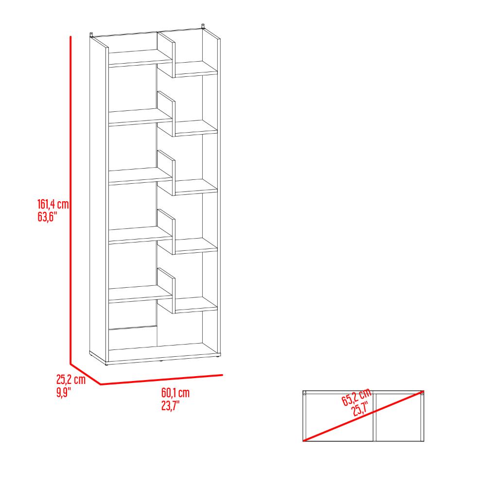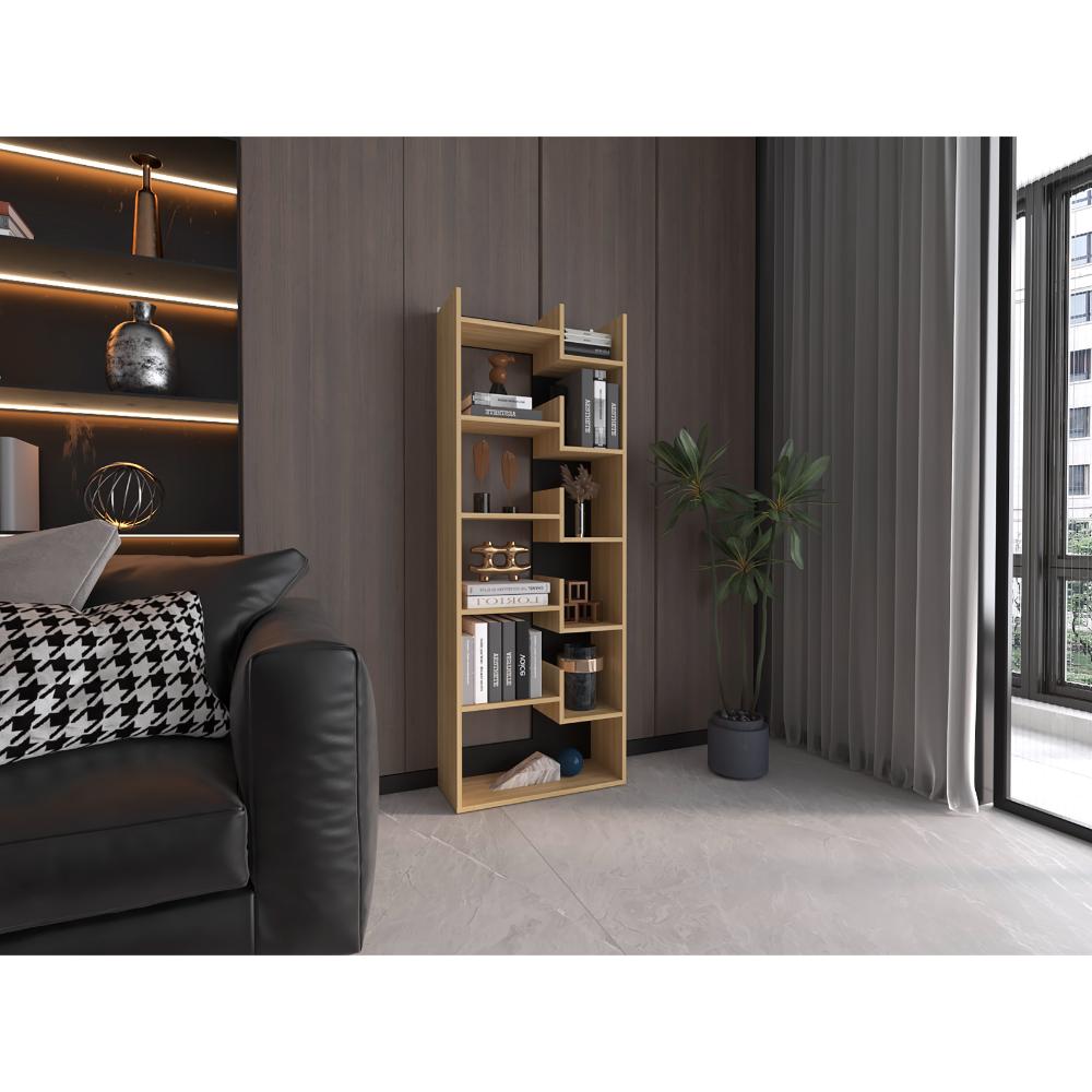 Biblioteca, con múltiples entrepaños y espacios para guardar y poner objetos.