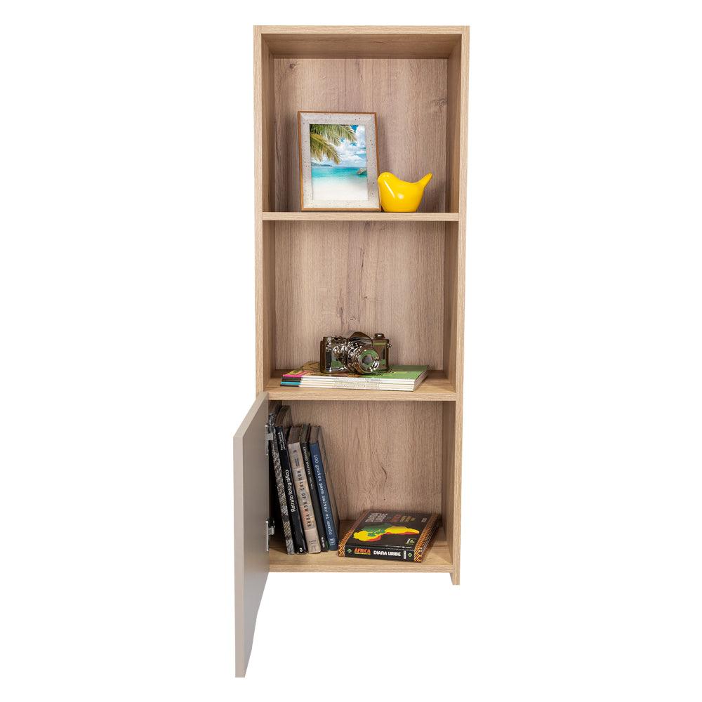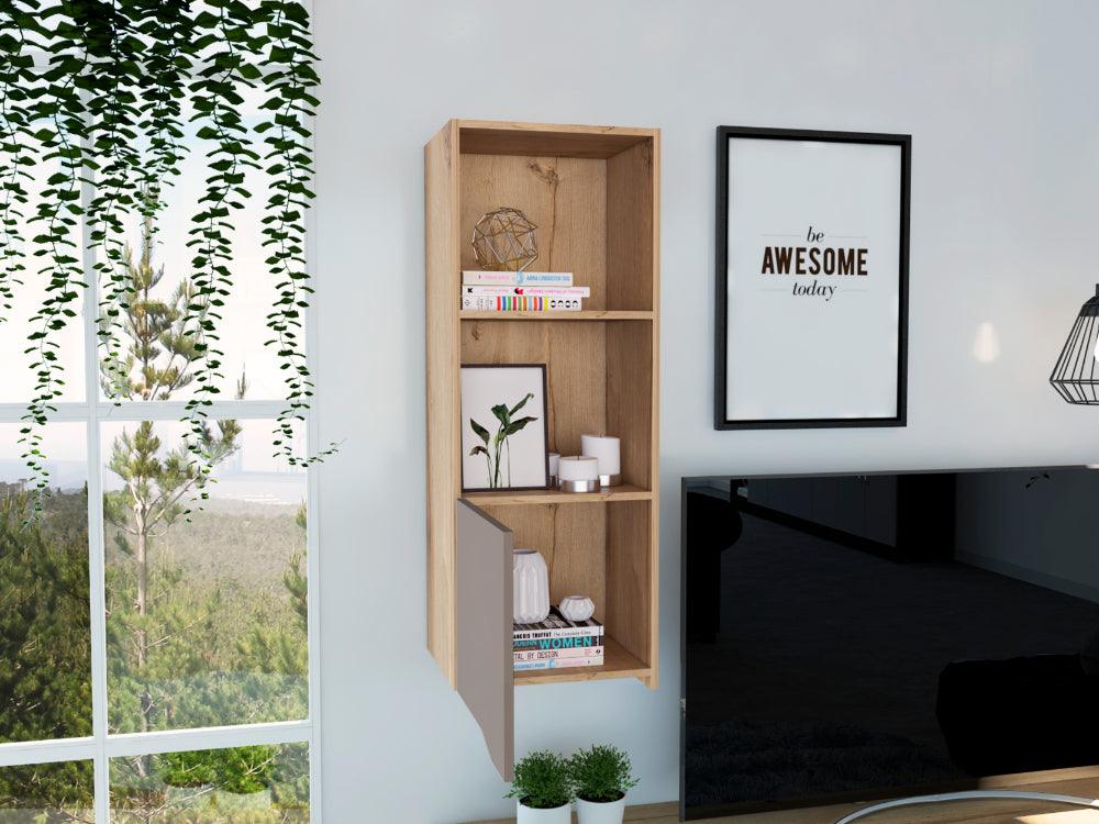 Biblioteca Flotante, practico archivador con diseño minimalista y moderno, fácil instalación a la pared, puerta abatible, espacios para objetos decorativos.