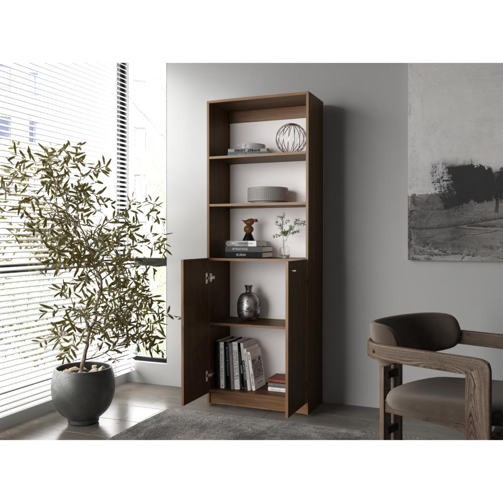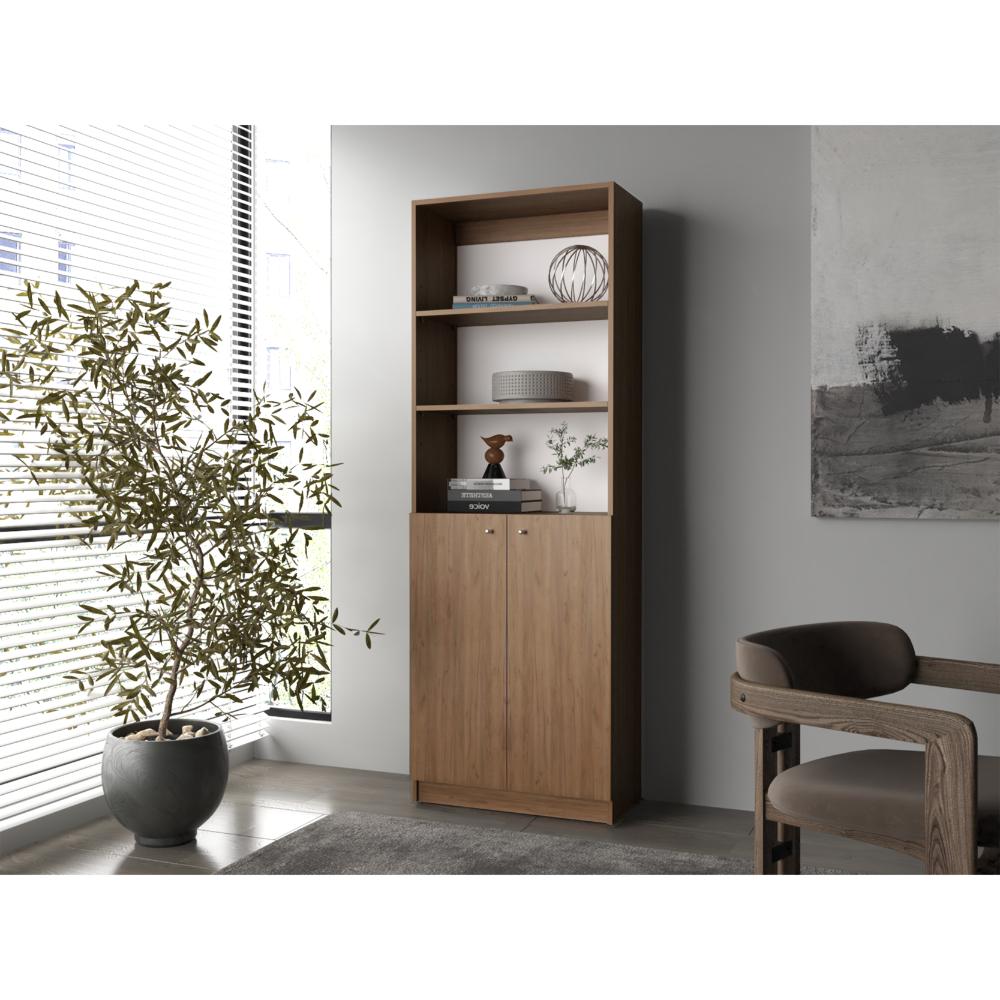 Biblioteca, con espacio para libros y objetos decorativos, dos puertas abatibles, de fácil armado e instalación.