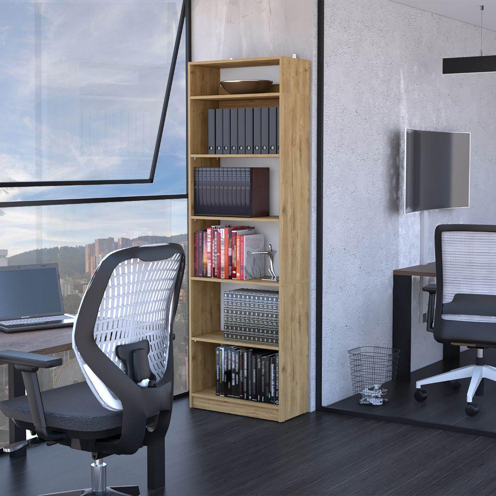 Biblioteca, con cinco entrepaños para ubicar libros y elementos decorativos. Incluye complemento en la parte superior.