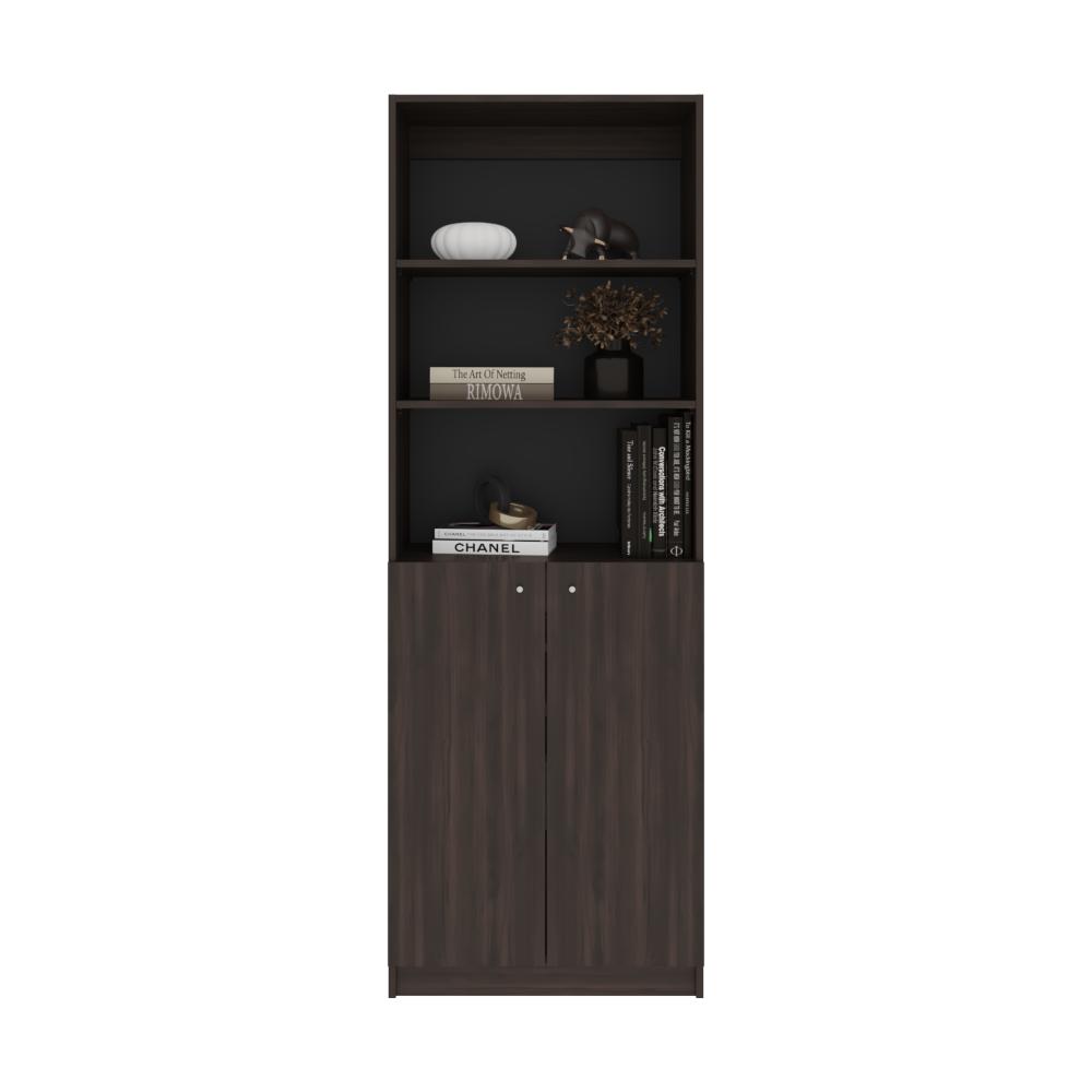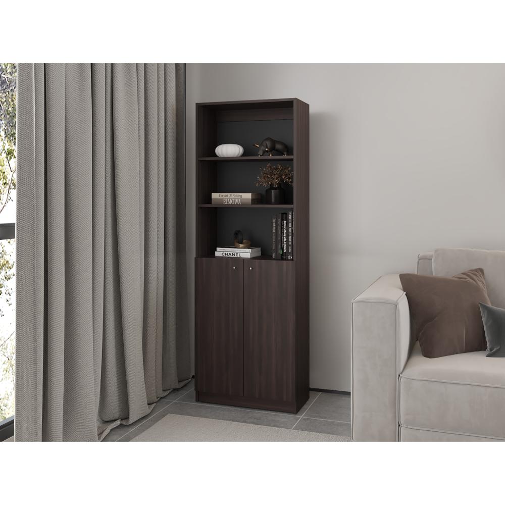 Biblioteca, con espacio para libros y objetos decorativos, dos puertas abatibles, de fácil armado e instalación.
