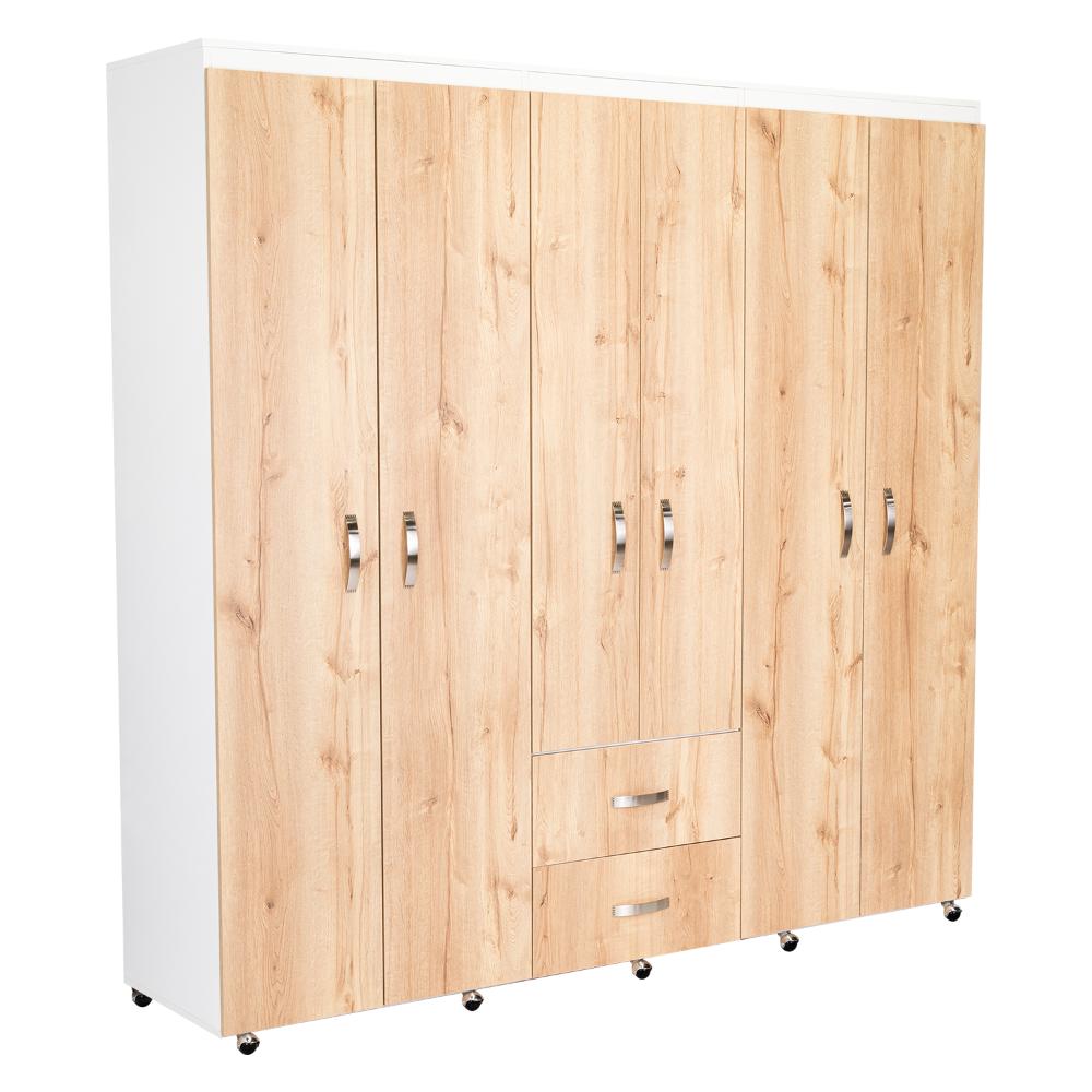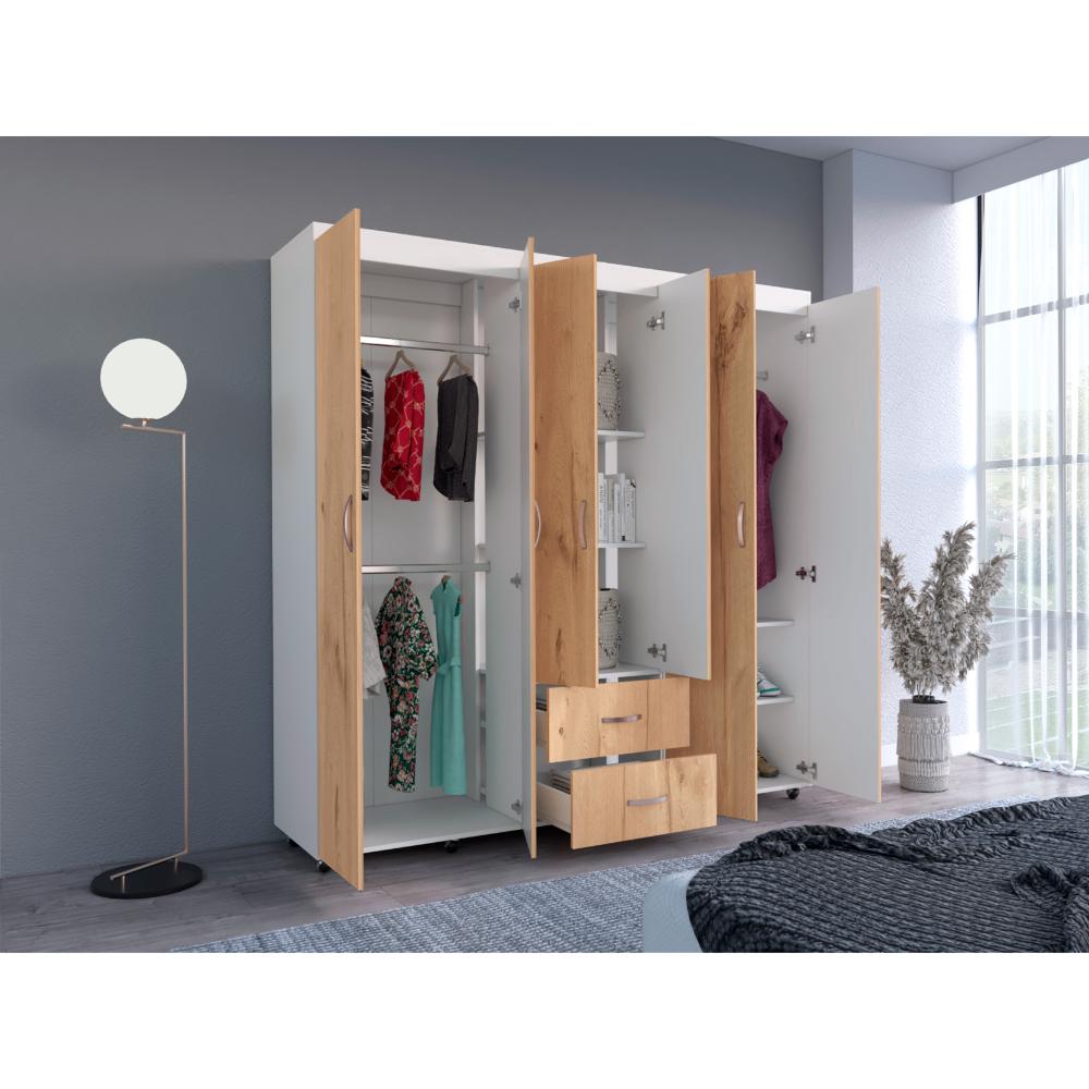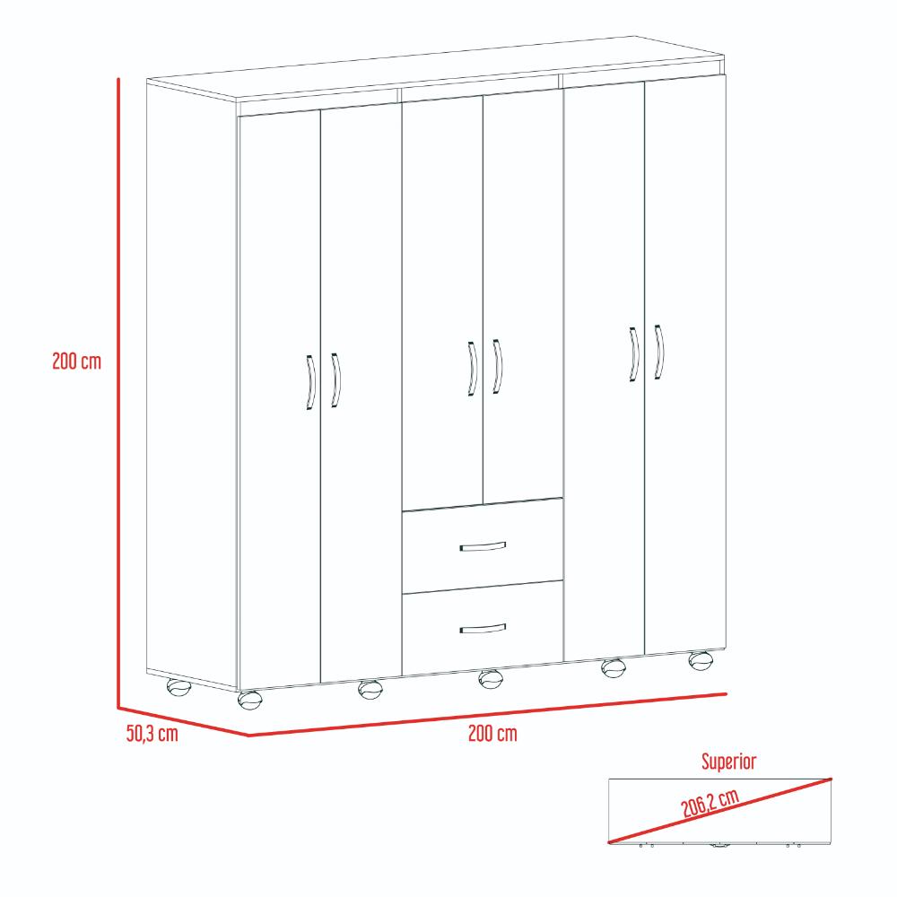 Closet, con amplios espacios y entrepaños para organizar, 6 puertas abatibles, 3 tubos cromados, 2 cajones organizadores, y deslizadores de plástico para apoyo al piso.