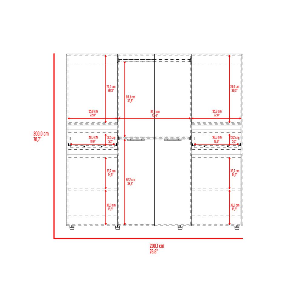 Closet, con seis puertas batientes, dos cajones, dos tubos para colgar ropa y amplios espacios de guardado.