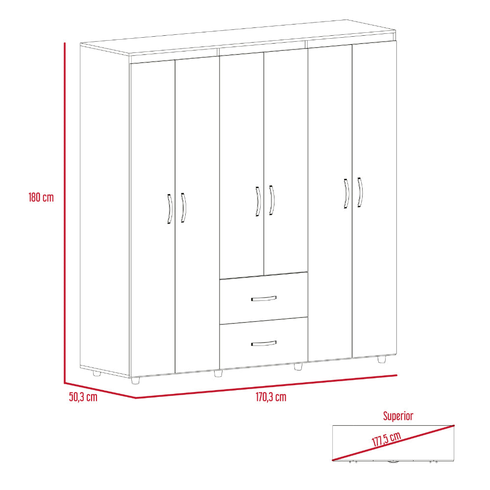 Closet, con amplios espacios y entrepaños para organizar, 6 puertas abatibles, 3 tubos cromados, 2 cajones organizadores, y deslizadores de plástico para apoyo al piso.