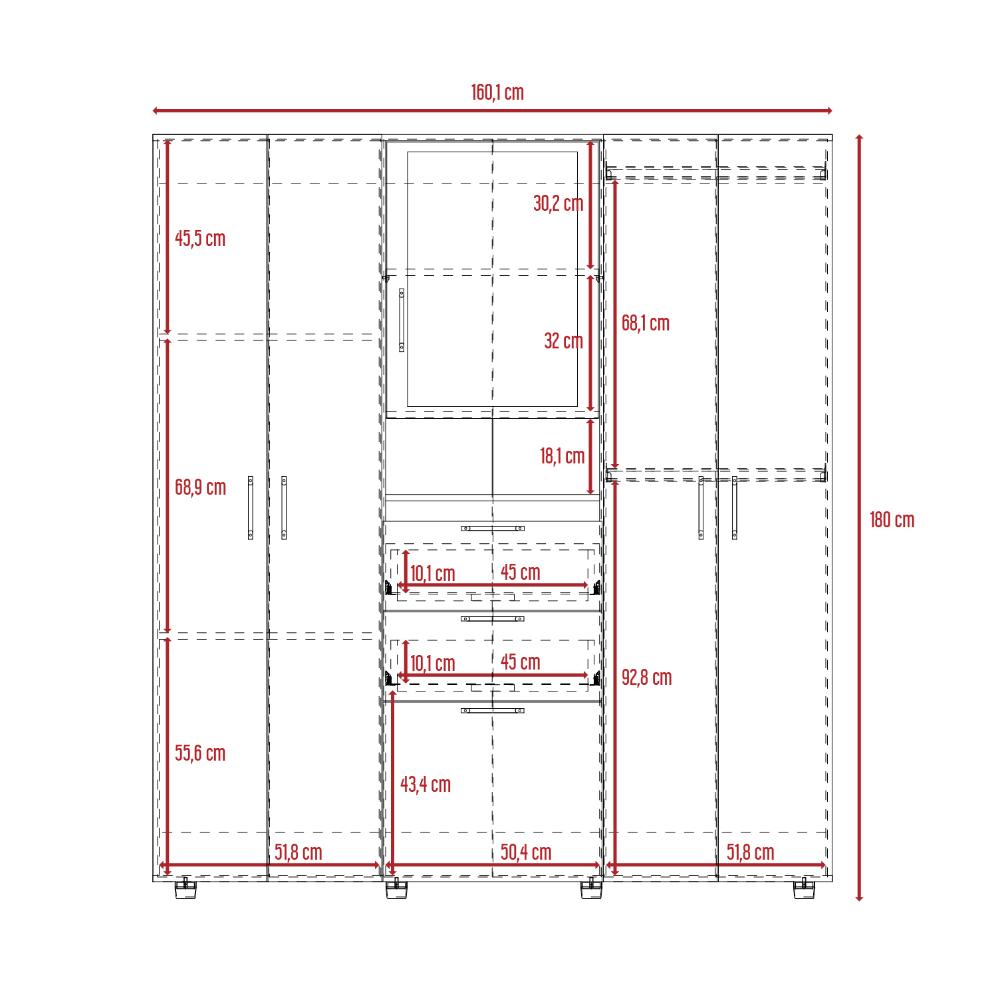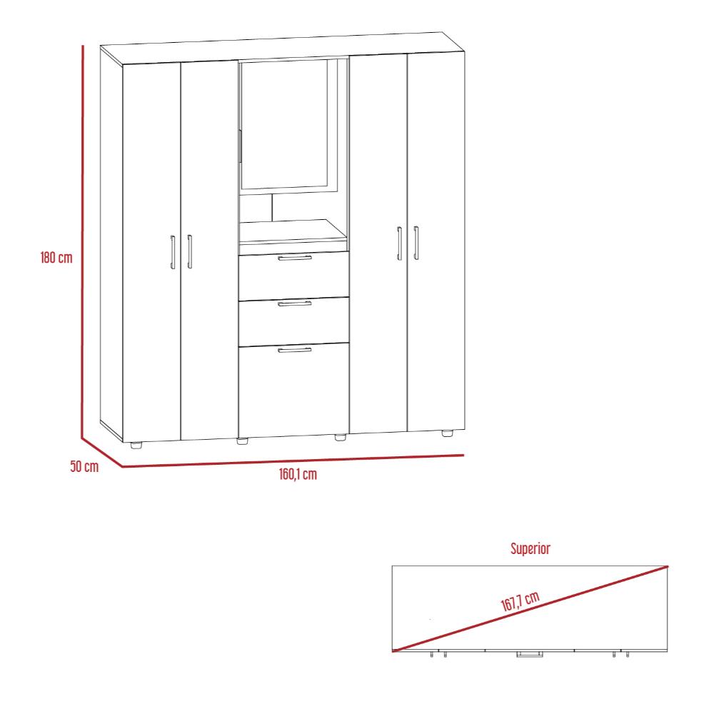 Closet, dos cajones, seis puertas, tubos metalicos para coglar ropa, espejo de 60 x 40 para puerta.