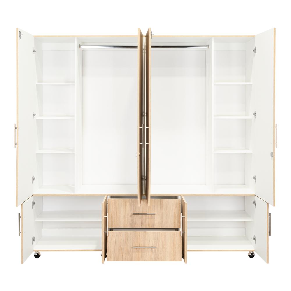 Closet, con 2 cajones, 2 tubos cromados para colgar ropa, 8 puertas batientes con manijas metálicas, variedad de entrepaños, rodachines para fácil desplazamiento, y amplios espacios para guardar ropa, zapatos y/o accesorios.