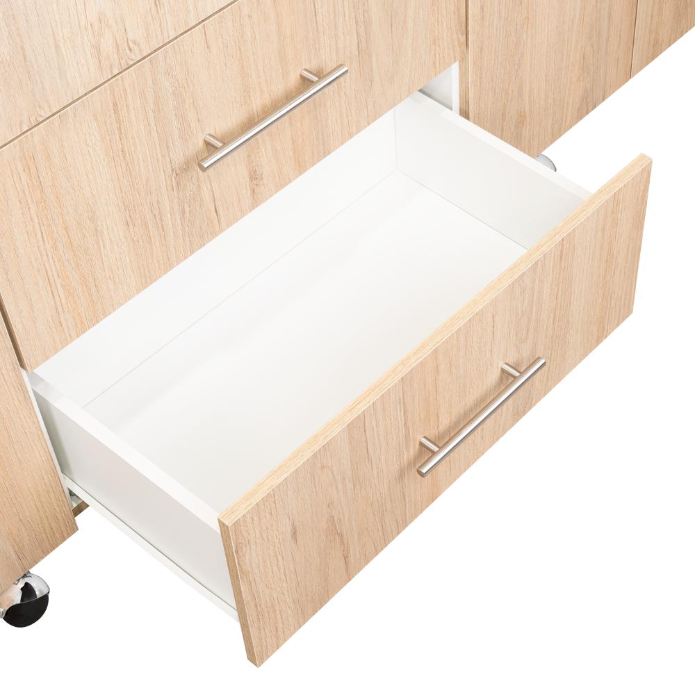 Elaborado en Madera aglomerada MDP, recubierta con láminas melamínicas de excelente calidad, en color Beige y Blanco.