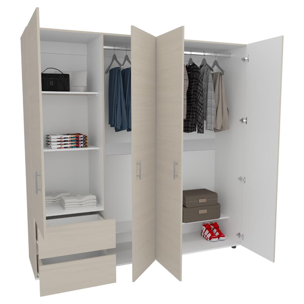 Closet, con amplios espacios de almacenamiento, dos cajones cuatro puertas, manijas y rieles metálicos