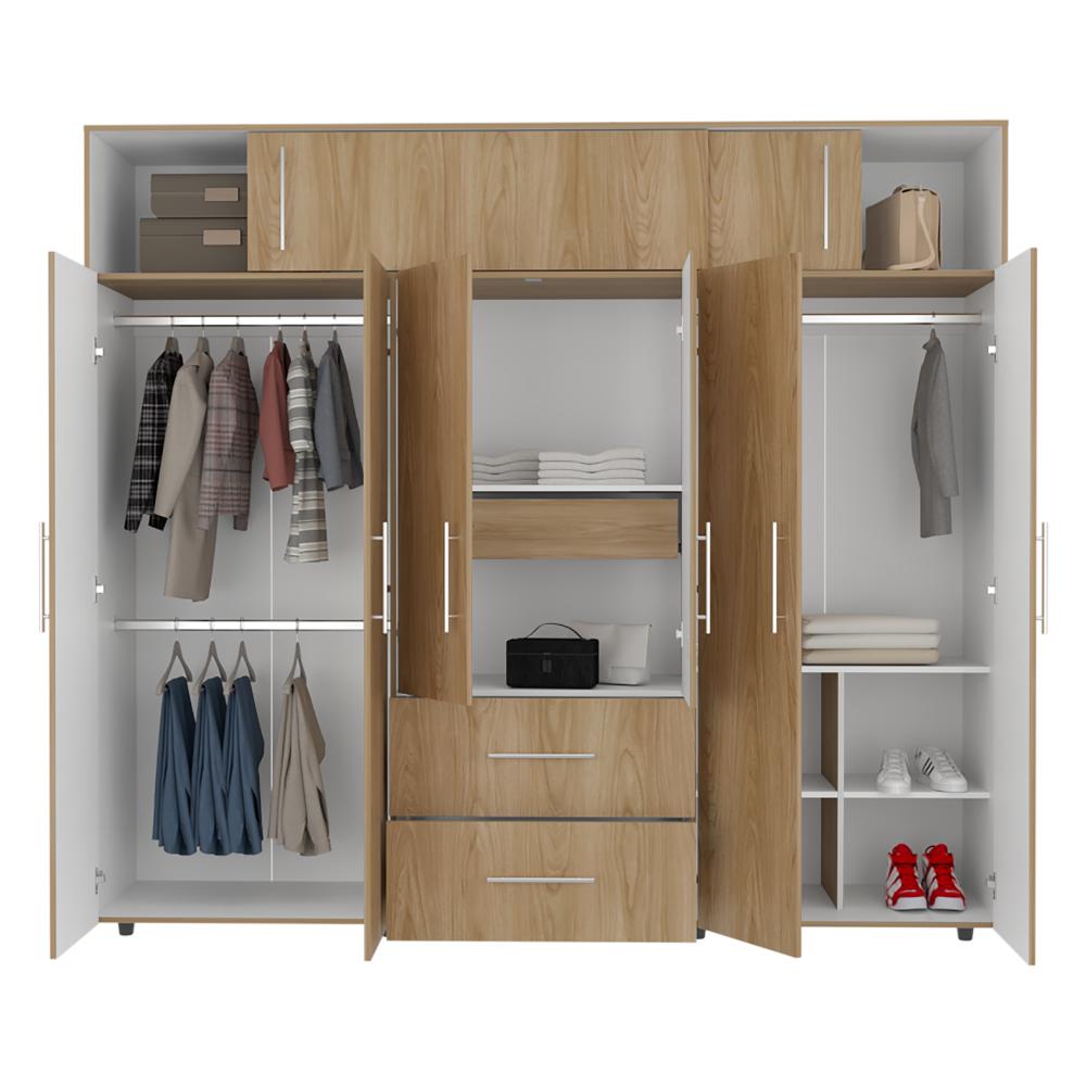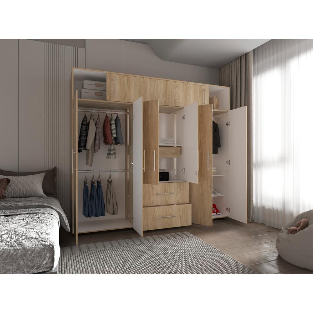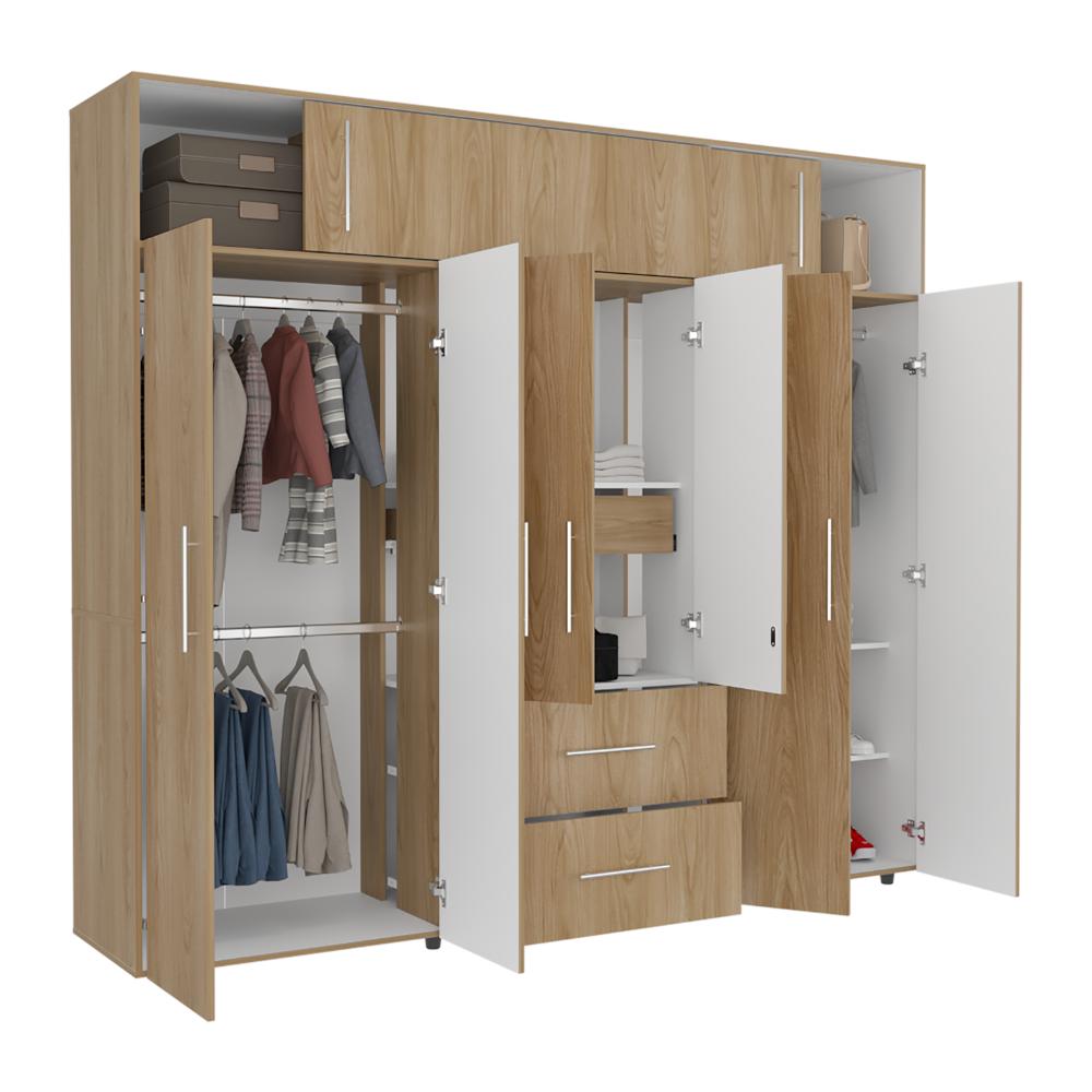 Closet, con seis puertas abatibles, tres tubos ovalados para colgar ropa, dos cajones organizadores multiusos, dos puertas corredizas.