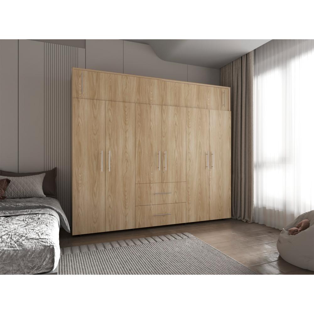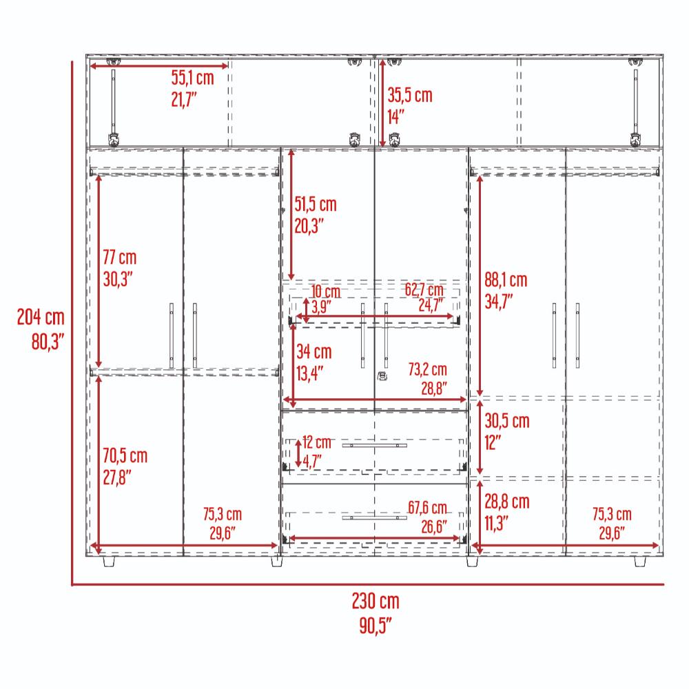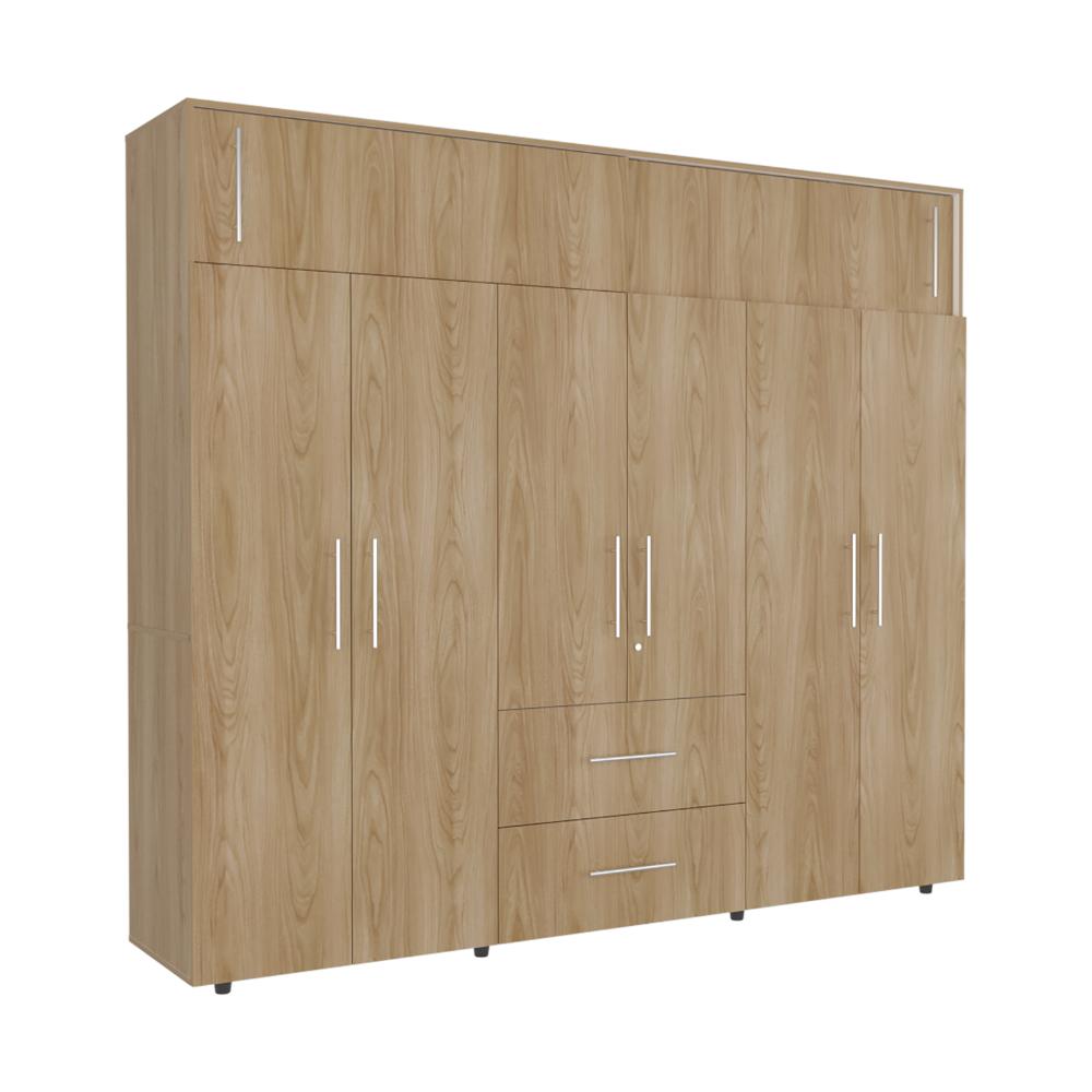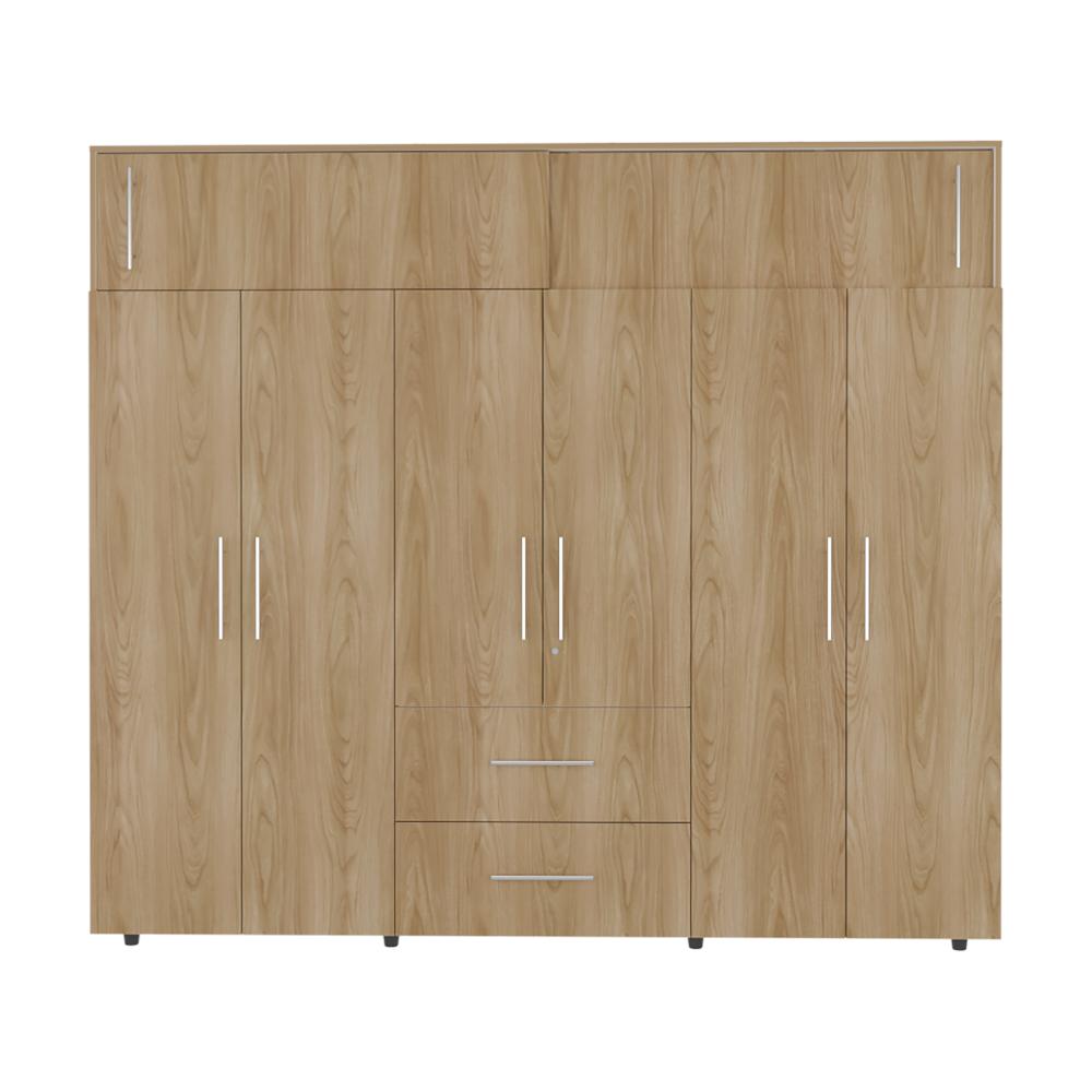 Closet, con seis puertas abatibles, tres tubos ovalados para colgar ropa, dos cajones organizadores multiusos, dos puertas corredizas.