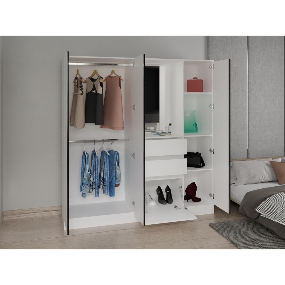 Closet, con tres puertas abatibles, tubos cromados para colgar ropa, tres cajones multiusos, zapatero inferior con puerta abatible