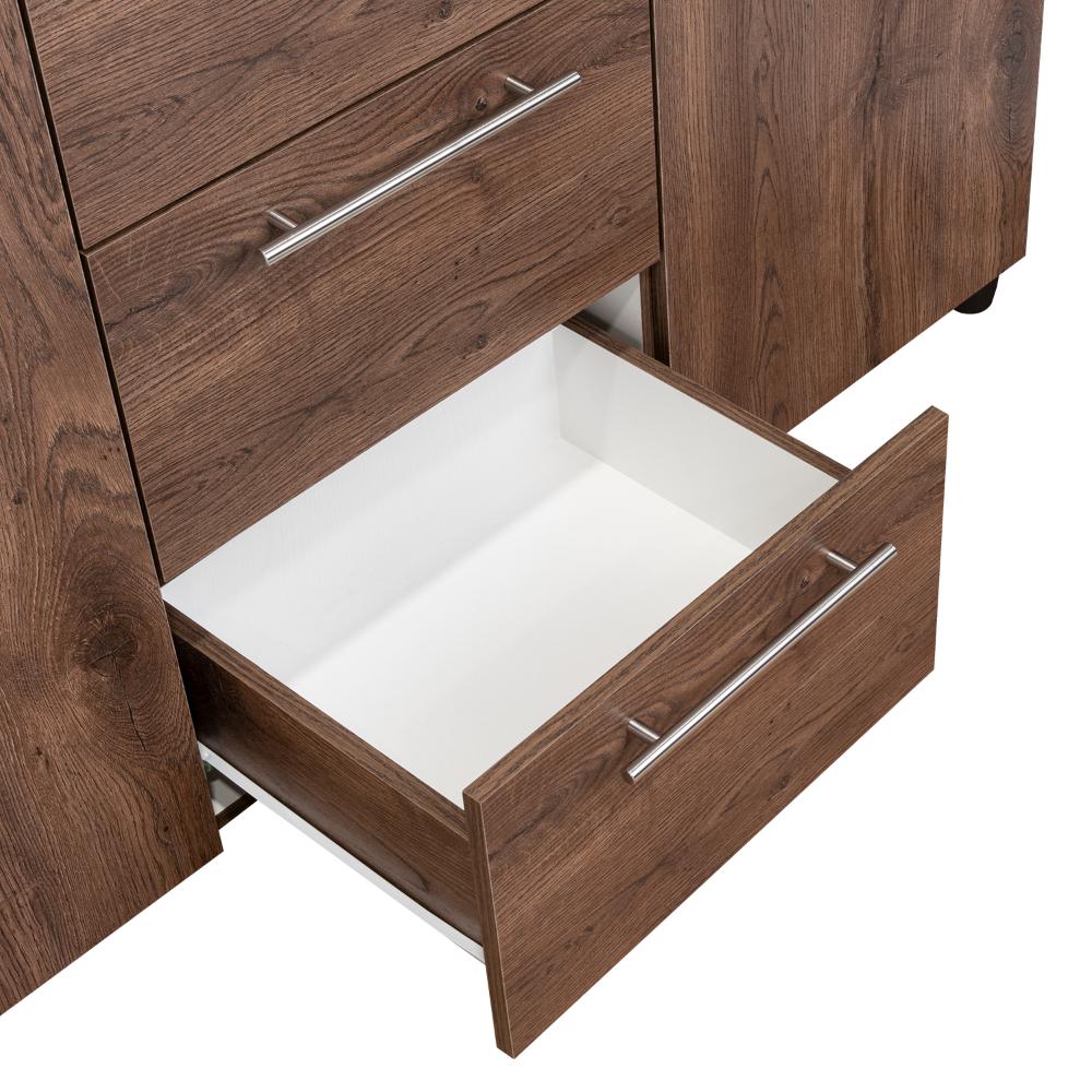 Elaborado en Madera aglomerada MDP, recubierta con láminas melamínicas de excelente calidad, en color Nogal.