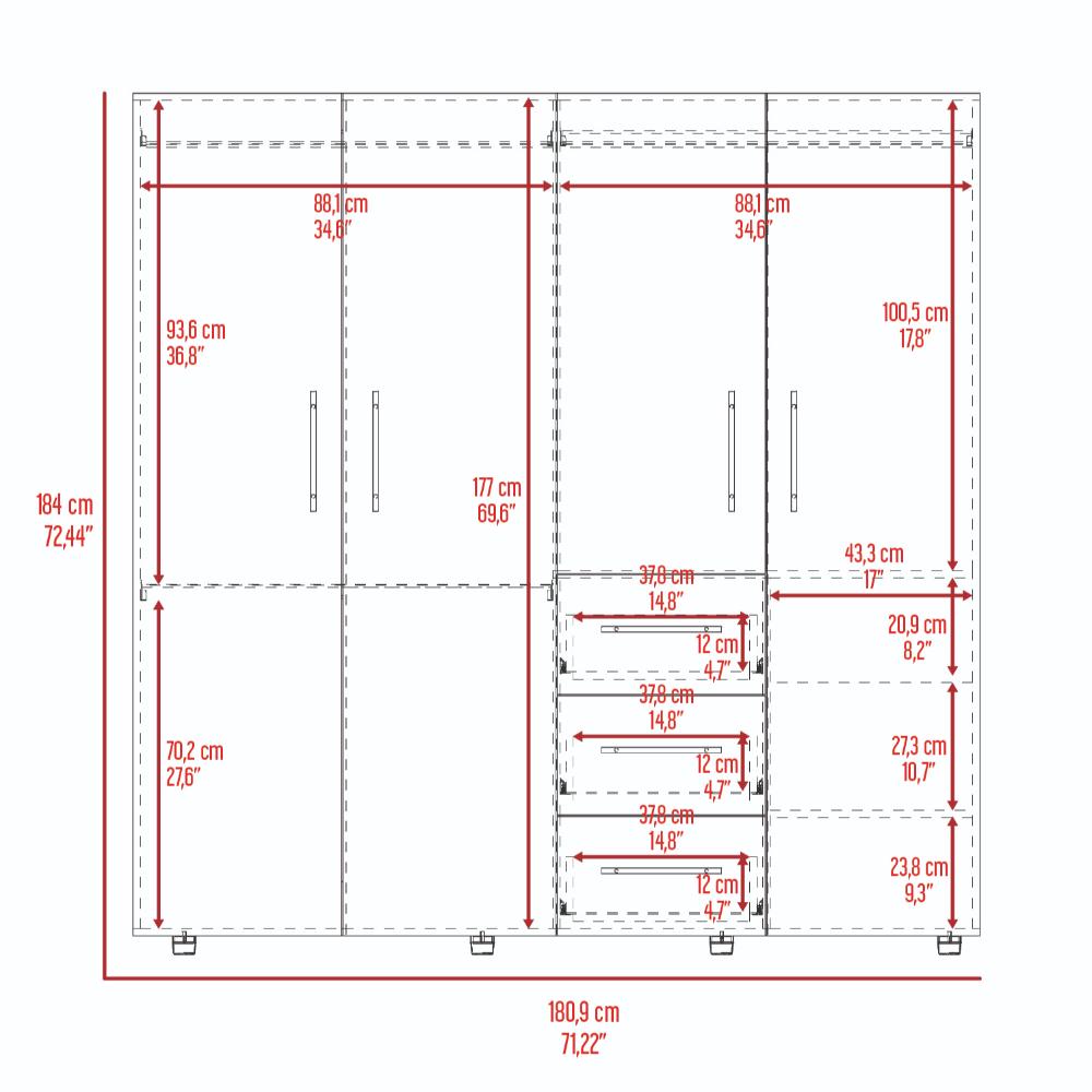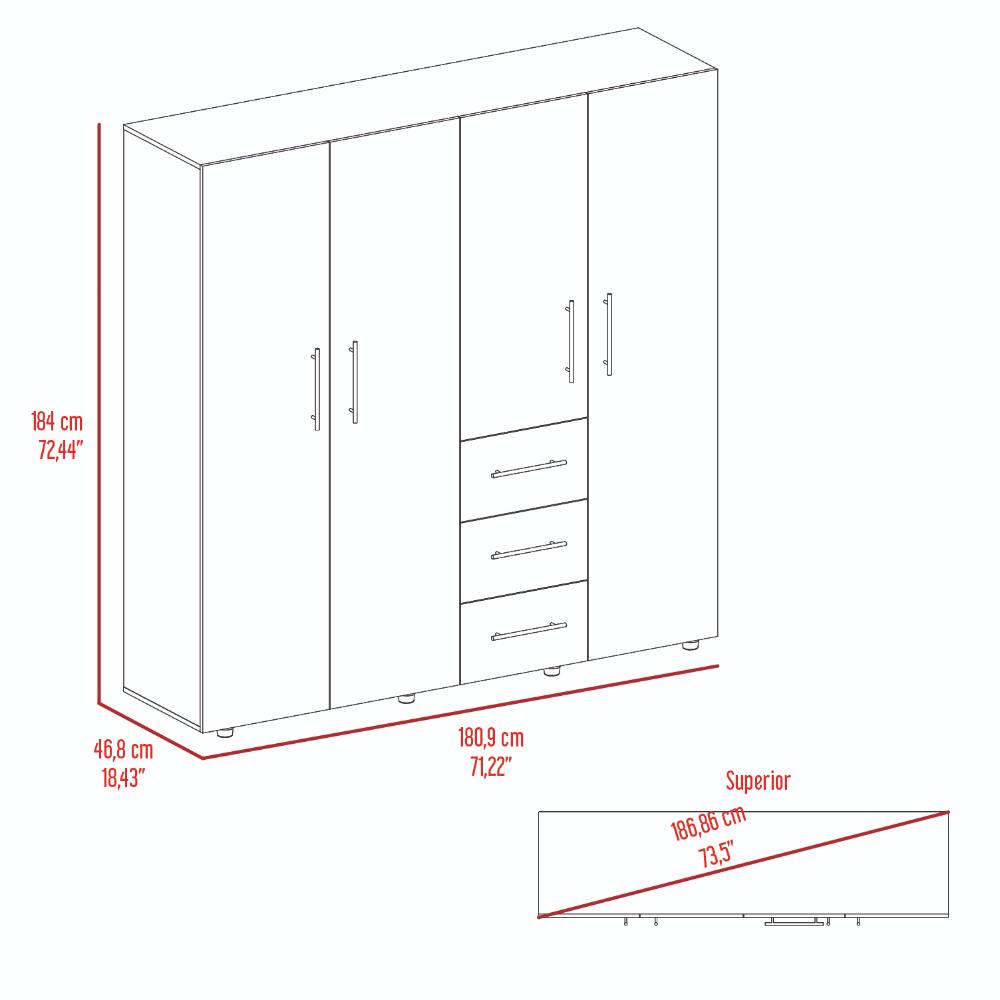Closet , con 3 tubo cromados, 3 entrepaños, 3 cajones y 4 puertas batientes.
