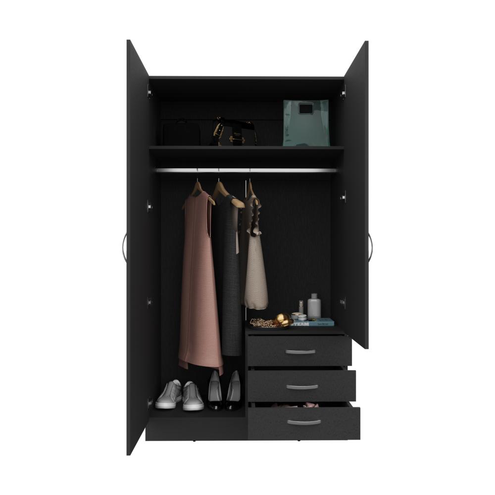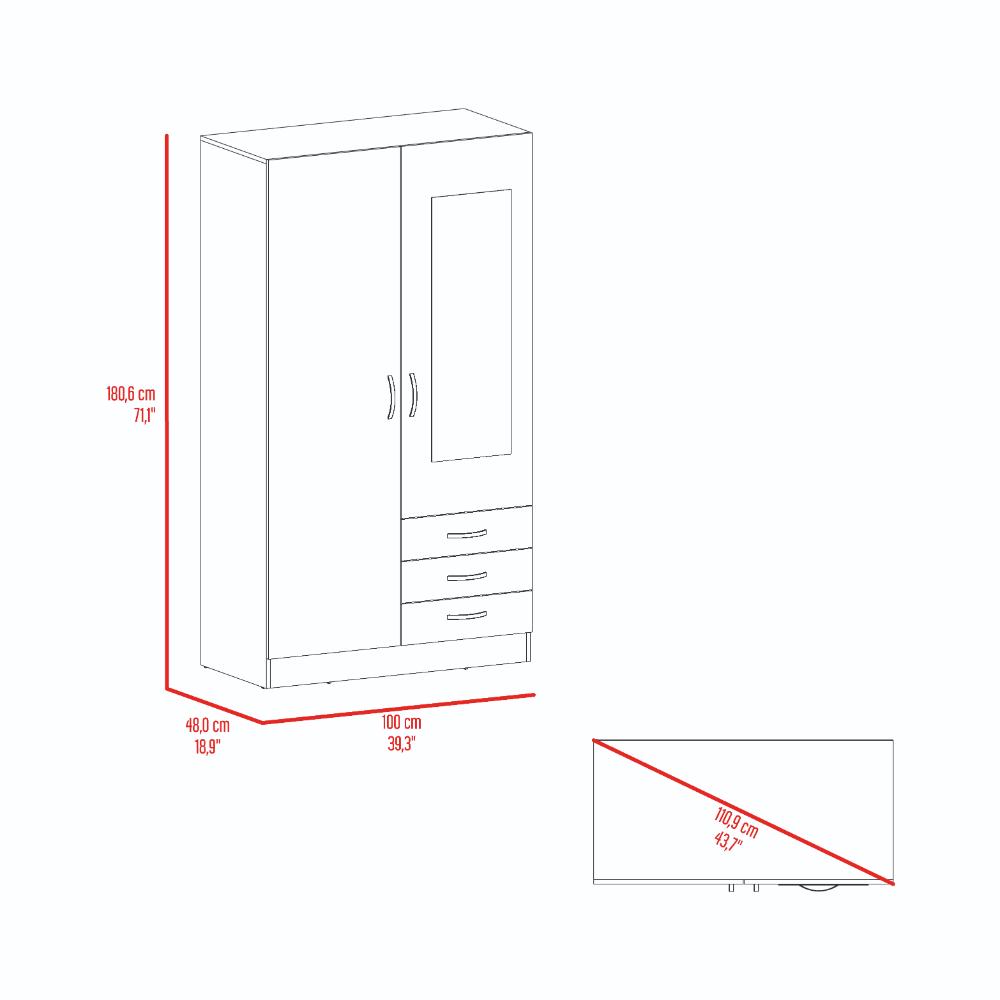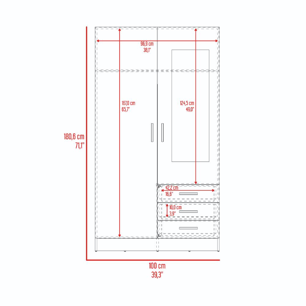 Closet, con 2 puertas abatibles, 3 cajones, cuenta con diversos espacio para ropa y accesorios, incluye espejo con medidas de 90x30 cm, y es de facil instalación.