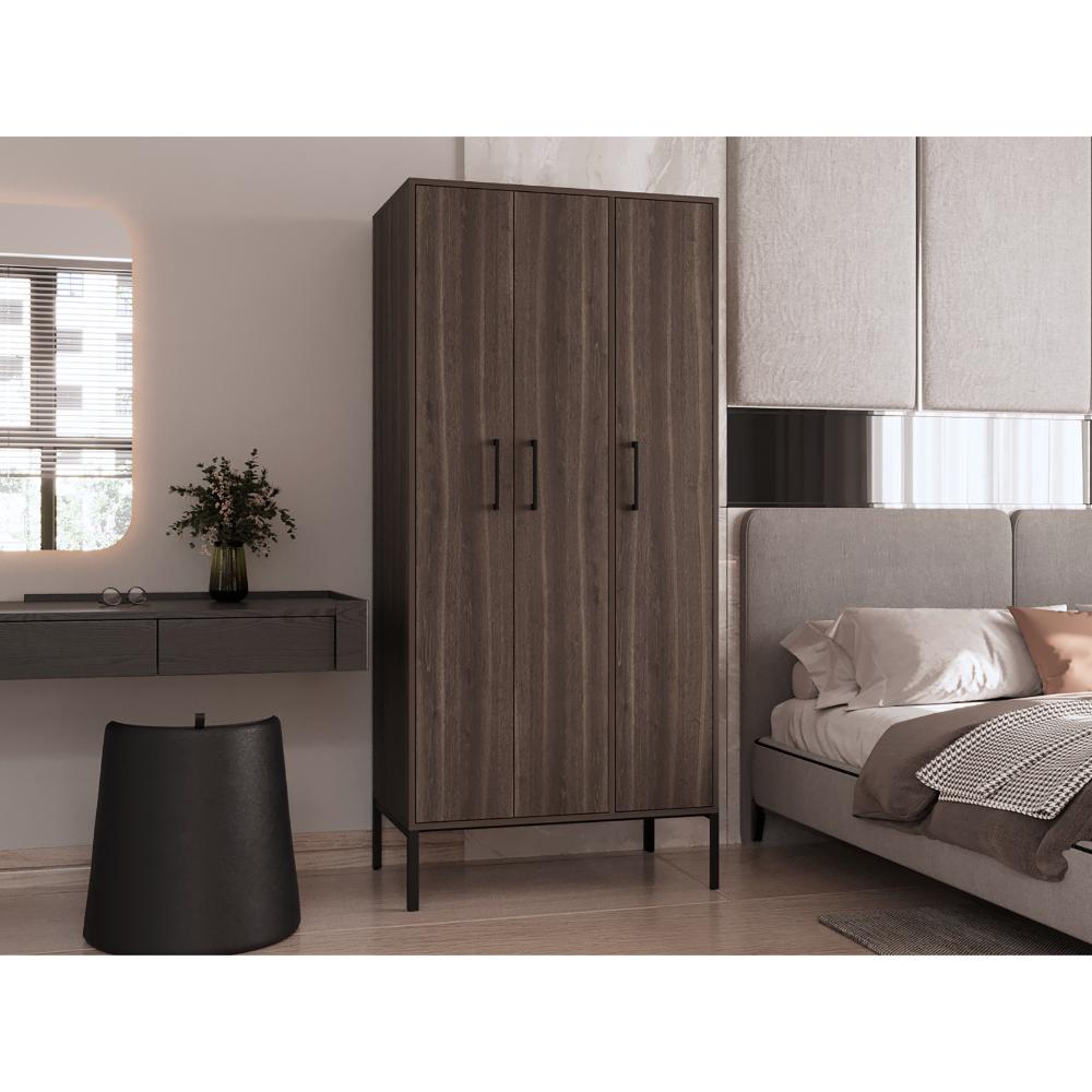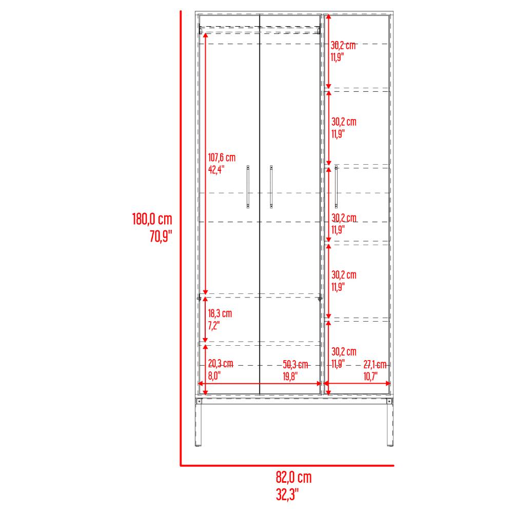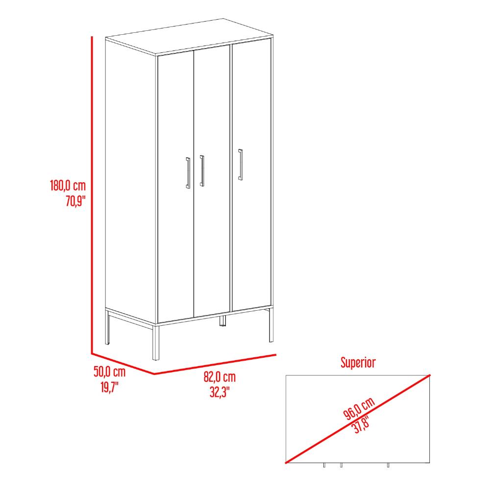 Closet, con tres puertas abatibles, un tubo para colgar ropa, manijas y patas metálicas.