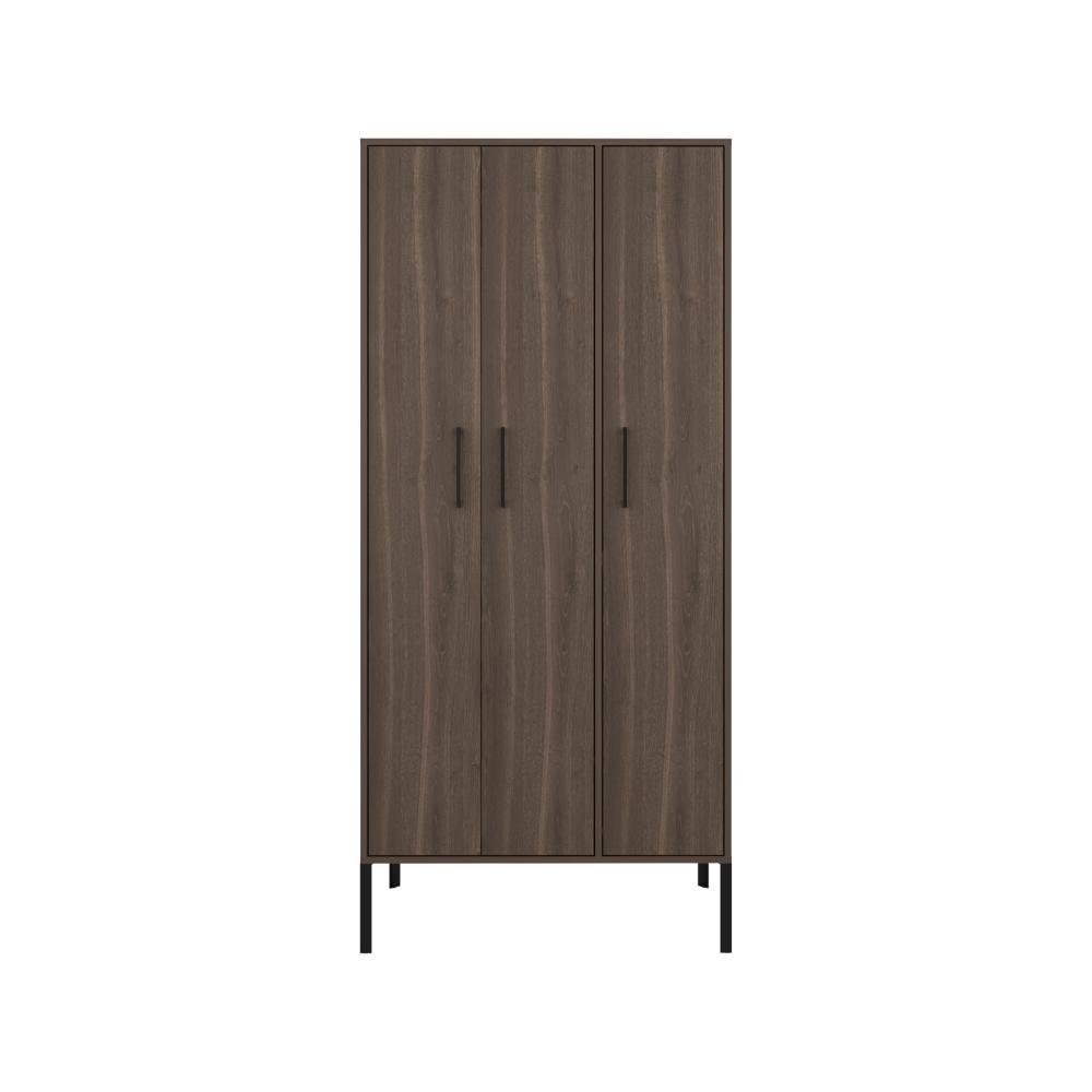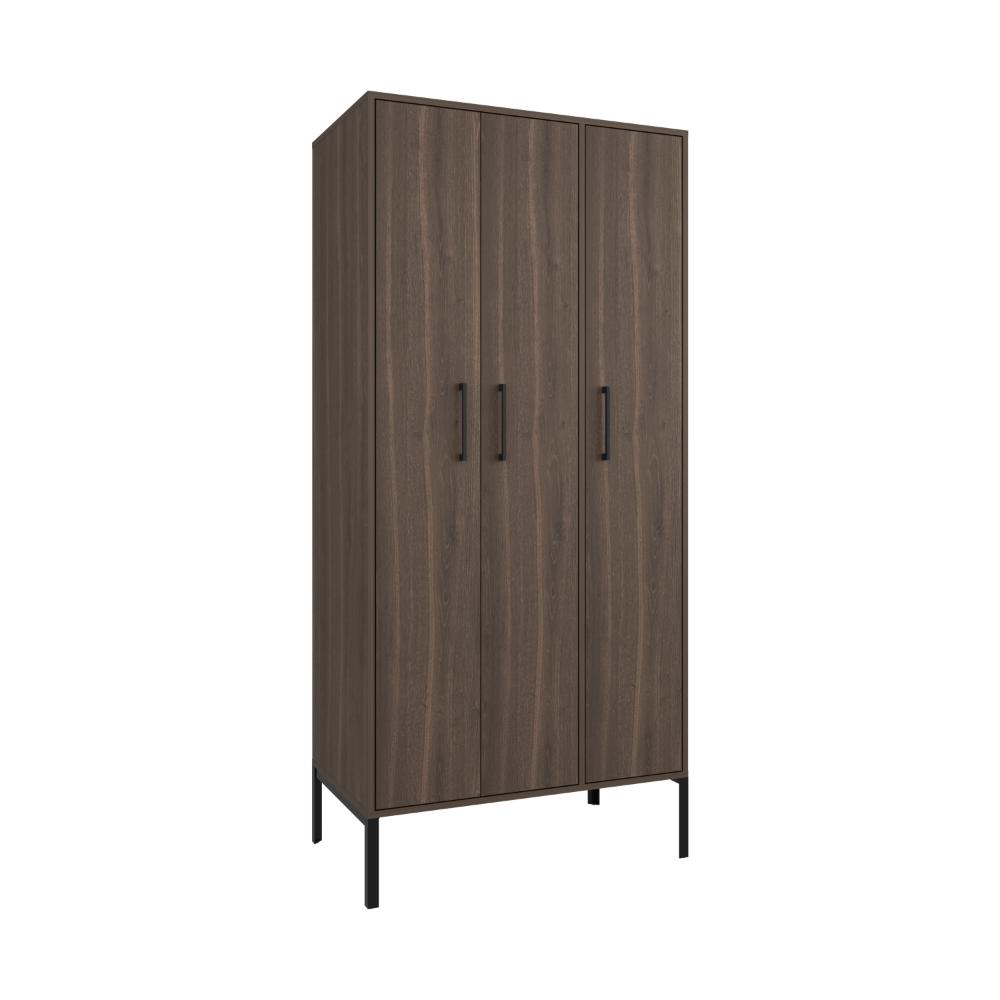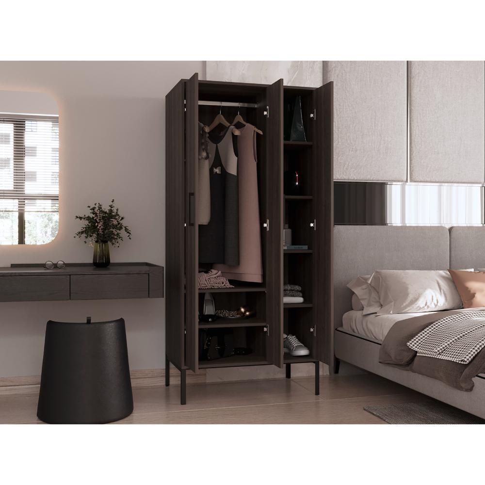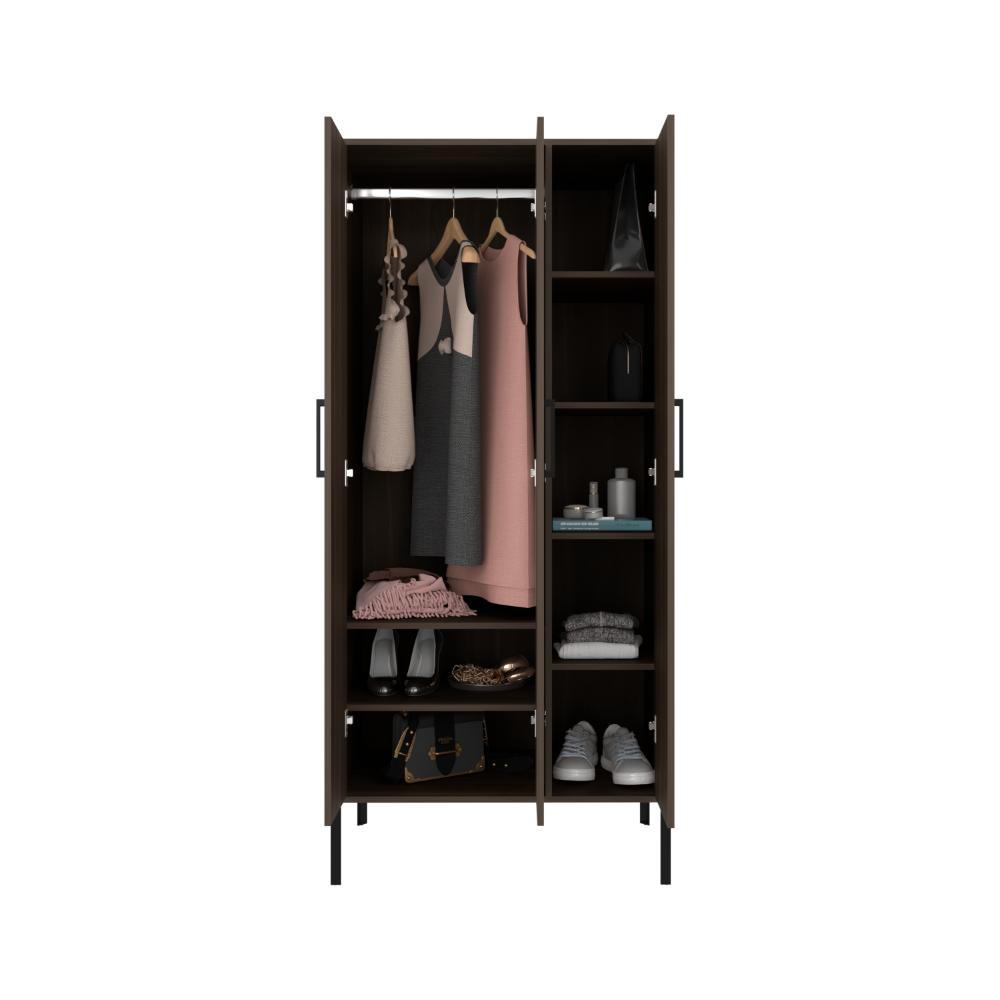 Closet, con tres puertas abatibles, un tubo para colgar ropa, manijas y patas metálicas.