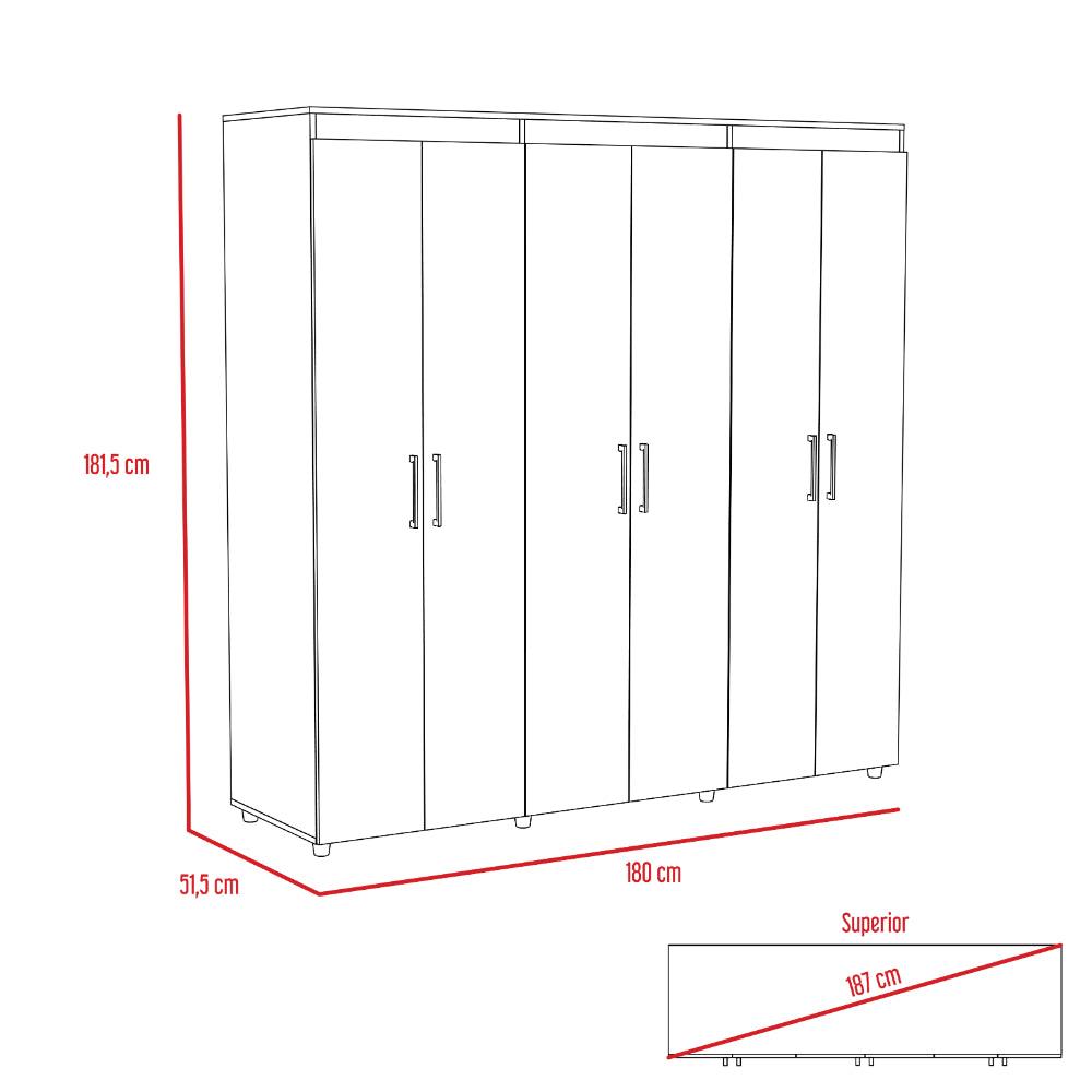 Closet, con amplios espacios para organizar, diseño funcional con seis puertas abatibles y dos cajones, multiusos con correderas metálicas, tubos para colgar y ordenar ropa, manijas metálicas.