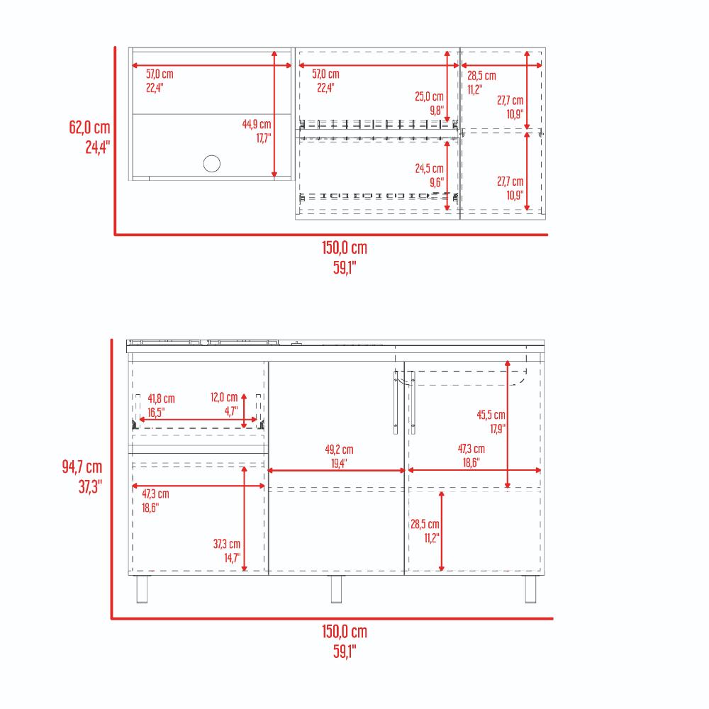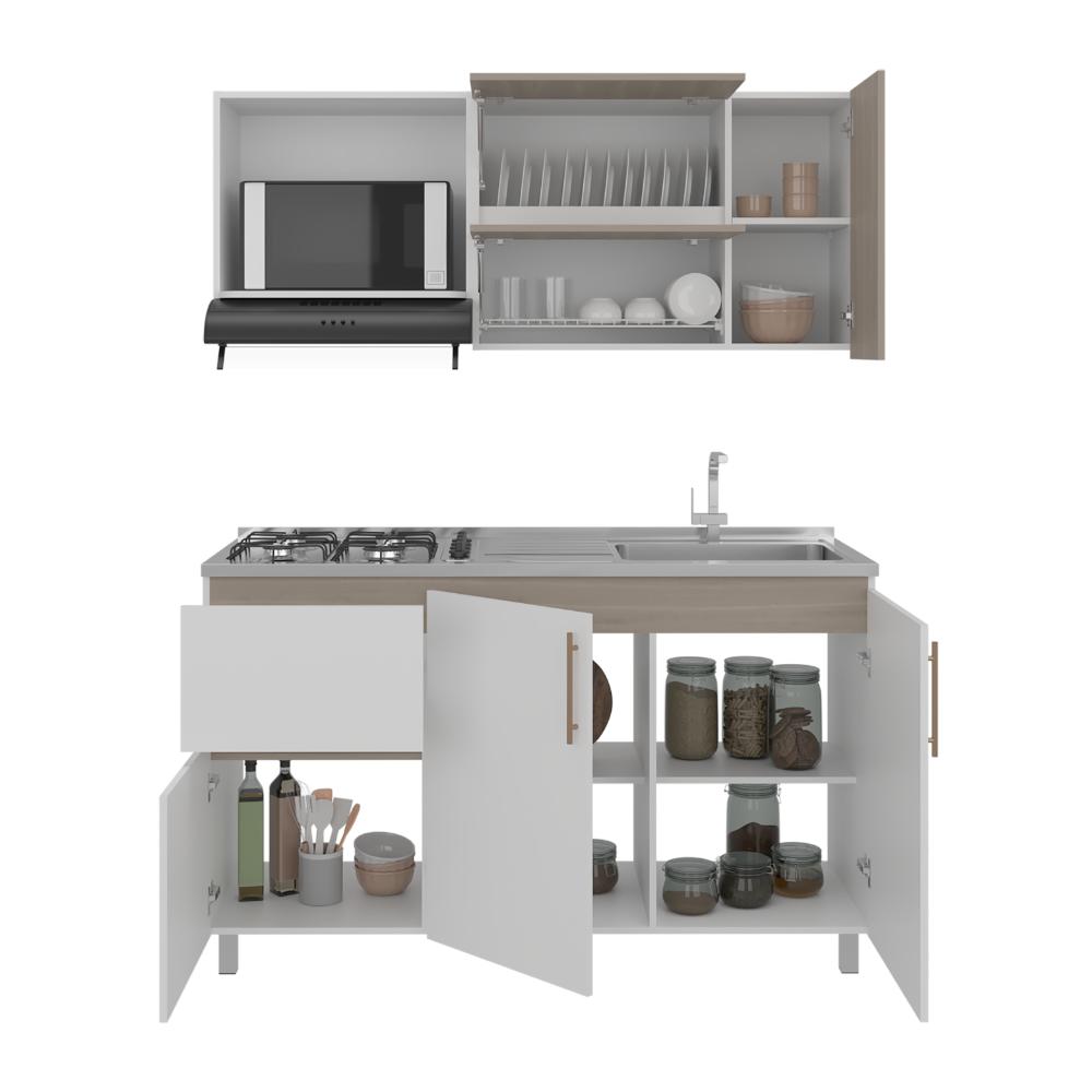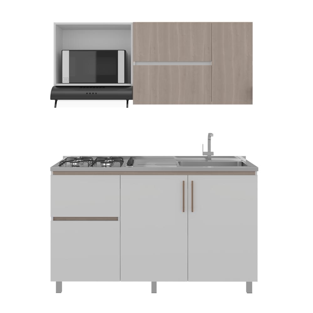 Cocina Integral, con modulo superior con 3 puertas abatibles, incluye locero y vasera, cuenta con espacio para almacenar alimentos y espacio para campana y microondas, en el modulo inferior cuenta con 3 puertas abatibles, 1 cajón, manijas, patas metálicas e incluye mesón derecho. *INCLUYE MESÓN*