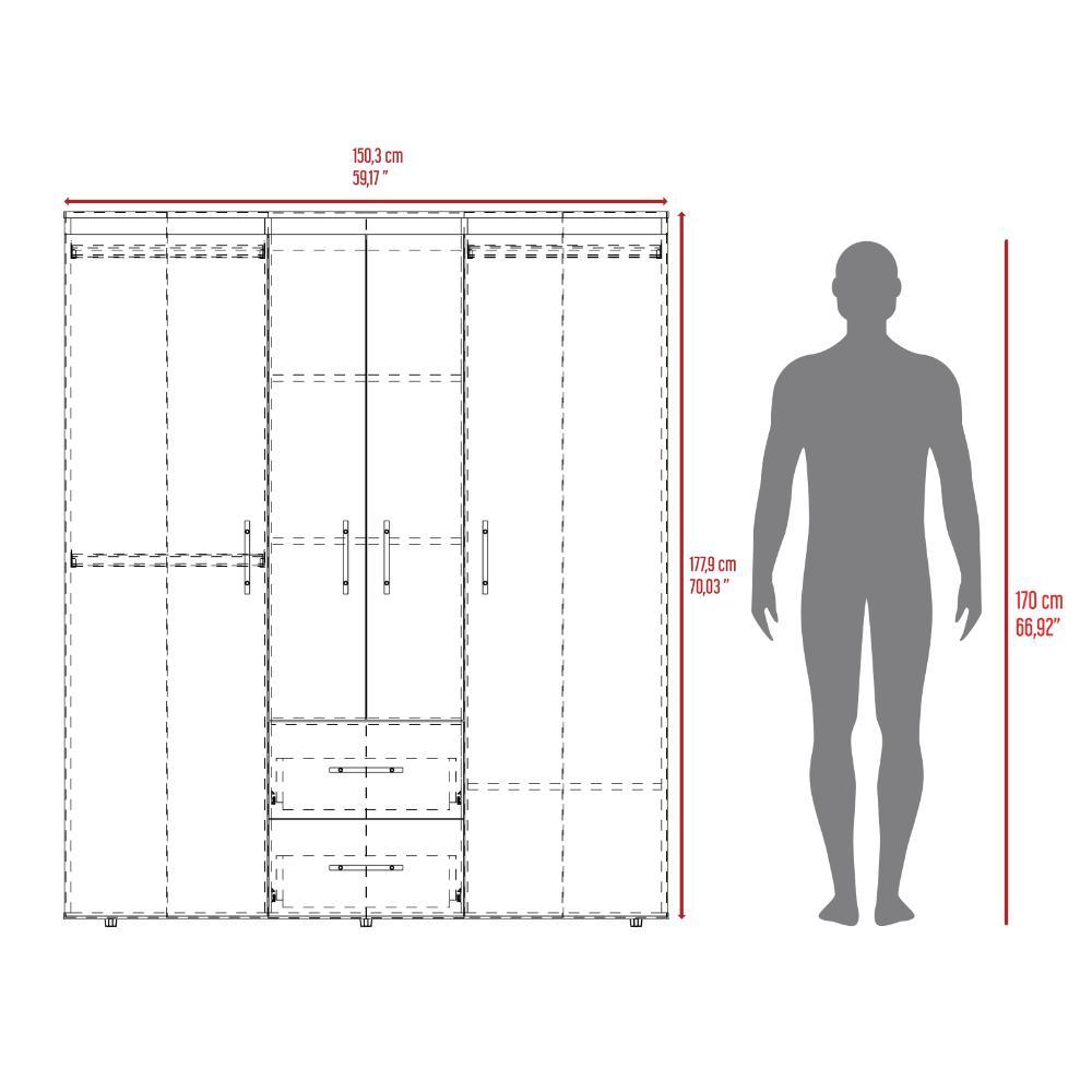 Closet, con 4 puertas batientes, 2 cajones deslizables, 3 tubos pata colgar ropa y amplios espacios de guardado.