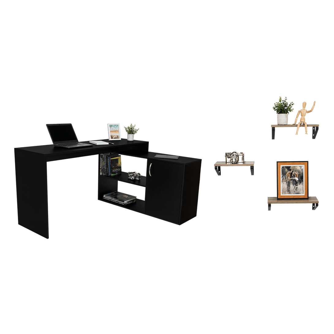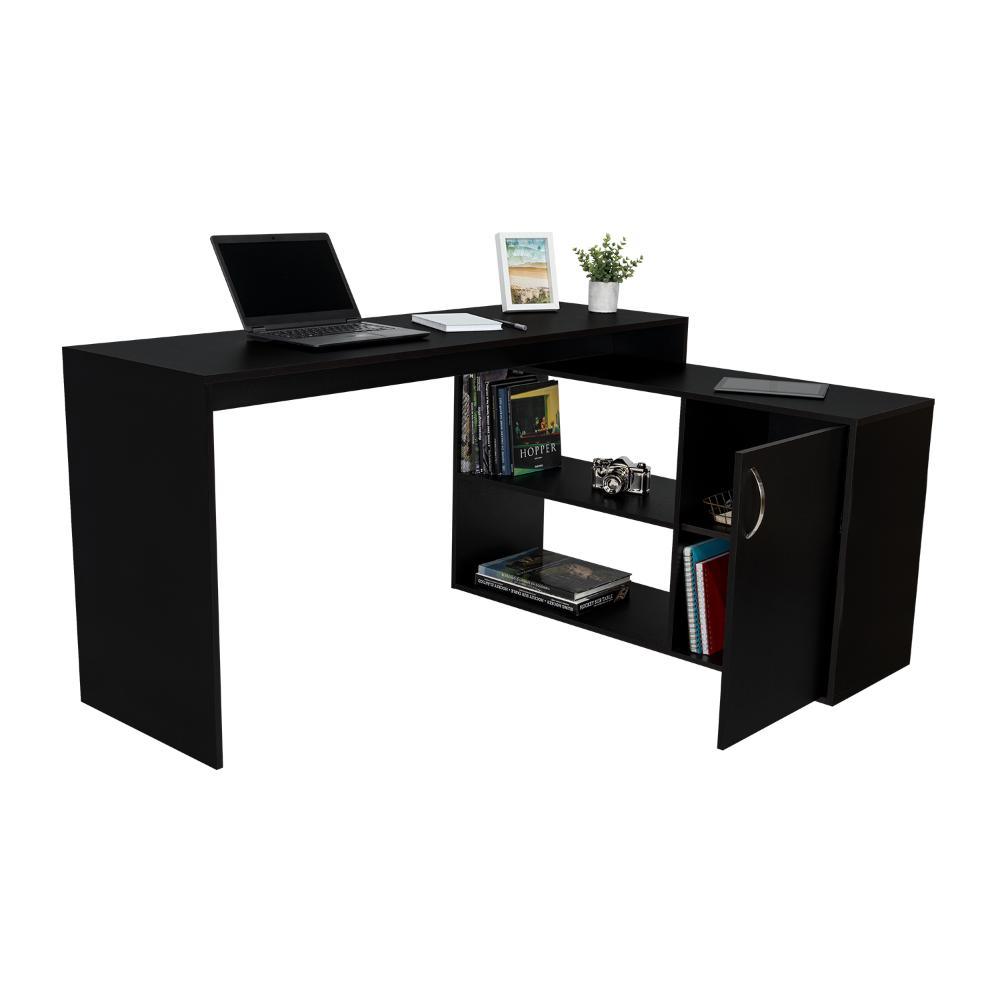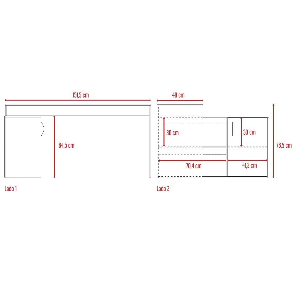 Escritorio en L, cuenta con amplia superficie de trabajo y el eje de lateral tiene amplios entrepaños para ubicar libros u otros elementos de trabajo y estudio, y un práctico espacio con puerta para almacenar múltiples objetos. Ideal para el hogar o la oficina, incluye manual para ensamble.