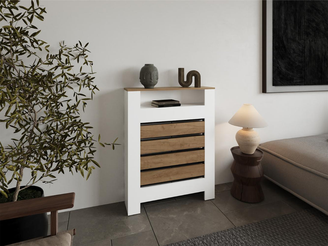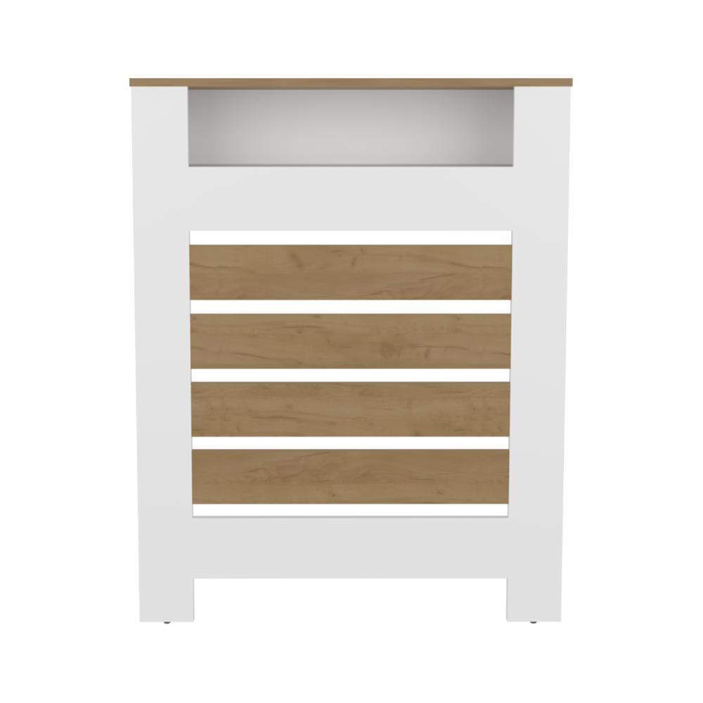 Cubierta para Radiador Mistral, Blanco Duqueza y Fresno Europeo, cuenta con espacio para colocar objetos decorativos ZF