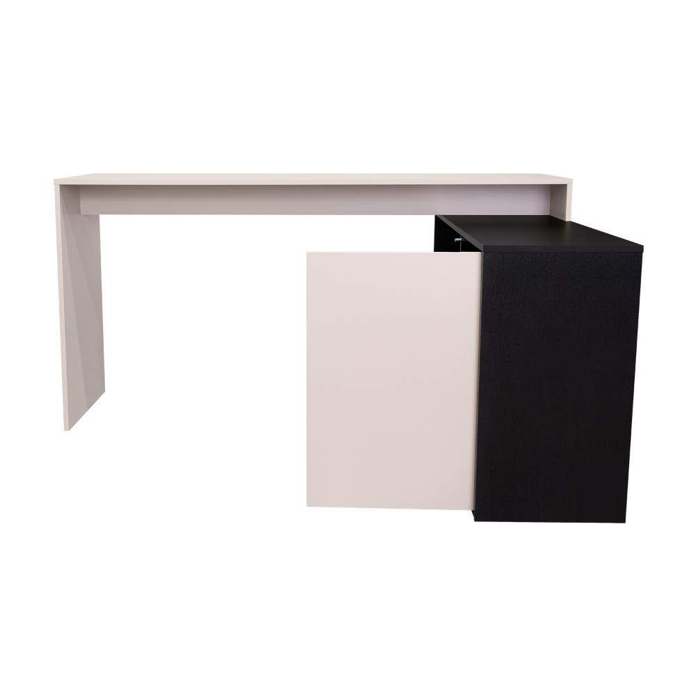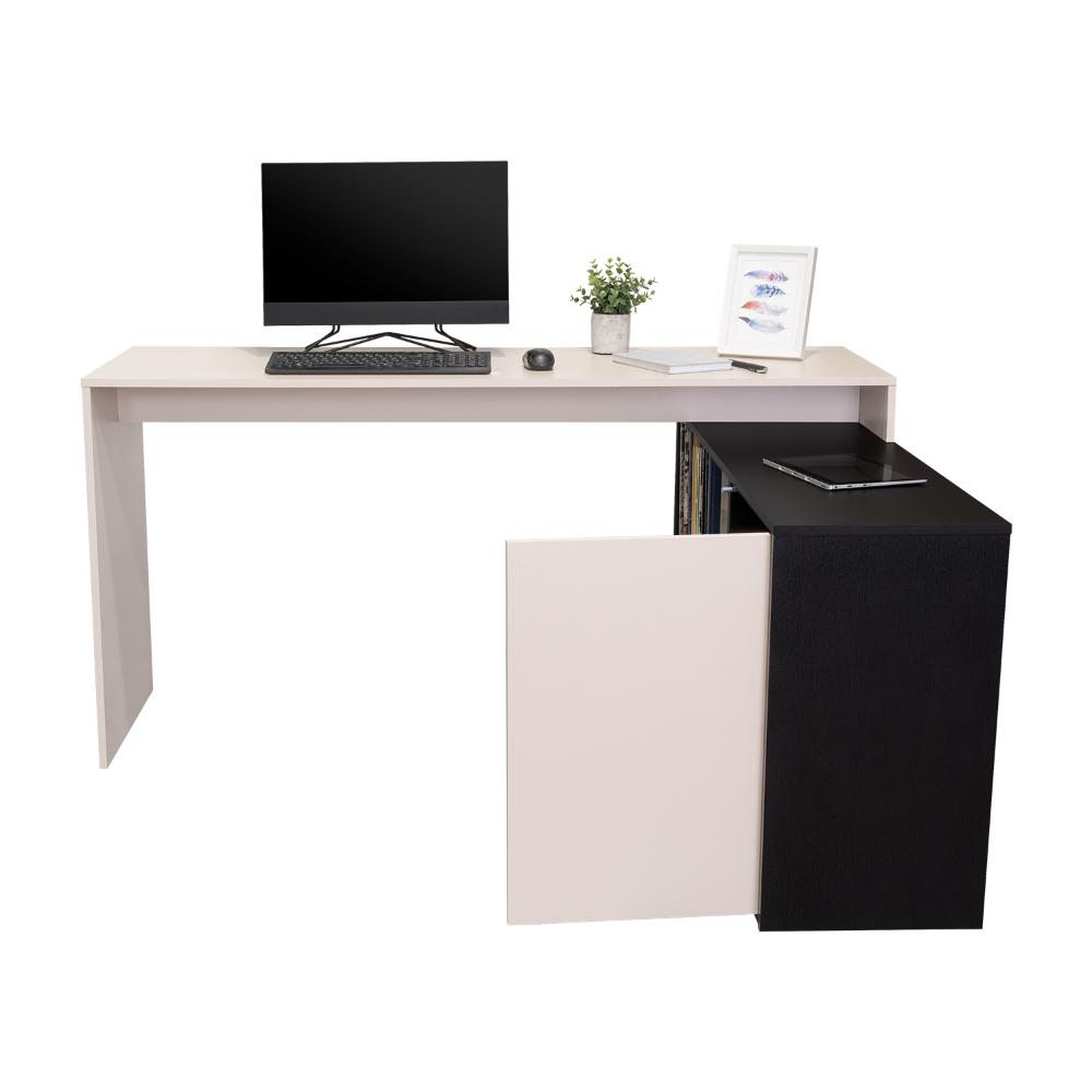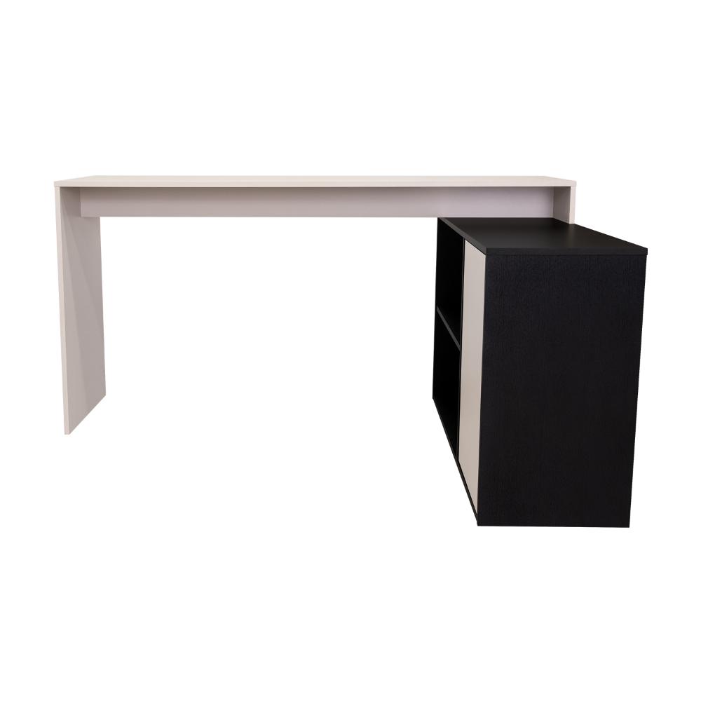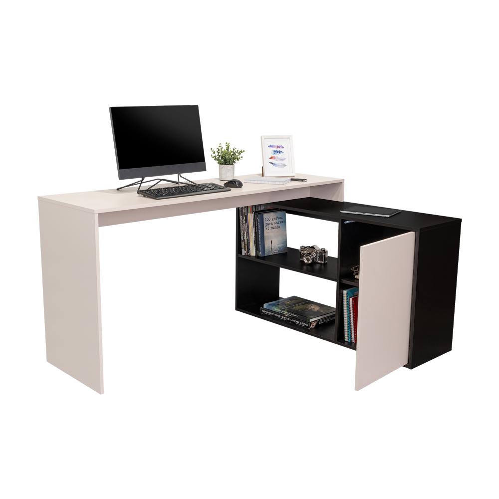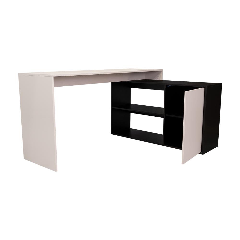 Escritorio, forma en L, espacio con forma batiente para almacenar y otros, compartimento para objetos de estudio o decorativos.