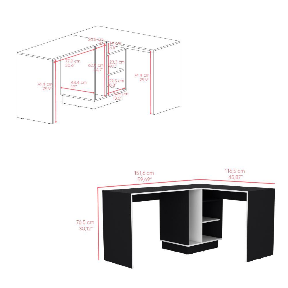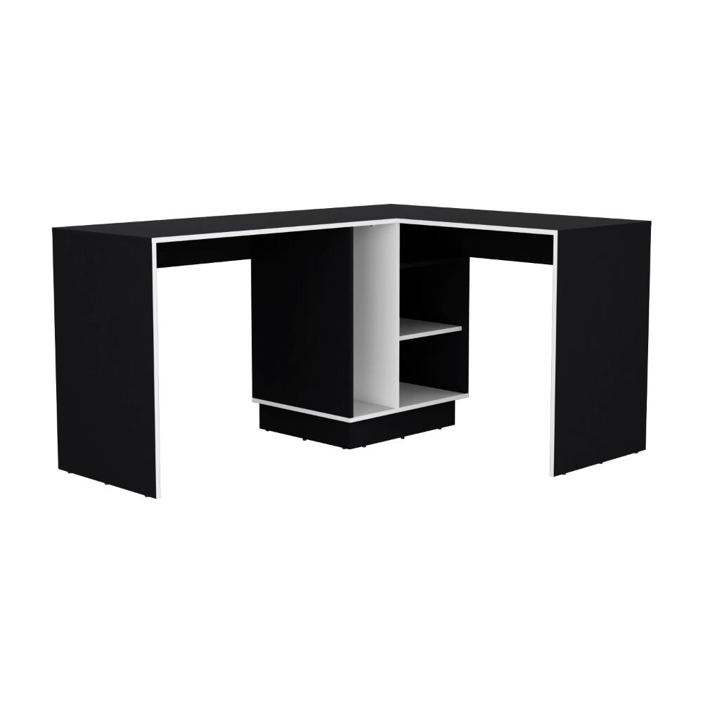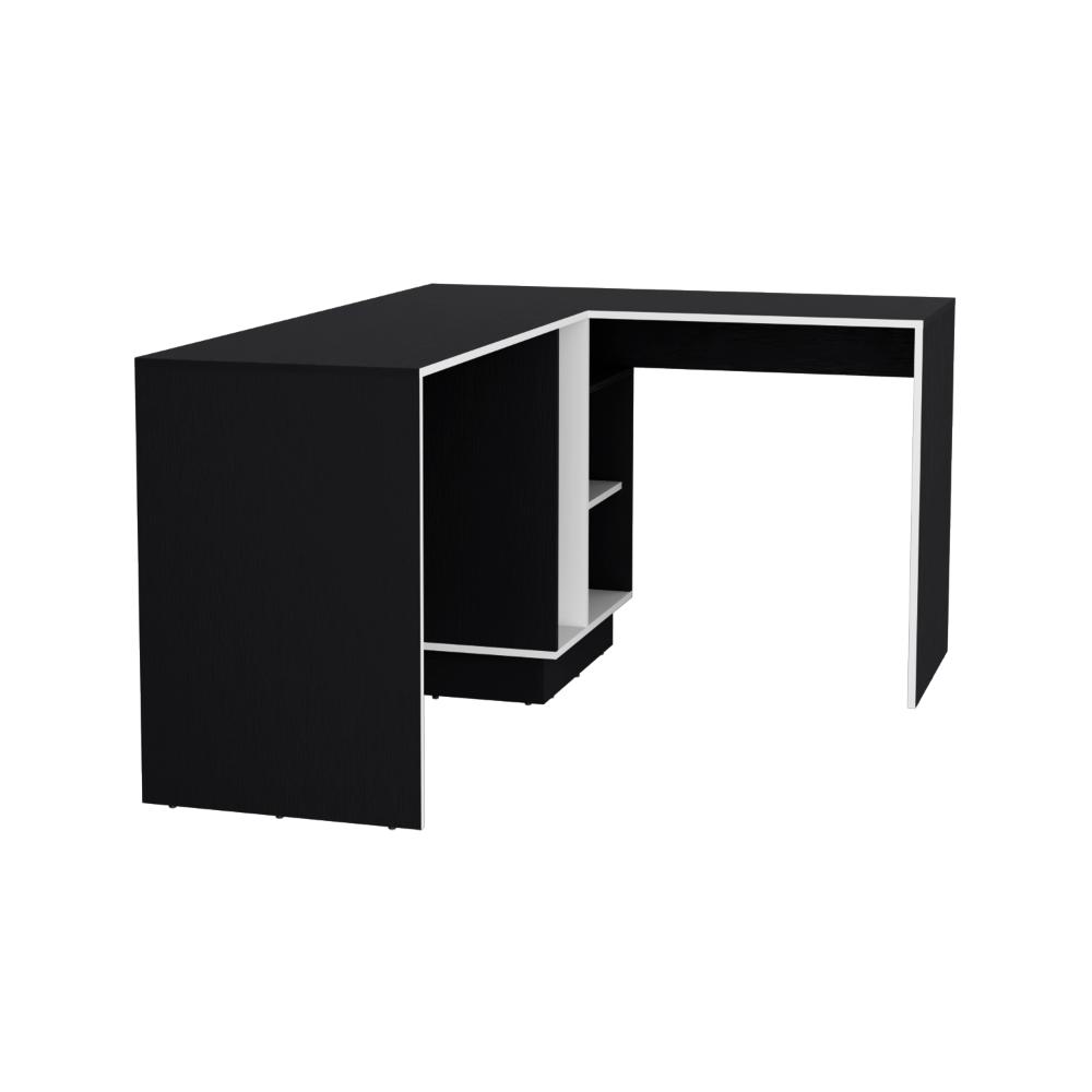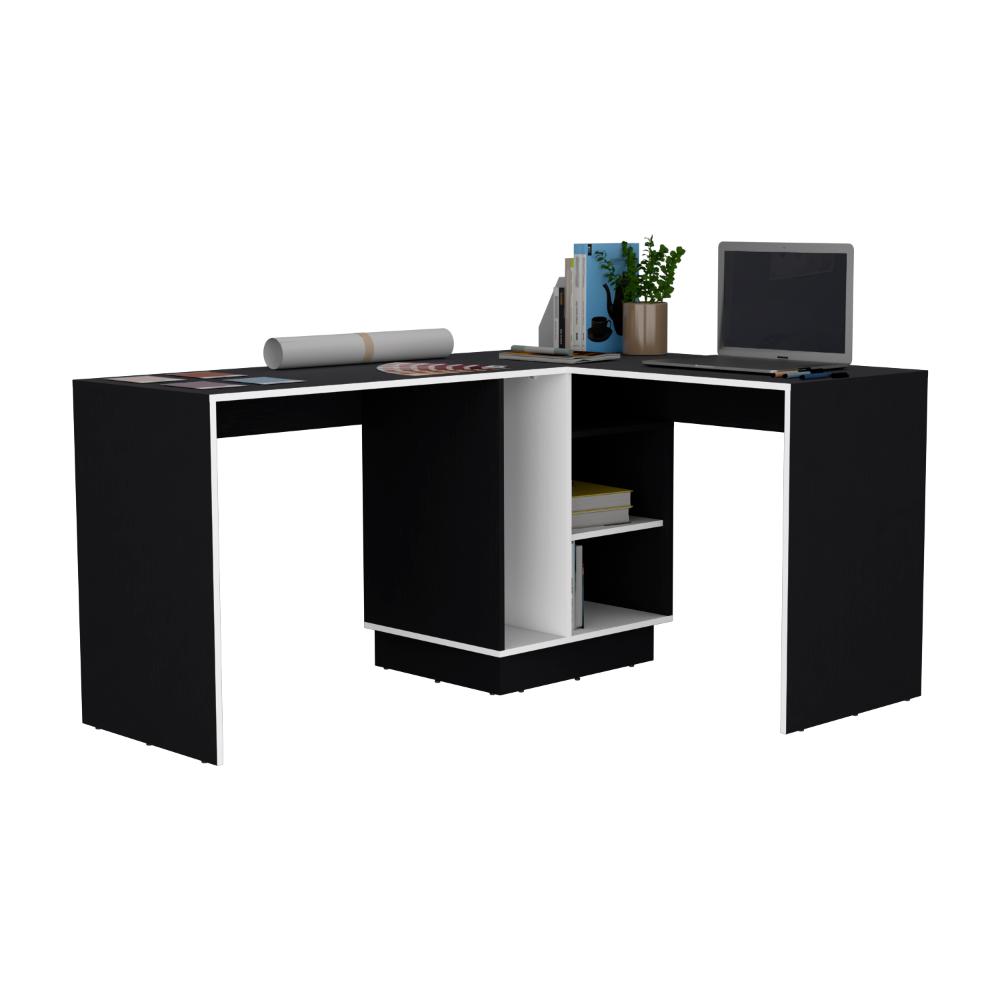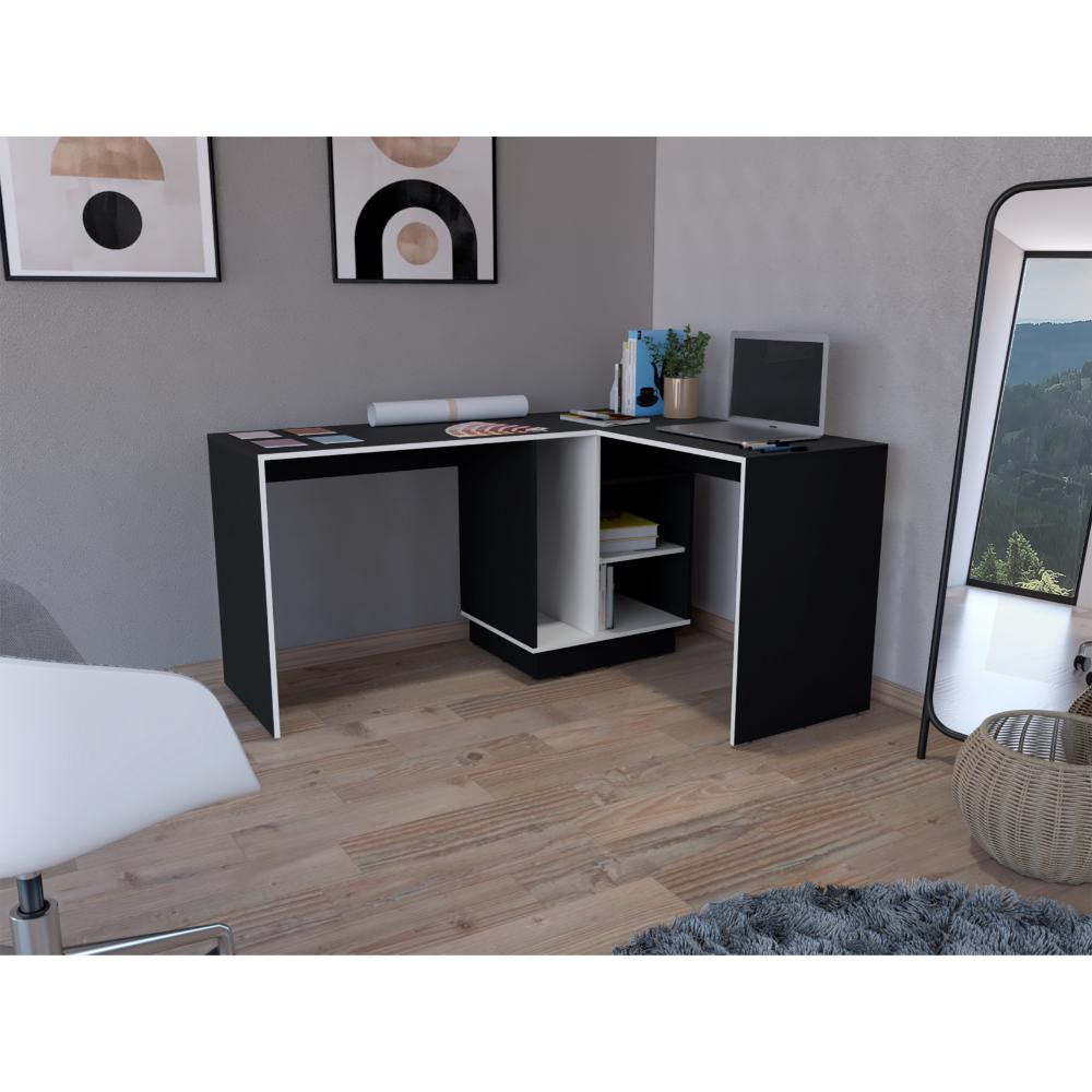 Escritorio e L, espacio para objetos decorativos, amplia superficie de trabajo, combinacion de colores.