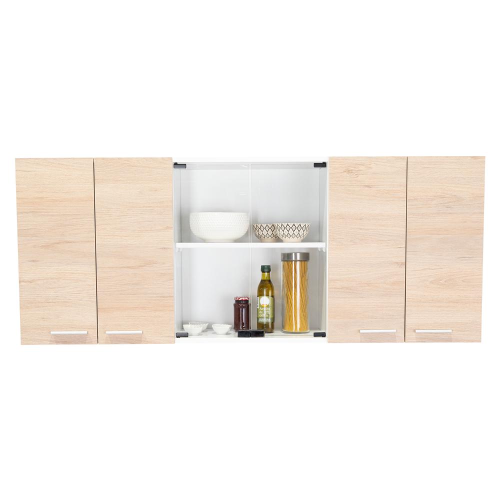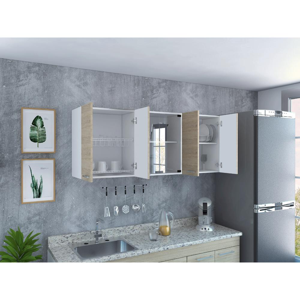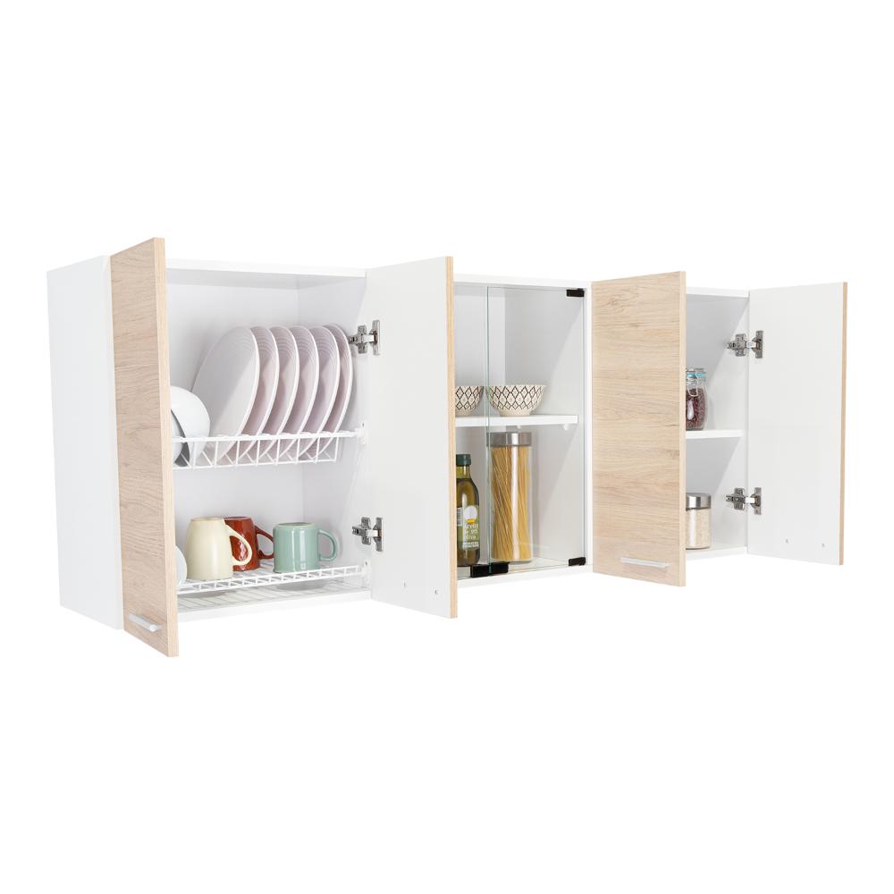 Gabinete Superior, con amplios espacios para guardar utensilios de cocina o alimentos, 4 puertas abatibles, manijas metálicas, entrepaño móvil central, e incluye dos puertas centrales de vidrio,