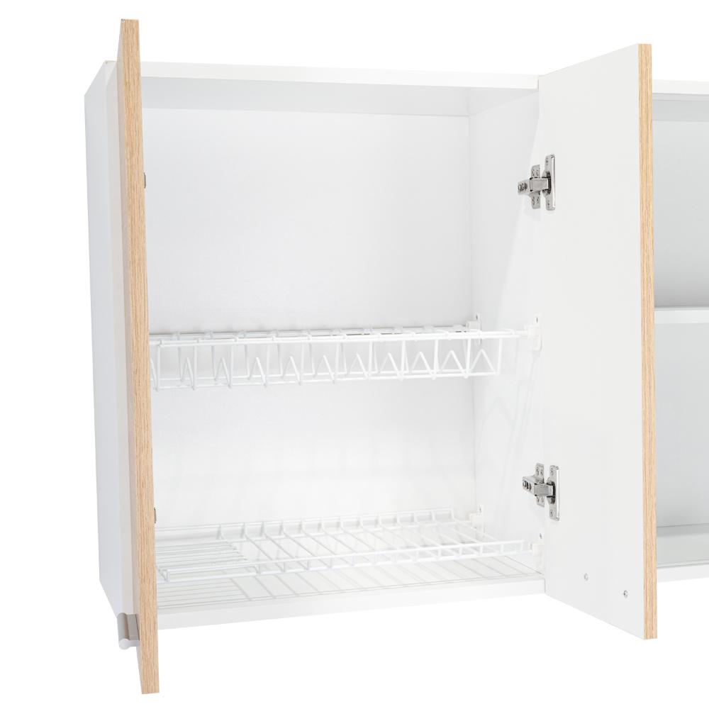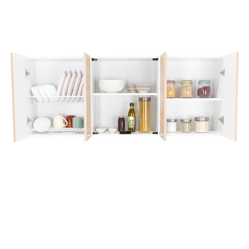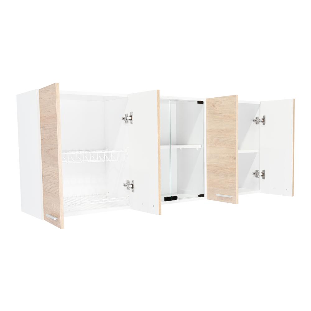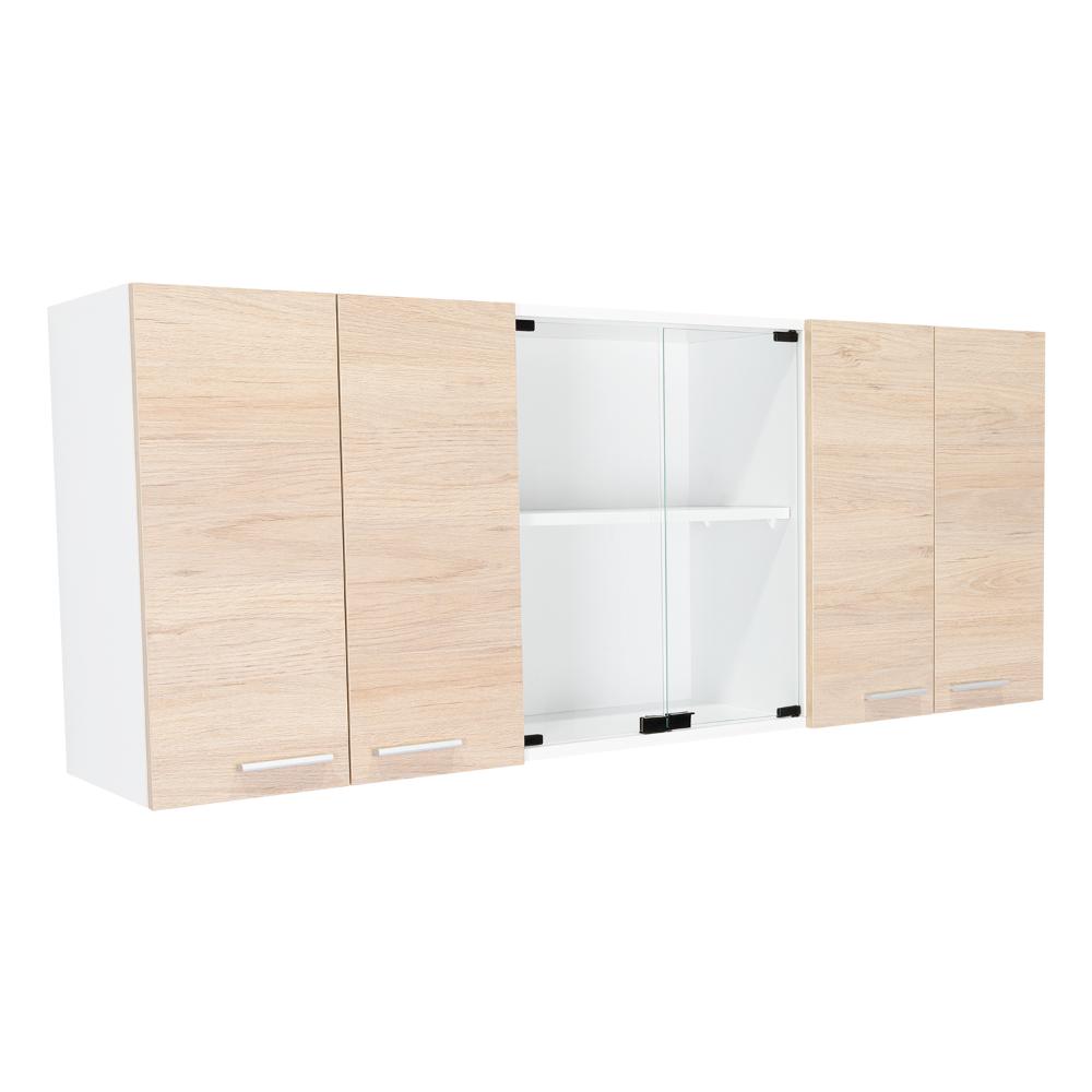 Gabinete Superior, con amplios espacios para guardar utensilios de cocina o alimentos, 4 puertas abatibles, manijas metálicas, entrepaño móvil central, e incluye dos puertas centrales de vidrio,