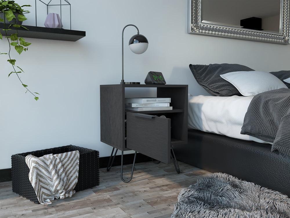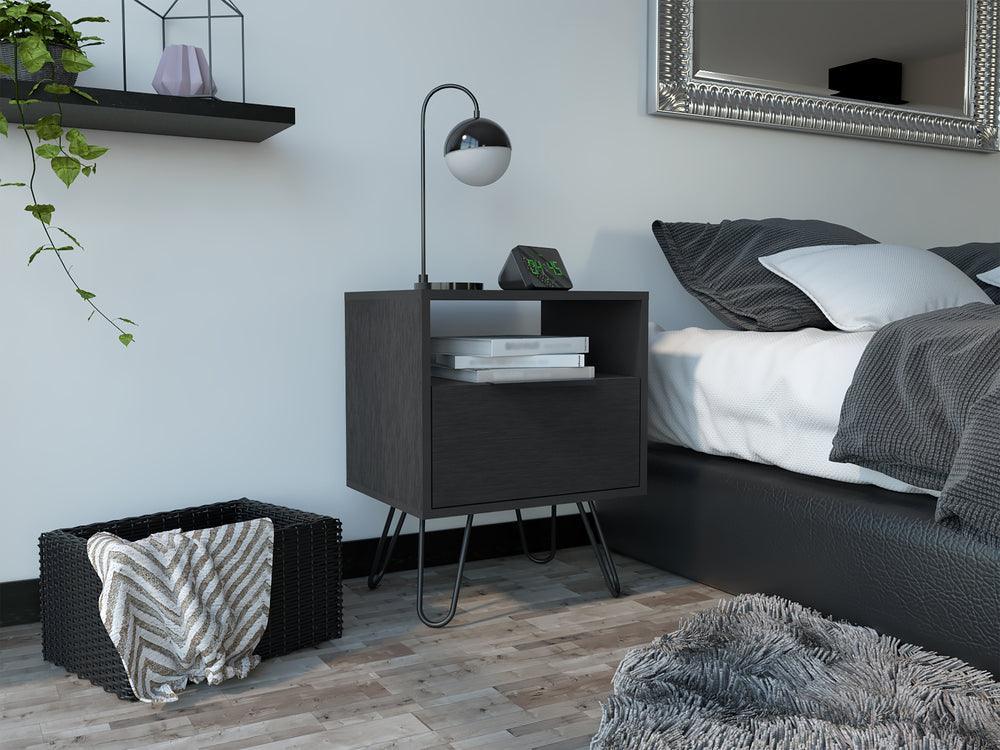Mesa de Noche Ali, Wengue, con Dos Cajones y Patas Metalicas X2