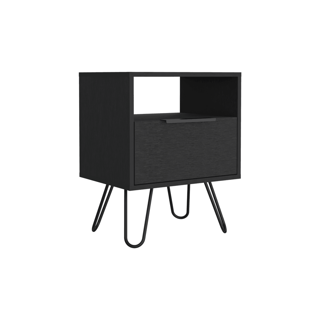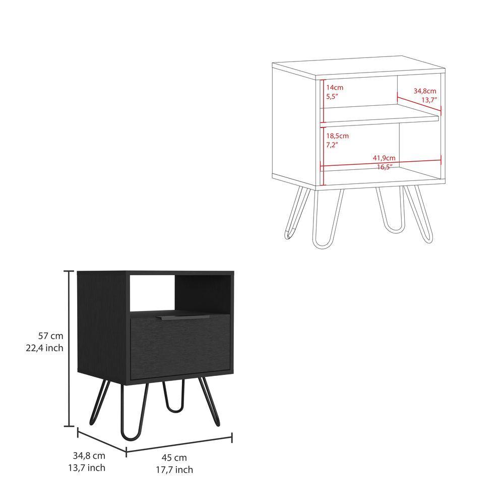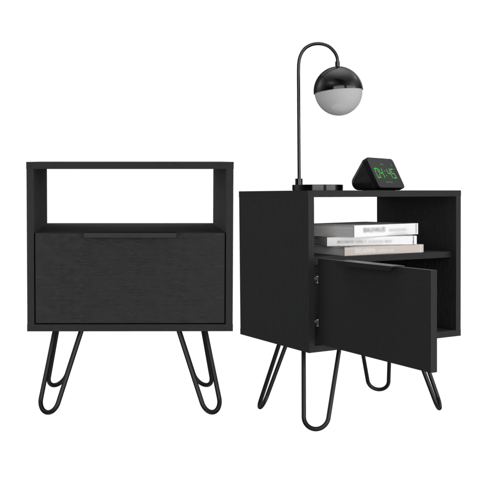 Mesa de Noche, con dos cajones, patas metalicas, dos manijas. Soporta 26kg.