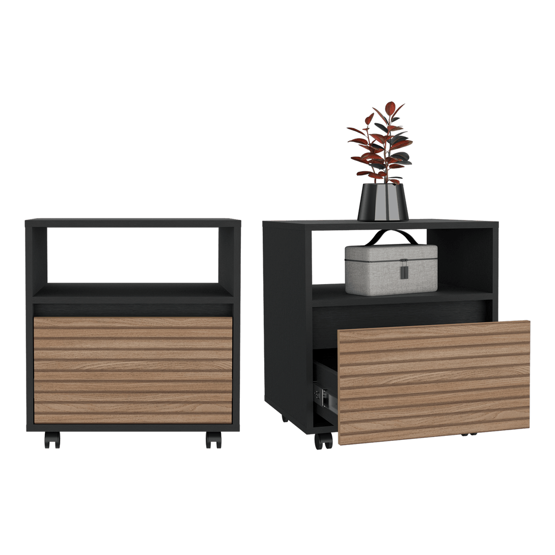 Mesa de Noche, con un cajón, fácil armado e instalación, espacio para colocar objetos decorativos, cuatro rodachinas.