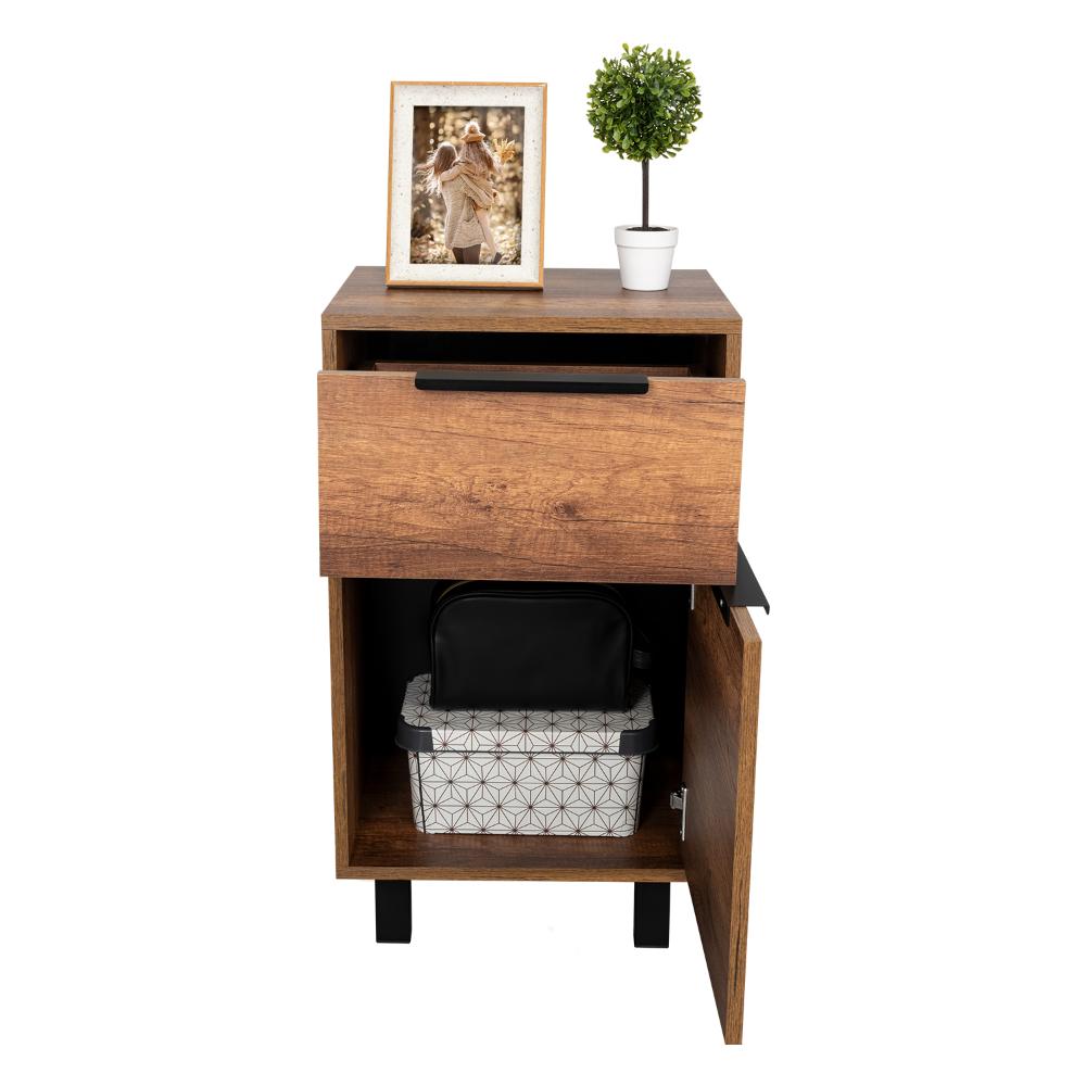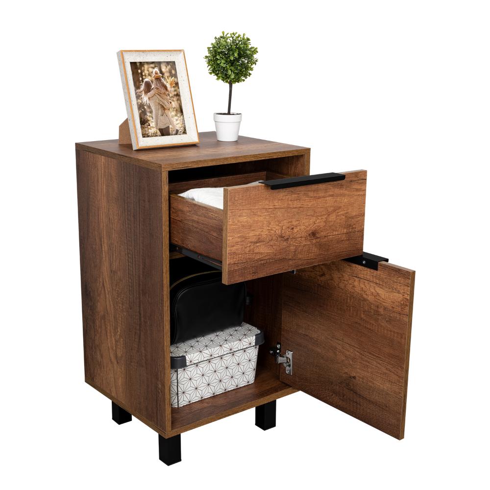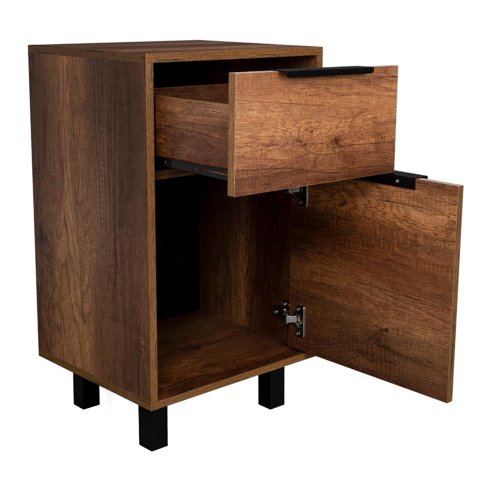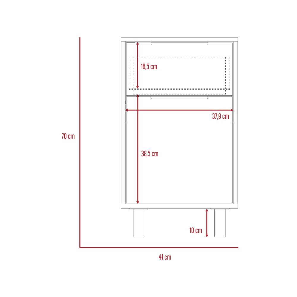 Mesa de Noche, con 1 cajón. 1 puerta batiente, patas metálicas, diseño práctico y funcional.