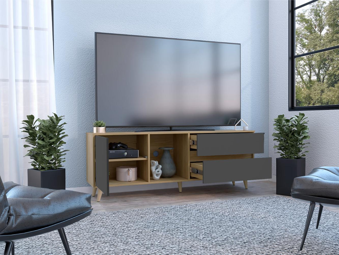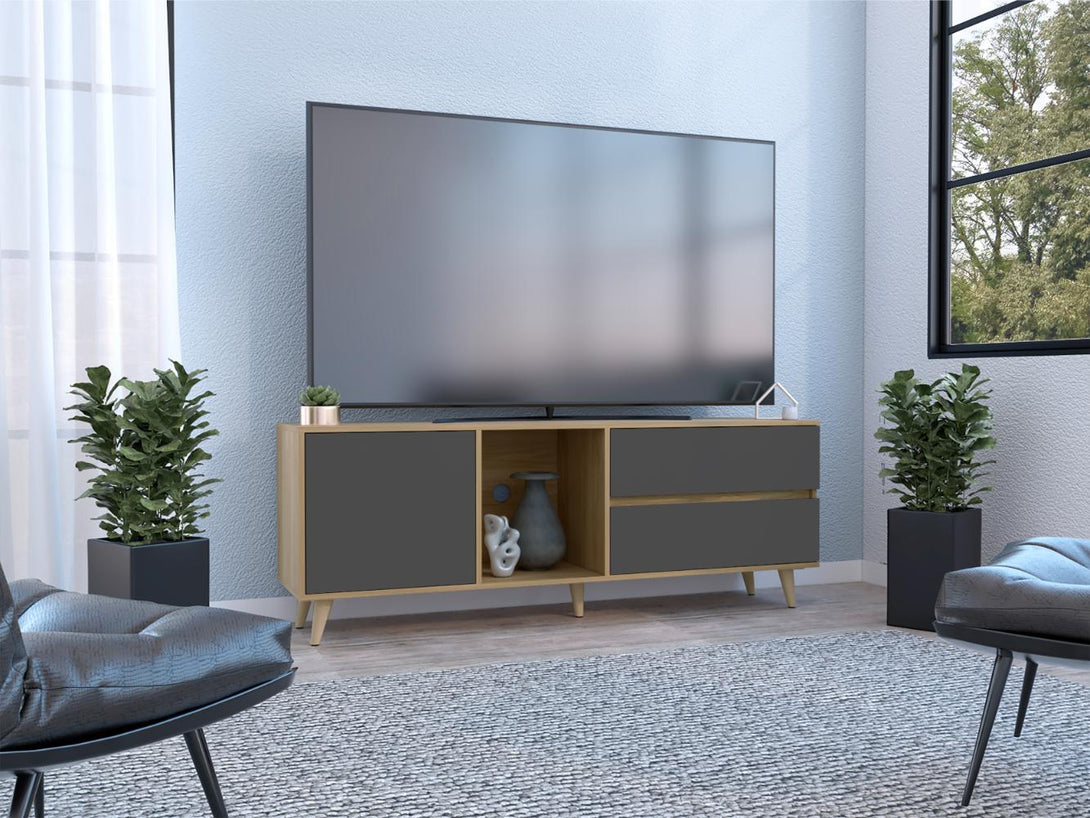 Mesa para TV, con 1 puerta abatible, 2 cajones, capacidad para televisor de hasta 65 pulgadas, espacio para consolas y dispositivos de audio y video.