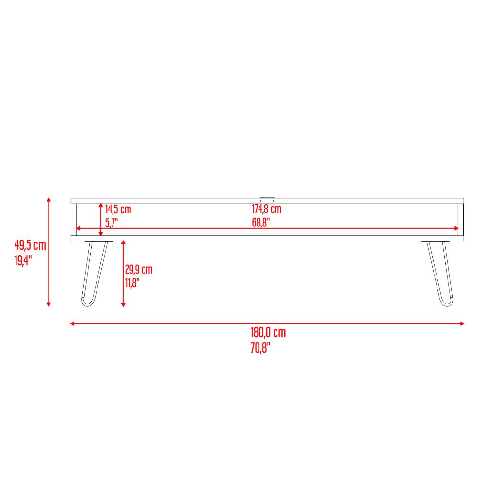 Mesa de TV, con un diseño contemporaneo, cuanta con espacio para ubicar objetos de audio de video, patas metalicas, incluye pasa cables, y con espacio de tv hasta 70 pulgadas