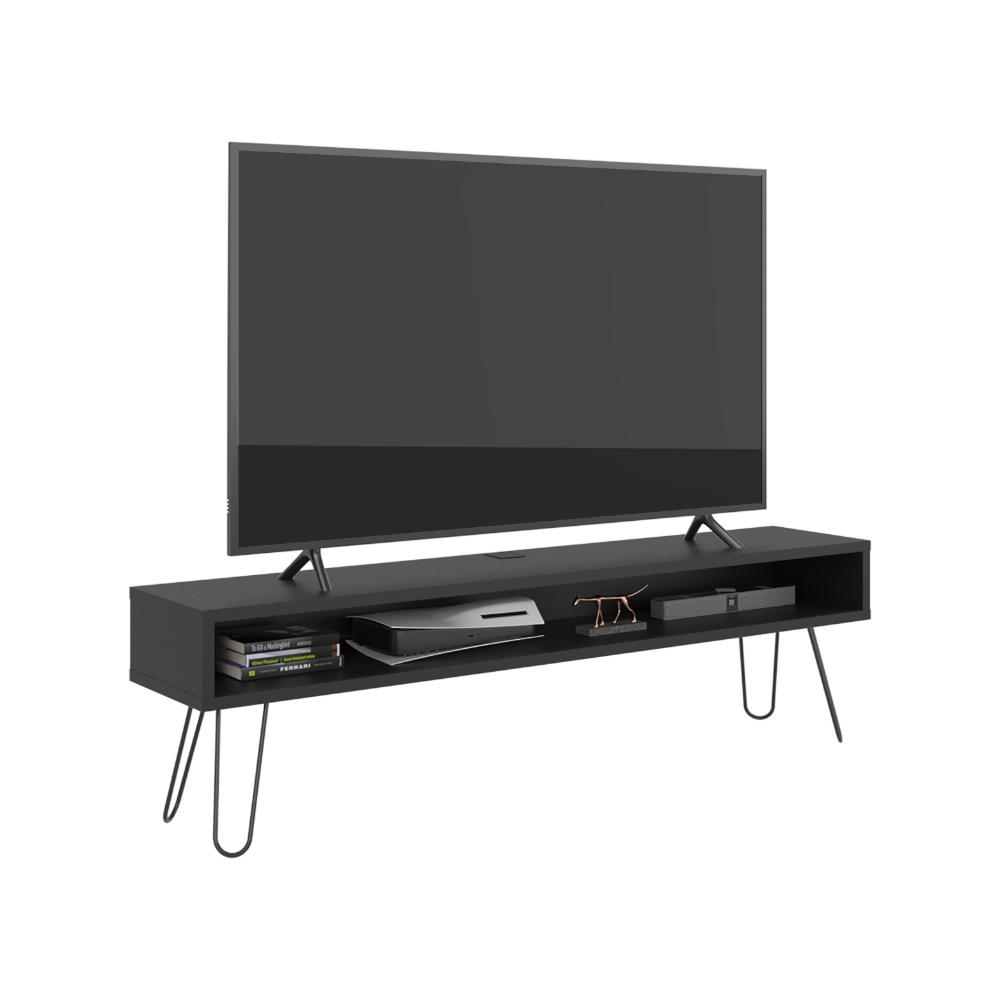 Mesa de TV, con un diseño contemporaneo, cuanta con espacio para ubicar objetos de audio de video, patas metalicas, incluye pasa cables, y con espacio de tv hasta 70 pulgadas