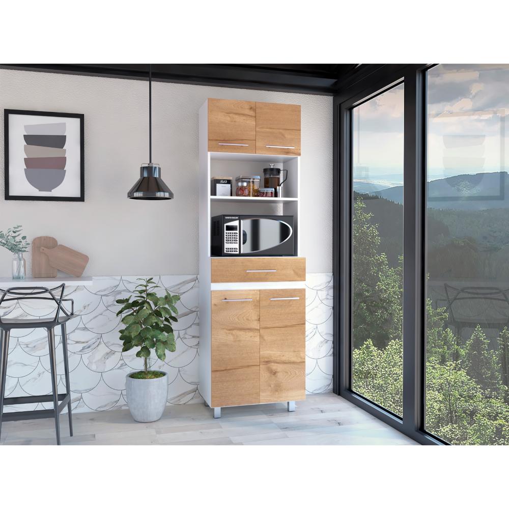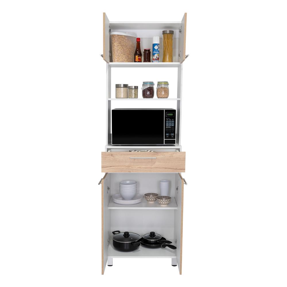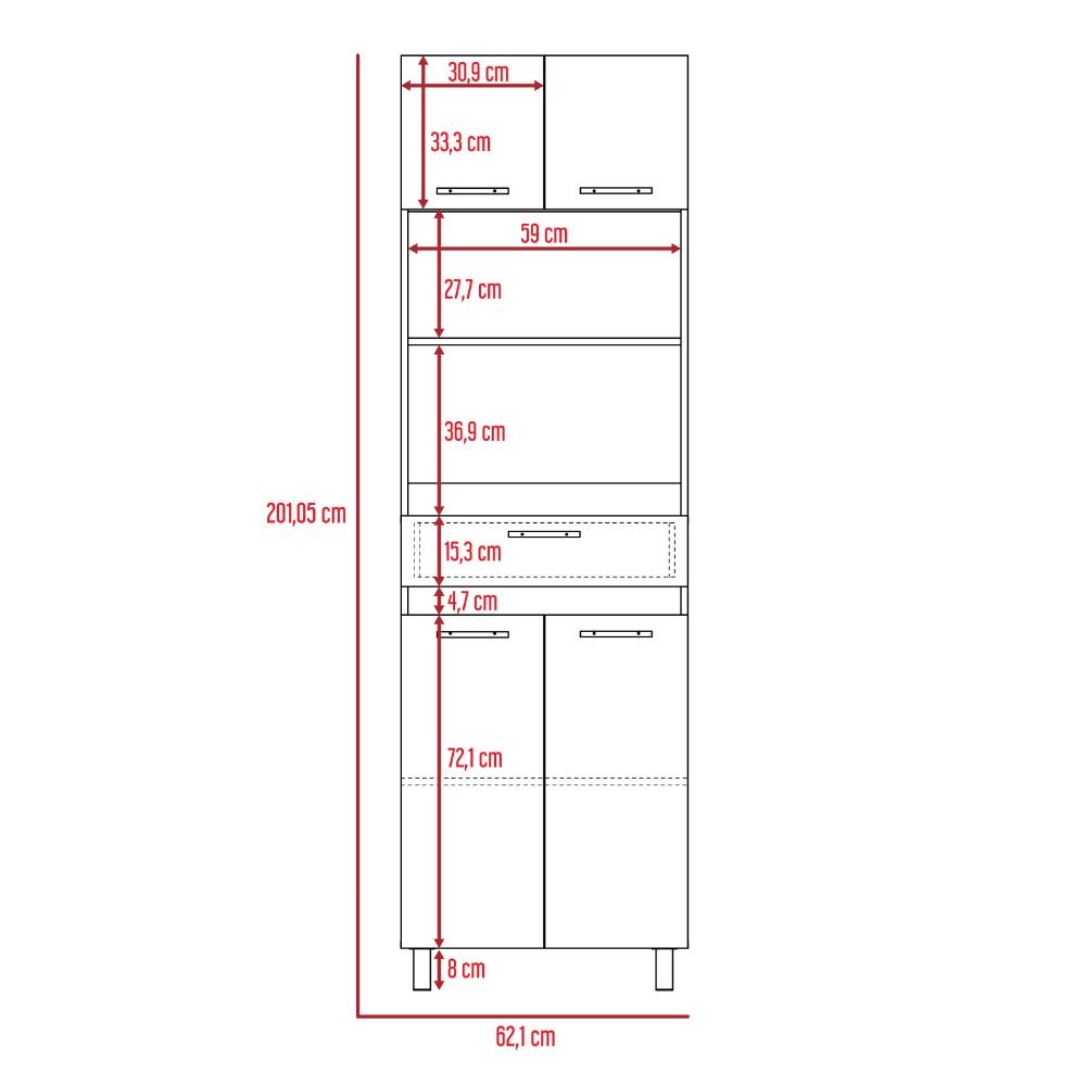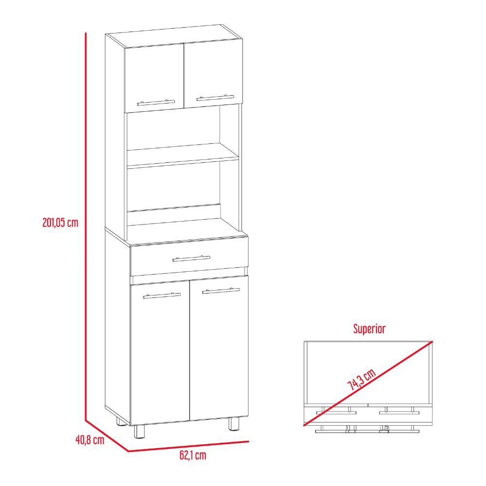 Módulo Microondas, con espacio para horno microondas, 4 puertas abatibles, compartimientos superiores e inferiores para guardar alimentos, utensilios de cocina y/u otros, manijas metálicas, 1 cajón central multi-uso correderas deslizables.