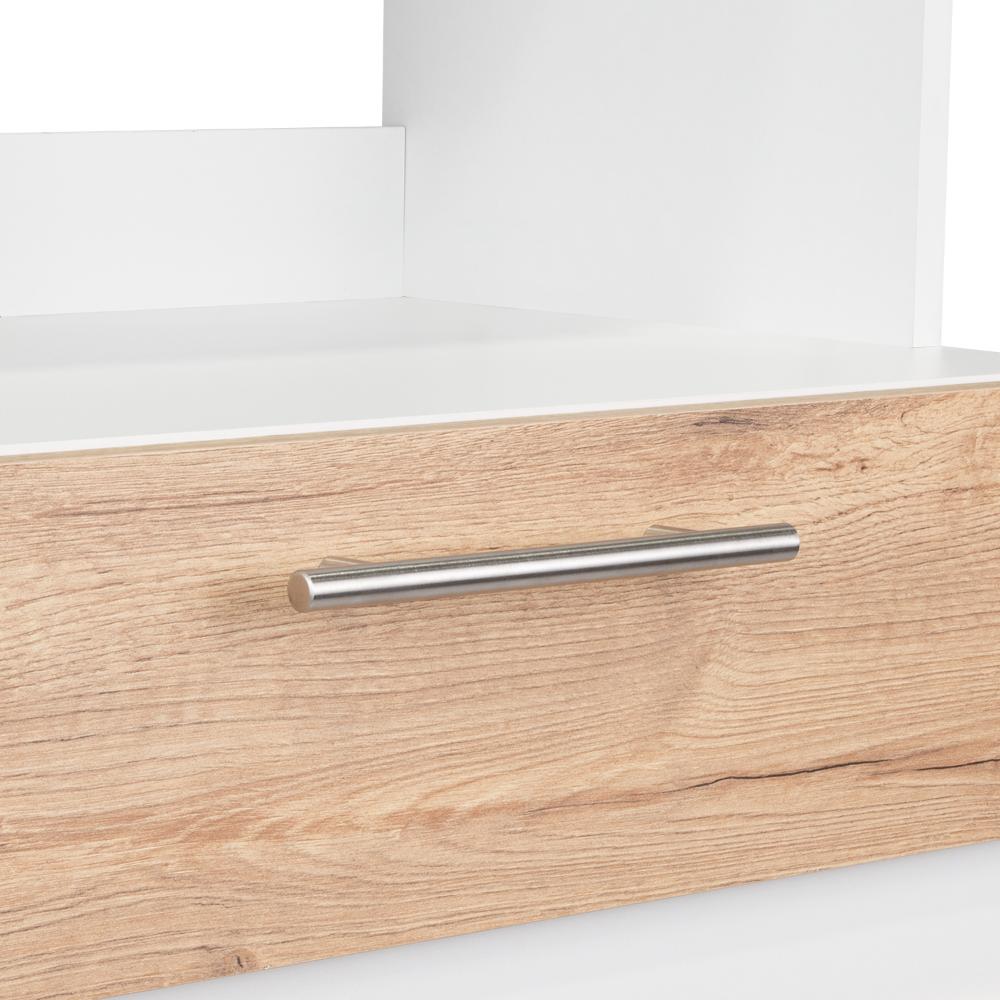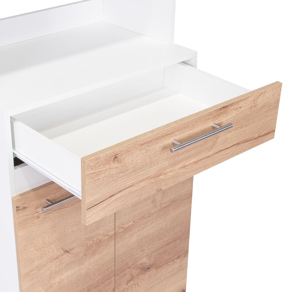 Elaborado en Madera aglomerada MDP, recubierta con láminas melamínicas de excelente calidad, en color Café Claro y Blanco.
