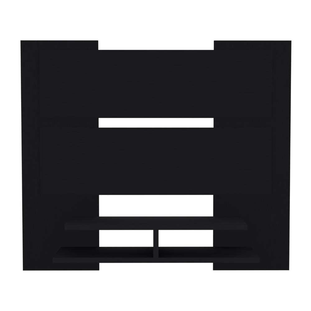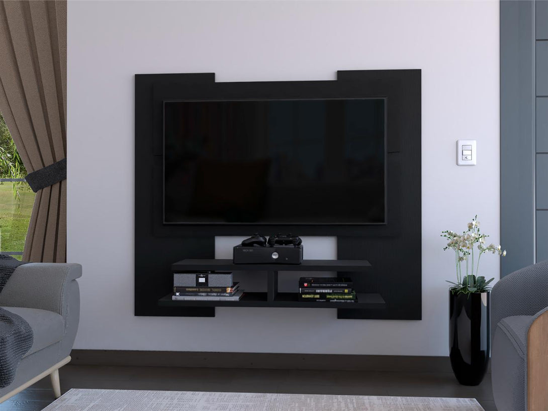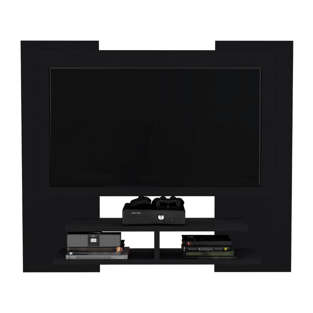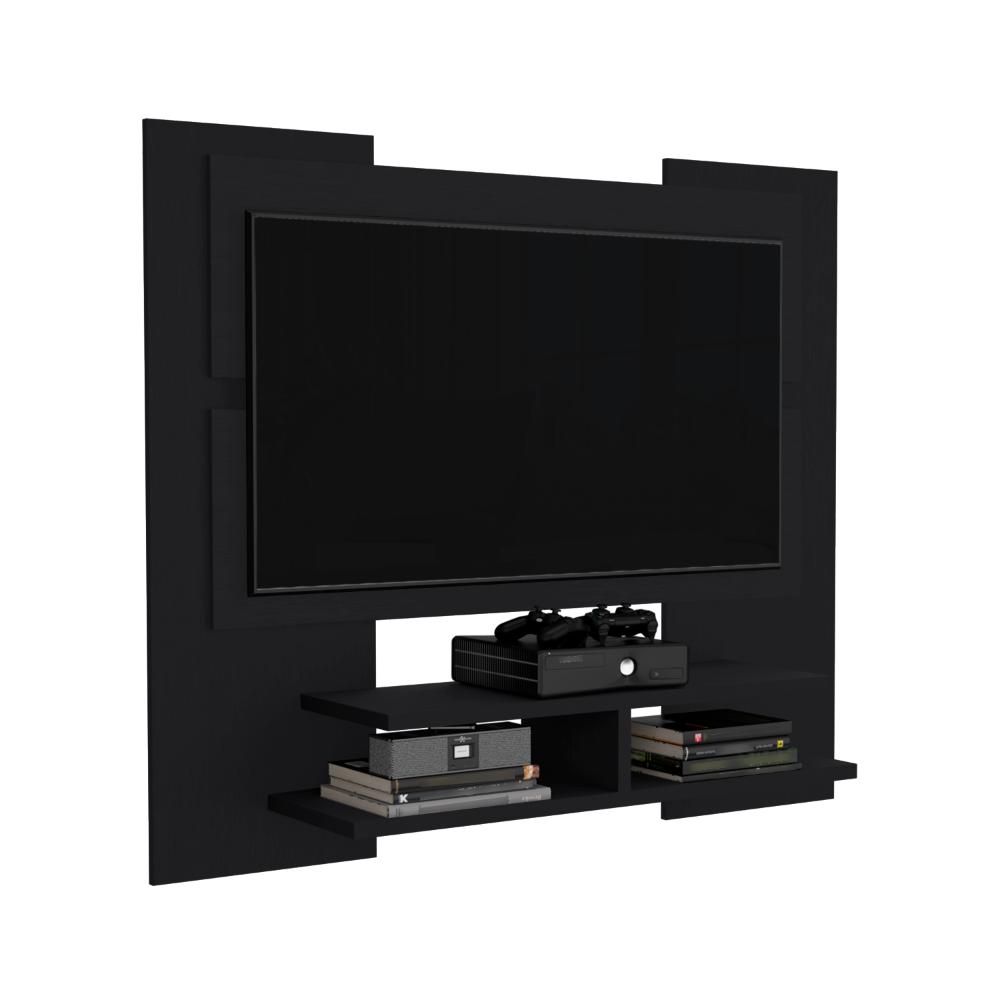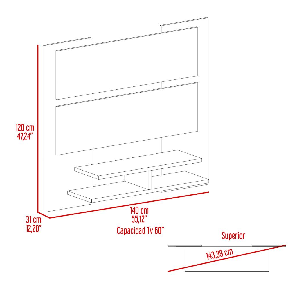 Panel de TV, con espacio para televisor de hasta 60”, diseño moderno con entrepaños y superficies para ubicar objetos.